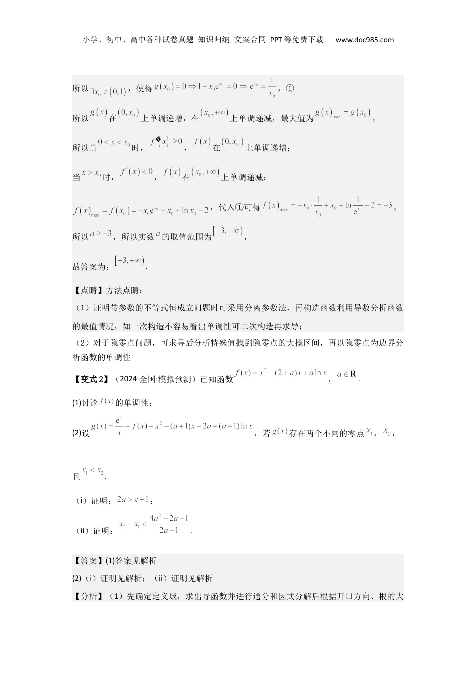 小学、初中、高中各种试卷真题知识归纳文案合同PPT等免费下载www.doc985.com考点21利用导数研究函数的零点(3种核心题型+基础保分练+综合提升练+拓展冲刺练)【考试提醒】函数零点问题在高考中占有很重要的地位,主要涉及判断函数零点的个数或范围.高考常考查三次函数与复合函数的零点问题,以及函数零点与其他知识的交汇问题,一般作为解答题的压轴题出现【核心题型】题型一利用函数性质研究函数的零点利用函性究函的零点,主要是根据函性、奇偶性、最或的符确定数质研数数单调值极值号函零点的,此在求解程中可以通形合的方法确定函存在零点的数个数类问题过过数结数条件.【例题1】(2024·全国·模拟预测)若函数有两个零点,则实数的取值范围是()A.B.C.D.【答案】D【分析】将零点问题切换成函数图像交点,再利用导数研究函数的单调性及参数的取值范围.【详解】法一:设,则函数有两个零点转化为函数的图像与直线有两个交点,因为,当时,;当时,,所以在区间上单调递减,在区间上单调递增,则,当时,;当时,,则,解得,即实数的取值范围是.小学、初中、高中各种试卷真题知识归纳文案合同PPT等免费下载www.doc985.com法二:函数有两个零点可转化为函数的图像与直线有两个交点.因为函数的图像与轴交于点,且函数在点处的切线方程为,所以直线与该切线平行,且该直线与轴交于点,所以点在点上方,即,解得,即实数的取值范围是.故选:D【变式1】(2024·陕西西安·一模)若不等式恒成立,则实数的取值范围为.【答案】【分析】函数不等式恒成立问题与隐零点问题.构造函数,求导后再次构造函数,求导分析的单调性,找到隐零点,并得到,然后再分析的单调性,找到最大值,最后再结合对数的运算求出函数的最大值即可.【详解】不等式移项可得,设,则,设,则恒成立,所以函数在上单调递减,因为,小学、初中、高中各种试卷真题知识归纳文案合同PPT等免费下载www.doc985.com所以,使得,①所以在上单调递增,在上单调递减,最大值为,所以当时,,在上单调递增;当时,,在上单调递减;,代入①可得,所以,所以实数的取值范围为,故答案为:.【点睛】方法点睛:(1)证明带参数的不等式恒成立问题时可采用分离参数法,再构造函数利用导数分析函数的最值情况,如一次构造不容易看出单调性可二次构造再求导;(2)对于隐零点问题,可求导后分析特殊值找到隐零点的大概区间,再以隐零点为边界分析函数的单调性【变式2】(2024·全国·模拟预测)已知函数,.(1)讨论的单调性;(2)设,若存在两个不同的零点,,且.(i)证明:;(ii)证明:.【答案】(1)答案见解析(2)(i)证明见解析;(ii)证明见解析【分析】(1)先确定定义域,求出导函数并进行通分和因式分解后根据开口方向、根的大小学、初中、高中各种试卷真题知识归纳文案合同PPT等免费下载www.doc985.com小关系、根与定义域的位置关系等信息进行分类讨论得出导数正负情况,从而得出函数的单调性.(2)考查用导数研究函数零点问题,(i)用导数研究函数的单调性和最值情况,确保函数零点个数为2即可证明;(ii)根据零点的分布和大小情况进行考虑入手即可.【详解】(1)由题的定义域为,,①若,则,当时,;当时,,所以在上单调递减,在上单调递增.②若,令,得,.当时,,当或时,;当时,,所以在上单调递增,在上单调递减;当时,,当或时,;当时,,所以在,上单调递增,在上单调递减;当时,,当且仅当时等号成立,所以在上单调递增.(2)(i)由题意知,小学、初中、高中各种试卷真题知识归纳文案合同PPT等免费下载www.doc985.com所以,当时,;当时,,所以在上单调递减,在上单调递增,则,因为函数存在两个不同的零点,故,即.(ii)下面找出两个点,,使得,,注意到,且,于是考虑找点,,下面我们证明:,,①,设,下证,方法1:设,则,故,所以在上单调递增,得,所以在上单调递增,故,即,因此,设,则,所以在上单调递增,所以,因此,又,故,即,又,所以.小学、初中、高中各种试卷真题知识归纳文案合同PPT等免费下载www.doc985.com方法2:易知,设,则,所以在上单调递增,得,所以在上单调...