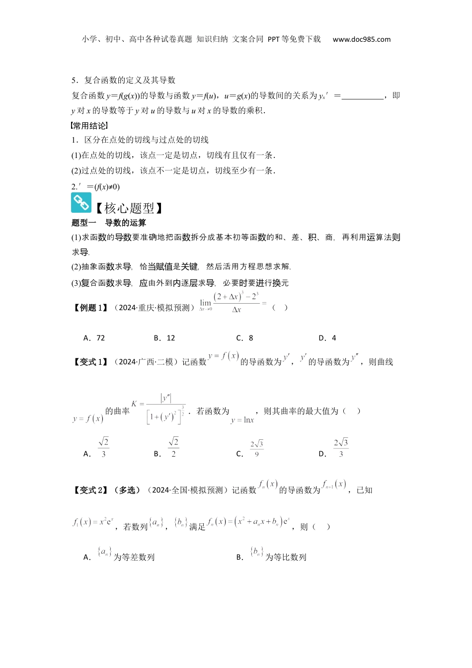 小学、初中、高中各种试卷真题知识归纳文案合同PPT等免费下载www.doc985.com考点16导数的概念及其意义、导数的运算(3种核心题型+基础保分练+综合提升练+拓展冲刺练)【考试提醒】1.了解导数的概念、掌握基本初等函数的导数.2.通过函数图象,理解导数的几何意义.3.能够用导数公式和导数的运算法则求简单函数的导数,能求简单的复合函数(形如f(ax+b))的导数【知识点】1.导数的概念(1)函数y=f(x)在x=x0处的导数记作或.f′(x0)=lim=.(2)函数y=f(x)的导函数(简称导数)f′(x)=y′=lim.2.导数的几何意义函数y=f(x)在x=x0处的导数的几何意义就是曲线y=f(x)在点P(x0,f(x0))处的切线的,相应的切线方程为.3.基本初等函数的导数公式基本初等函数导函数f(x)=c(c为常数)f′(x)=______f(x)=xα(α∈R,且α≠0)f′(x)=______f(x)=sinxf′(x)=______f(x)=cosxf′(x)=______f(x)=ax(a>0,且a≠1)f′(x)=______f(x)=exf′(x)=______f(x)=logax(a>0,且a≠1)f′(x)=______f(x)=lnxf′(x)=_____4.导数的运算法则若f′(x),g′(x)存在,则有[f(x)±g(x)]′=;[f(x)g(x)]′=;′=(g(x)≠0);[cf(x)]′=.小学、初中、高中各种试卷真题知识归纳文案合同PPT等免费下载www.doc985.com5.复合函数的定义及其导数复合函数y=f(g(x))的导数与函数y=f(u),u=g(x)的导数间的关系为yx′=,即y对x的导数等于y对u的导数与u对x的导数的乘积.常用结论1.区分在点处的切线与过点处的切线(1)在点处的切线,该点一定是切点,切线有且仅有一条.(2)过点处的切线,该点不一定是切点,切线至少有一条.2.′=(f(x)≠0)【核心题型】题型一导数的运算(1)求函的要准确地把函拆分成基本初等函的和、差、、商,再利用算法数导数数数积运则求.导(2)抽象函求,恰是,然后活用方程思想求解.数导当赋值关键(3)合函求,由外到逐求,必要要行元复数导应内层导时进换【例题1】(2024·重庆·模拟预测)()A.72B.12C.8D.4【变式1】(2024·广西·二模)记函数的导函数为,的导函数为,则曲线的曲率.若函数为,则其曲率的最大值为()A.B.C.D.【变式2】(多选)(2024·全国·模拟预测)记函数的导函数为,已知,若数列,满足,则()A.为等差数列B.为等比数列小学、初中、高中各种试卷真题知识归纳文案合同PPT等免费下载www.doc985.comC.D.【变式3】(2023·全国·模拟预测)已知函数,则()A.12B.10C.8D.6题型二导数的几何意义(1)理切有的,是根据曲、切、切点的三系列出的方程:处与线关问题关键线线个关参数①切点的是切的斜率;处导数线②切点在切上;线③切点在曲上.线(2)注意分区“在点P的切处线”与“点过P的切线”.命题点1求切线方程【例题2】(多选)(2024·河南郑州·模拟预测)过点作直线l与函数的图象相切,则()A.若P与原点重合,则l方程为B.若l与直线垂直,则C.若点P在的图象上,则符合条件的l只有1条D.若符合条件的l有3条,则【变式1】(2024·贵州·模拟预测)过点作曲线的切线,请写出切线的方程.【变式2】(2024·山西吕梁·二模)若曲线在点处的切线过原点,则.【变式3】(2024·四川成都·二模)已知函数的图象在处的切线经过小学、初中、高中各种试卷真题知识归纳文案合同PPT等免费下载www.doc985.com点.(1)求的值及函数的单调区间;(2)若关于的不等式在区间上恒成立,求正实数的取值范围.命题点2求参数的值(范围)【例题3】(2024·内蒙古呼伦贝尔·二模)已知曲线在处的切线与直线垂直,则()A.3B.C.7D.【变式1】(2024·全国·模拟预测)若直线与曲线相切,则的最小值为()A.B.-2C.-1D.0【变式2】(2024·全国·模拟预测)曲线在处的切线与曲线相切于点,若且,则实数的值为.【变式3】(2024·全国·模拟预测)已知函数,且曲线在点处的切线方程为.(1)求实数,的值;小学、初中、高中各种试卷真题知识归纳文案合同PPT等免费下载www.doc985.com(2)证明:函数有两个零点.题型三两曲线的公切线公切,根据函在切点的斜率相等,且切点在切上又在曲上,列出线问题应两个数处既线线有切点坐的方程,通解方程求解.或者分求出函的...