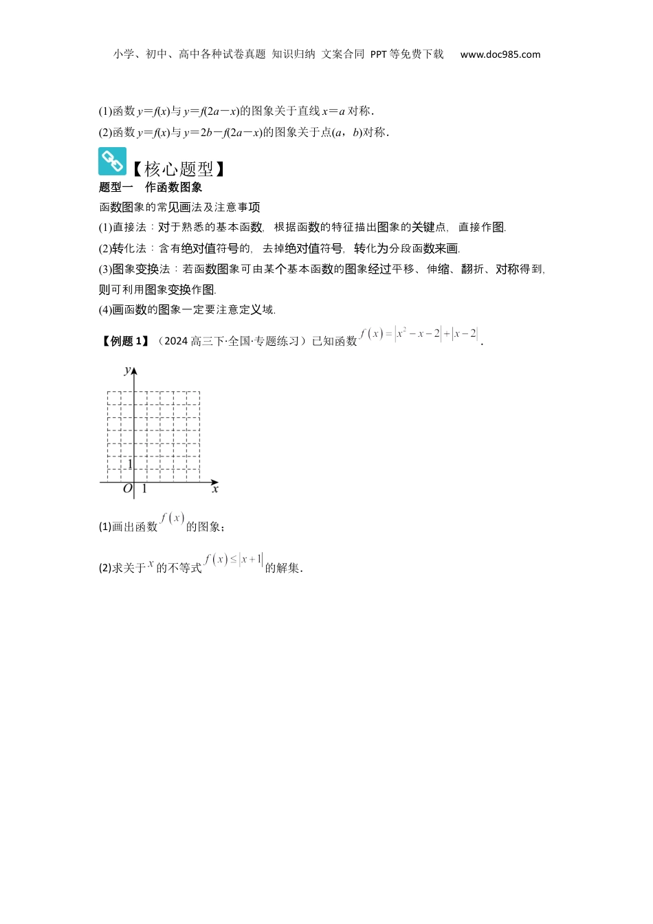 小学、初中、高中各种试卷真题知识归纳文案合同PPT等免费下载www.doc985.com考点13函数的图像(3种核心题型+基础保分练+综合提升练+拓展冲刺练)【考试提醒】1.在实际情境中,会根据不同的需要选择恰当的方法(如图象法、列表法、解析法)表示函数.2.会画简单的函数图象.3.会运用函数图象研究函数的性质,解决方程解的个数与不等式解的问题.【知识点】1.利用描点法作函数图象的方法步骤:、、.2.利用图象变换法作函数的图象(1)平移变换(2)对称变换①y=f(x)―――――→y=.②y=f(x)―――――→y=.③y=f(x)―――――→y=.④y=ax(a>0,且a≠1)―――――→y=.(3)翻折变换①y=f(x)―――――――――→y=.②y=f(x)――――――――――→y=.常用结论1.左右平移仅仅是相对x而言的,即发生变化的只是x本身,利用“左加右减”进行操作.如果x的系数不是1,需要把系数提出来,再进行变换.2.函数图象自身的对称关系(1)若函数y=f(x)的定义域为R,且有f(a+x)=f(b-x),则函数y=f(x)的图象关于直线x=.对称(2)函数y=f(x)的图象关于点(a,b)成中心对称⇔f(a+x)=2b-f(a-x)⇔f(x)=2b-f(2a-x).3.两个函数图象之间的对称关系小学、初中、高中各种试卷真题知识归纳文案合同PPT等免费下载www.doc985.com(1)函数y=f(x)与y=f(2a-x)的图象关于直线x=a对称.(2)函数y=f(x)与y=2b-f(2a-x)的图象关于点(a,b)对称.【核心题型】题型一作函数图象函象的常法及注意事数图见画项(1)直接法:于熟悉的基本函,根据函的特征描出象的点,直接作.对数数图关键图(2)化法:含有符的,去掉符,化分段函.转绝对值号绝对值号转为数来画(3)象法:若函象可由某基本函的象平移、伸、翻折、得到,图变换数图个数图经过缩对称可利用象作.则图变换图(4)函的象一定要注意定域.画数图义【例题1】(2024高三下·全国·专题练习)已知函数.(1)画出函数的图象;(2)求关于的不等式的解集.小学、初中、高中各种试卷真题知识归纳文案合同PPT等免费下载www.doc985.com【变式1】(2024·陕西西安·二模)设函数.(1)在坐标系中画出函数的图象;(2)若对任意恒成立,求的取值范围.【变式2】(2024·四川南充·二模)已知函数.(1)当时,画出的图象,并根据图象写出函数的值域;(2)若关于x的不等式有解,求a的取值范围.小学、初中、高中各种试卷真题知识归纳文案合同PPT等免费下载www.doc985.com【变式3】(2024·陕西西安·三模)已知函数(其中).(1)在给定的平面直角坐标系中画出时函数的图象;(2)求函数的图象与直线围成多边形的面积的最大值,并指出面积最大时的值.题型二函数图像的识别函的象的主要方法识别数图(1)利用函的性,如奇偶性、性、定域等判.数质单调义断(2)利用函的零点、点等判.数极值断(3)利用特殊函判.数值断【例题2】(2024·四川成都·三模)函数的图象大致是()小学、初中、高中各种试卷真题知识归纳文案合同PPT等免费下载www.doc985.comA.B.C.D.【变式1】(2024·湖北·模拟预测)函数的图象大致为()A.B.C.D.【变式2】(2024·全国·模拟预测)函数的部分图象为()A.B.C.D.【变式3】(多选)(2024·安徽合肥·一模)函数的图象可能是()小学、初中、高中各种试卷真题知识归纳文案合同PPT等免费下载www.doc985.comA.B.C.D.题型三函数图象的应用含的不等式,行分,常的分有对参应对参数进类讨论见类(1)根据二次系正、及零行分.项数为负进类(2)根据判式别Δ与0的系判根的.关断个数(3)有根,有需根据根的大小行.两个时时还两进讨论不等式不能用代法求解或用代法求解比困,但其函的象可作出当问题数数较难对应数图时常不等式化象的位置系,而利用形合思想求解.将问题转为图关问题从数结命题点1利用图象研究函数的性质【例题3】(2023·贵州·模拟预测)已知函数,下列结论正确的是()A.是偶函数B.在上单调递增C.的图象关于直线对称D.的图象与轴围成的三角形面积为2【变式1】(2022·重庆沙坪坝·模拟预测)若函数为奇函数,且在单调递减,则下列函数在一定单调递增的是()小学、初中、高中各种试卷真题知识归纳文案合同PPT等免...