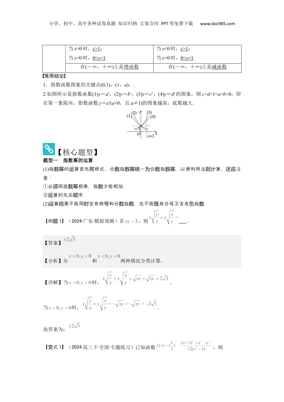 小学、初中、高中各种试卷真题知识归纳文案合同PPT等免费下载www.doc985.com考点11指数与指数函数(3种核心题型+基础保分练+综合提升练+拓展冲刺练)【考试提醒】1.理解有理数指数幂的含义,了解实数指数幂的意义,掌握指数幂的运算性质.2.通过实例,了解指数函数的实际意义,会画指数函数的图象.3.理解指数函数的单调性、特殊点等性质,并能简单应用.【知识点】1.根式(1)一般地,如果xn=a,那么x叫做a的n次方根,其中n>1,且n∈N*.(2)式子叫做根式,这里n叫做根指数,a叫做被开方数.(3)()n=a.当n为奇数时,=a,当n为偶数时,=|a|=2.分数指数幂正数的正分数指数幂:=(a>0,m,n∈N*,n>1).正数的负分数指数幂:==(a>0,m,n∈N*,n>1).0的正分数指数幂等于0,0的负分数指数幂没有意义.3.指数幂的运算性质aras=ar+s;(ar)s=ars;(ab)r=arbr(a>0,b>0,r,s∈Q).4.指数函数及其性质(1)概念:一般地,函数y=ax(a>0,且a≠1)叫做指数函数,其中指数x是自变量,定义域是R.(2)指数函数的图象与性质a>10<a<1图象定义域R值域(0,+∞)性质过定点(0,1),即x=0时,y=1小学、初中、高中各种试卷真题知识归纳文案合同PPT等免费下载www.doc985.com当x>0时,y>1;当x<0时,0<y<1当x<0时,y>1;当x>0时,0<y<1在(-∞,+∞)上是增函数在(-∞,+∞)上是减函数常用结论1.指数函数图象的关键点(0,1),(1,a),.2.如图所示是指数函数(1)y=ax,(2)y=bx,(3)y=cx,(4)y=dx的图象,则c>d>1>a>b>0,即在第一象限内,指数函数y=ax(a>0,且a≠1)的图象越高,底数越大.【核心题型】题型一指数幂的运算(1)指的算首先根式、分指一分指,以便利用法算,注数幂运将数数幂统为数数幂则计还应意:①必同底相乘,指才能相加.须数幂数②算的先后序.运顺(2)算果不能同含有根和分指,也不能有分母又含有指.运结时号数数既负数【例题1】(2024·广东·模拟预测)若,则.【答案】【分析】分和两种情况分类计算.【详解】当时,,当时,.故答案为:【式变1】(2024高三下·全国·专题练习)已知函数,则小学、初中、高中各种试卷真题知识归纳文案合同PPT等免费下载www.doc985.com.【答案】6【分析】根据函数奇偶性的定义可判断为奇函数,即可得,进而根据指数幂的运算即可求解.【详解】函数,设,令,则,,又,,,.故答案为:6.【式变2】(2024·全国·模拟预测)已知函数则.【答案】/【分析】直接代入分段函数求函数值即可.【详解】由题意得.小学、初中、高中各种试卷真题知识归纳文案合同PPT等免费下载www.doc985.com故答案为:.【式变3】(2024高三·全国·专题练习)化简下列各式:(1)=(2)(=(3设,则的值为【答案】0/7【分析】(1)根据指数幂的运算性质,化简求值,即得答案;(2)将根式化为指数幂的形式,结合指数幂的运算,即可求得答案;(3)将平方,即可求得答案.【详解】(1).(2);小学、初中、高中各种试卷真题知识归纳文案合同PPT等免费下载www.doc985.com(3)因为,.故答案为:(1)0;(2);(3)7题型二指数函数的图象及应用于有指型函的象,一般是最基本的指函的象入手,通平移、伸对关数数图问题从数数图过、得到.特地,底缩对称变换别当数a与1的大小系不确定注意分.关时应类讨论【例题2】(2024高三·全国·专题练习)在同一平面直角坐标系中,函数y=,y=loga(x+)(a>0,且a≠1)的图象可能是()A.B.C.D.【答案】D【解析】略【式变1】(23-24高三下·江西·开学考试)函数的图象大致为()A.B.小学、初中、高中各种试卷真题知识归纳文案合同PPT等免费下载www.doc985.comC.D.【答案】A【分析】由奇函数性质以及指数函数单调性即可判断.【详解】,且函数定义域为,关于原点对称,所以为奇函数,排除CD.当时,,所以,排除B,经检验A选项符合题意.故选:A.【式变2】(23-24高三上·山东潍坊·期中)已知指数函数,对数函数的图象如图所示,则下列关系成立的是()A.B.C.D.【答案】B【分析】根据题意,由指数函数以及对数函数的单调性即可得到的范围,从而得到结果.【详解】由图象可得,指数函数为减函数,对数函数为增函...