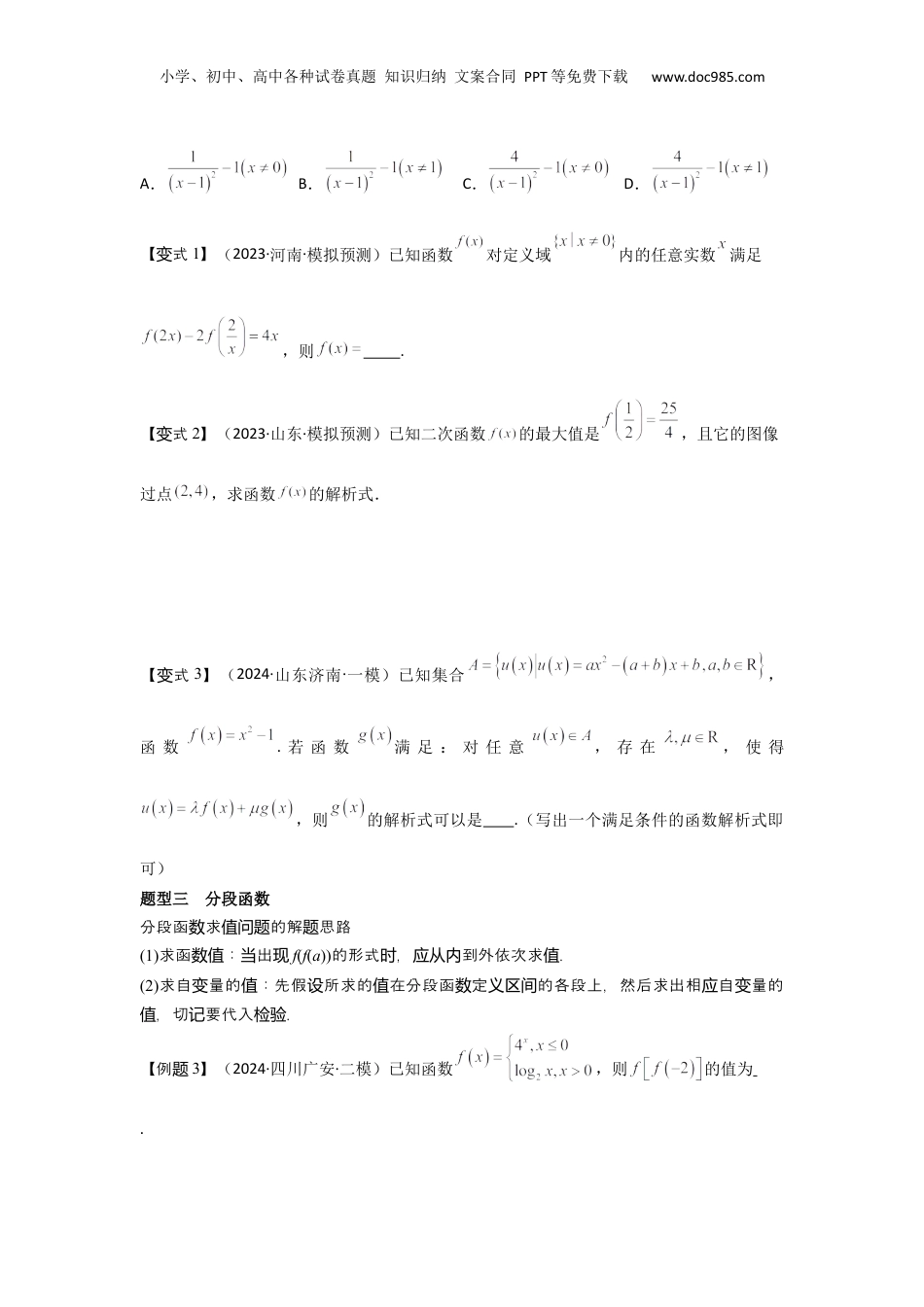 小学、初中、高中各种试卷真题知识归纳文案合同PPT等免费下载www.doc985.com考点06函数的概念及其表示(3种核心题型+基础保分练+综合提升练+拓展冲刺练)【考试提醒】1.了解函数的含义.2.在实际情境中,会根据不同的需要选择恰当的方法(如图象法、列表法、解析法)表示函数.3.了解简单的分段函数,并会简单的应用.【知识点】1.函数的概念一般地,设A,B是,如果对于集合A中的一个数x,按照某种确定的对应关系f,在集合B中都有的数y和它对应,那么就称f:A→B为从集合A到集合B的一个函数,记作y=f(x),x∈A.2.函数的三要素(1)函数的三要素:、、.(2)如果两个函数的相同,并且完全一致,则这两个函数为同一个函数.3.函数的表示法表示函数的常用方法有、图象法和.4.分段函数若函数在其定义域的不同子集上,因对应关系不同而分别用几个不同的式子来表示,这种函数称为分段函数.常用结论1.直线x=a与函数y=f(x)的图象至多有1个交点.2.在函数的定义中,非空数集A,B,A即为函数的定义域,值域为B的子集.3.分段函数虽由几个部分组成,但它表示的是一个函数.分段函数的定义域等于各段函数的定义域的并集,值域等于各段函数的值域的并集.【核心题型】题型一函数的定义域(1)无抽象函的形式如何,已知定域是求定域,均是指其中的论数义还义x的取集合;值(2)若已知函数f(x)的定域义为[a,b],合函则复数f(g(x))的定域由不等式义a≤g(x)≤b求出;(3)若合函复数f(g(x))的定域义为[a,b],函则数f(x)的定域义为g(x)在[a,b]上的域.值小学、初中、高中各种试卷真题知识归纳文案合同PPT等免费下载www.doc985.com【例题1】(2024高三·全国·专题练习)已知集合,,则()A.B.C.D.【式变1】(2023·河北衡水·模拟预测)已知函数的定义域为,则函数的定义域是()A.B.C.D.【式变2】(2024·全国·模拟预测)若集合,,则集合的真子集的个数为()A.0B.1C.2D.3【式变3】(2023·江苏镇江·模拟预测)若函数的定义域为,则的定义域为()A.B.C.D.题型二函数的解析式函解析式的求法数(1)配法;凑(2)待定系法;数(3)元法;换(4)解方程法.组【例题2】(2023·重庆·模拟预测)已知函数,则()小学、初中、高中各种试卷真题知识归纳文案合同PPT等免费下载www.doc985.comA.B.C.D.【式变1】(2023·河南·模拟预测)已知函数对定义域内的任意实数满足,则.【式变2】(2023·山东·模拟预测)已知二次函数的最大值是,且它的图像过点,求函数的解析式.【式变3】(2024·山东济南·一模)已知集合,函数.若函数满足:对任意,存在,使得,则的解析式可以是.(写出一个满足条件的函数解析式即可)题型三分段函数分段函求的解思路数值问题题(1)求函:出数值当现f(f(a))的形式,到外依次求.时应从内值(2)求自量的:先假所求的在分段函定的各段上,然后求出相自量的变值设值数义区间应变,切要代入.值记检验【例题3】(2024·四川广安·二模)已知函数,则的值为.小学、初中、高中各种试卷真题知识归纳文案合同PPT等免费下载www.doc985.com【式变1】(2024·广东深圳·模拟预测)已知函数,若,使得成立,则实数m的取值范围为()A.B.C.D.【式变2】(2024·陕西西安·三模)已知函数,则()A.8B.12C.16D.24【式变3】(23-24高三下·内蒙古赤峰·开学考试)已知函数的最小值为-1,则.【课后强化】基础保分练一、单选题1.(2024·陕西西安·一模)已知全集,集合,,则().A.B.C.D.2.(2024·山西运城·一模)已知符号函数则函数小学、初中、高中各种试卷真题知识归纳文案合同PPT等免费下载www.doc985.com的图象大致为()A.B.C.D.3.(2023·四川成都·模拟预测)给出下列个函数,其中对于任意均成立的是()A.B.C.D.4.(2024·全国·模拟预测)已知集合,,则()A.B.C.D.二、多选题5.(23-24高三下·河南·阶段练习)已知非常数函数的定义域为,且,则()A.B.或C.是上的增函数D.是上的增函数6.(2023·江苏连云港·模拟预测)已知函数,若关于的方程小学、初中、高中各种试卷真题知识归纳文案合同PPT等免费下载www.doc985.com恰...