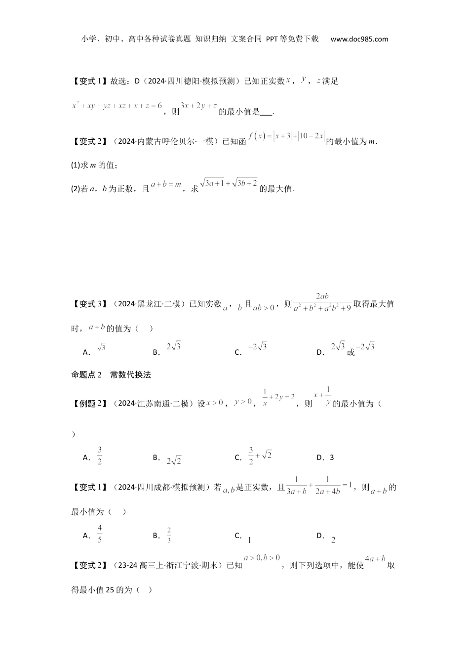 小学、初中、高中各种试卷真题知识归纳文案合同PPT等免费下载www.doc985.com考点04基本不等式(3种核心题型+基础保分练+综合提升练+拓展冲刺练)【考试提醒】1.了解基本不等式的推导过程.2.会用基本不等式解决简单的最值问题.3.理解基本不等式在实际问题中的应用.【知识点】1.基本不等式:≤(1)基本不等式成立的条件:.(2)等号成立的条件:当且仅当时,等号成立.(3)其中叫做正数a,b的算术平均数,叫做正数a,b的几何平均数.2.几个重要的不等式(1)a2+b2≥(a,b∈R).(2)+≥(a,b同号).(3)ab≤(a,b∈R).(4)≥(a,b∈R).以上不等式等号成立的条件均为a=b.3.利用基本不等式求最值(1)已知x,y都是正数,如果积xy等于定值P,那么当x=y时,和x+y有最小值.(2)已知x,y都是正数,如果和x+y等于定值S,那么当x=y时,积xy有最大值.注意:利用基本不等式求最值应满足三个条件“一正、二定、三相等”.【核心题型】题型一利用基本不等式求最值(1)前提:“一正”“二定”“三相等”.(2)要根据式子的特征活形,配出、和常的形式,然后再利用基本不等式.灵变凑积为数(3)件最的求解通常有三方法:一是配法;二是件活形,利用常条值种凑将条灵变数“1”代的方法;三是消元法.换命题点1配凑法【例题1】(2024·辽宁·一模)已知,则的最小值为()A.B.C.D.小学、初中、高中各种试卷真题知识归纳文案合同PPT等免费下载www.doc985.com【变式1】故选:D(2024·四川德阳·模拟预测)已知正实数,,满足,则的最小值是.【变式2】(2024·内蒙古呼伦贝尔·一模)已知函的最小值为m.(1)求m的值;(2)若a,b为正数,且,求的最大值.【变式3】(2024·黑龙江·二模)已知实数,且,则取得最大值时,的值为()A.B.C.D.或命题点2常数代换法【例题2】(2024·江苏南通·二模)设,,,则的最小值为()A.B.C.D.3【变式1】(2024·四川成都·模拟预测)若是正实数,且,则的最小值为()A.B.C.D.【变式2】(23-24高三上·浙江宁波·期末)已知,则下列选项中,能使取得最小值25的为()小学、初中、高中各种试卷真题知识归纳文案合同PPT等免费下载www.doc985.comA.B.C.D.【变式3】(2024·全国·模拟预测)设正实数a,b满足,则的最小值为()A.B.C.D.命题点3消元法【例题3】(2024·全国·模拟预测)已知,且,则的最小值为()A.B.C.D.【变式1】(2023·重庆·模拟预测)已知,,且,则的最小值为().A.4B.6C.8D.12【变式2】(2023·烟台模拟)已知x>0,y>0,x+3y+xy=9,则x+3y的最小值为________.【变式3】(2024·浙江·模拟预测)已知,求的最小值.题型二基本不等式的常见变形应用小学、初中、高中各种试卷真题知识归纳文案合同PPT等免费下载www.doc985.com基本不等式的常形见变(1)ab≤≤.(2)≤≤≤(a>0,b>0).【例题4】(2023·全国·三模)已知,,且,则下列不等式不正确的是()A.B.C.D.【变式1】(2023·辽宁·二模)数学命题的证明方式有很多种.利用图形证明就是一种方式.现有如图所示图形,在等腰直角三角形中,点O为斜边AB的中点,点D为斜边AB上异于顶点的一个动点,设,,用该图形能证明的不等式为().A.B.C.D.【变式2】(2023·陕西宝鸡·二模)设a,,则“”是“”的()A.充要条件B.必要不充分条件C.充分不必要条件D.既不充分也不必要条件【变式3】(2024·全国·模拟预测)已知正项数列的前项和为,,则下列说法正确的是()A.B.是递减数列小学、初中、高中各种试卷真题知识归纳文案合同PPT等免费下载www.doc985.comC.D.题型三基本不等式的实际应用利用基本不等式求解,要根据,出量,注意量足意实际问题时实际问题设变变应满实际,抽象出目函的表式,建立模型,再利用基本不等式求得函的最.义标数达数学数值【例题5】(2023·湖南岳阳·模拟预测)如图,某人沿围墙修建一个直角梯形花坛,设直角边米,米,若米,问当米时,直角梯形花坛的面积最大.【变式1】(2024·黑龙江哈尔滨·一模)已知某商品近期价格起伏较大,假设第一周和第二周的该商品的单价分别为m元和n元,甲、乙两人购买该商品的方式不同,甲...