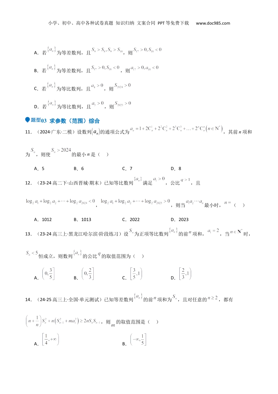 小学、初中、高中各种试卷真题知识归纳文案合同PPT等免费下载www.doc985.com专题23等差、等比数列及其前n项和(六大题型+模拟精练)目录:01等差、等比数列的基本量计算及其性质02比较大小、判断符号03求参数(范围)综合04高考新方向—数列的应用05解答题06数列与统计概率01等差、等比数列的基本量计算及其性质1.(22-23高二下·广西柳州·阶段练习)已知等差数列的前项和为,且,,则()A.B.1C.D.2.(2024·河南周口·模拟预测)设为等差数列的前项和,已知,,则()A.12B.14C.16D.183.(2024·新疆·二模)已知等差数列的前项和为,若,则()A.B.C.D.4.(2024·海南·模拟预测)已知首项为1的等比数列的前项和为Sn,若,则()A.24B.12C.20D.155.(2024·新疆乌鲁木齐·三模)数列{an)是等差数列,是数列{an)的前项和,是正整数,甲:小学、初中、高中各种试卷真题知识归纳文案合同PPT等免费下载www.doc985.com,乙:,则甲是乙的()A.充分不必要条件B.必要不充分条件C.充要条件D.既不充分也不必要条件6.(22-23高三上·贵州黔东南·开学考试)已知数列满足,且对任意的,都有,则该数列的前10项和()A.32B.150C.185D.2507.(2025·广东·一模)已知等比数列为递增数列,.记分别为数列的前项和,若,则()A.B.C.D.02比较大小、判断符号8.(2024·新疆·二模)设是等差数列,下列结论中正确的是()A.若a1+a2>0,则a2+a3>0B.若,则C.若0<a1<a2,则a2>❑√a1a3D.若,则(a2−a1)(a4−a1)<09.(2024·湖北·模拟预测)已知数列为等差数列,为等比数列,,则()A.B.C.D.10.(24-25高三上·湖北武汉·开学考试)已知数列的前项和为,则()小学、初中、高中各种试卷真题知识归纳文案合同PPT等免费下载www.doc985.comA.若为等差数列,且,则B.若为等差数列,且,则C.若为等比数列,且,则D.若为等比数列,且,则03求参数(范围)综合11.(2024·广东·二模)设数列{an)的通项公式为,其前n项和为,则使的最小n是()A.5B.6C.7D.812.(23-24高二下·山西晋城·期末)已知等比数列满足,公比,且,,则当最小时,()A.1012B.1013C.2022D.202313.(23-24高三上·黑龙江哈尔滨·阶段练习)设为正项等比数列的前项和,,当时,恒成立,则数列的公比的取值范围为()A.B.C.D.14.(24-25高三上·全国·单元测试)已知等差数列的前项和为,且对任意的,都有,则的取值范围是()A.B.小学、初中、高中各种试卷真题知识归纳文案合同PPT等免费下载www.doc985.comC.D.15.(2024·河南濮阳·模拟预测)已知是递增的等比数列,且,等差数列满足,,.设m为正整数,且对任意的,,则m的最小值为()A.8B.7C.5D.404数列的应用16.(23-24高三下·重庆渝中·阶段练习)中国载人航天工程发射的第十八艘飞船,简称“神十八”,于2024年4月执行载人航天飞行任务.运送“神十八”的长征二号运载火箭,在点火第一秒钟通过的路程为,以后每秒钟通过的路程都增加,在达到离地面的高度时,火箭开始进入转弯程序.则从点火到进入转弯程序大约需要的时间是()秒.A.10B.11C.12D.1317.(2024·湖南·二模)张扬的父亲经营着一家童鞋店,该店提供从25码到36.5码的童鞋,尺寸之间按0.5码为公差排列成等差数列.有一天,张扬帮助他的父亲整理某一型号的童鞋,以便确定哪些尺寸需要进货,张扬在进货单上标记了两个缺货尺寸.几天后,张扬的父亲询问那些缺货尺寸是哪些,但张扬无法找到标记缺货尺寸的进货单,他只记得其中一个尺寸是28.5码,并且在当时将所有有货尺寸加起来的总和是677码.现在问题是,另外一个缺货尺寸是()A.28码B.29.5码C.32.5码D.34码18.(2024·辽宁·模拟预测)2024年春节前夕,某商城针对顾客举办了一次“购物送春联”的促销活动,活动规则如下:将一天内购物不少于800元的顾客按购物顺序从1开始依次编号,编号能被3除余1,也能被4除余1的顾客可以获得春联1对,否则不能获得春联.若某天符合条件的顾客共有2000人,则恰好获得1对春联的人数为()A.167B.168C.169D.17019.(22-23高三上·江...