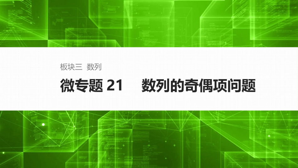 板块三数列微专题21数列的奇偶项问题高考定位有关数列的奇偶项问题是高考中经常涉及的问题,解决此类问题的关键在于搞清数列奇数项和偶数项的首项、项数、公差(比)等,涉及求通项、求和等.(1)求通项公式常用的方法有:隔项等差、等比数列型:将用2k-1或2k替代n,求出a2k-1,a2k的通项;(2)求数列的前n项和常用的方法有:方法一:分别求出S奇,S偶,利用Sn=S奇+S偶,这种思路本质上是分组求和;方法二:把a2k-1+a2k看作一项,求出S2k,再利用S2k-1=S2k-a2k求出S2k-1,这种思路本质上是并项求和.【真题体验】(2021·新高考Ⅰ卷)已知数列{an}满足a1=1,an+1=an+1,n为奇数,an+2,n为偶数.(1)记bn=a2n,写出b1,b2,并求数列{bn}的通项公式;因为bn=a2n,且a1=1,an+1=an+1,n为奇数,an+2,n为偶数,所以b1=a2=a1+1=2,b2=a4=a3+1=a2+2+1=5.因为bn=a2n,所以bn+1=a2n+2=a2n+1+1=a2n+1+1=a2n+2+1=a2n+3,所以bn+1-bn=a2n+3-a2n=3,所以数列{bn}是以2为首项,3为公差的等差数列,(2)求{an}的前20项和.因为an+1=an+1,n为奇数,an+2,n为偶数,所以k∈N*时,a2k=a2k-1+1=a2k-1+1,即a2k=a2k-1+1,①a2k+1=a2k+2,②a2k+2=a2k+1+1=a2k+1+1,即a2k+2=a2k+1+1,③所以①+②得a2k+1=a2k-1+3,即a2k+1-a2k-1=3,所以数列{an}的奇数项是以1为首项,3为公差的等差数列;②+③得a2k+2=a2k+3,即a2k+2-a2k=3,又a2=2,所以数列{an}的偶数项是以2为首项,3为公差的等差数列.所以数列{an}的前20项和S20=(a1+a3+a5+…+a19)+(a2+a4+a6+…+a20)=10+10×92×3+20+10×92×3=300.【热点突破】精准强化练热点一an+1+an=f(n)或an+1·an=f(n)型热点三通项公式中含有(-1)n型热点突破热点二an=f(n),n为奇数,g(n),n为偶数型热点一an+1+an=f(n)或an+1·an=f(n)型例1(2024·衡水调研)已知数列{an}的前n项和为Sn=n2+4n(n∈N*).(1)求数列{an}的通项公式;由题意得当n=1时,a1=S1=5,当n≥2时,an=Sn-Sn-1=n2+4n-(n-1)2-4(n-1)=2n+3,当n=1时,a1=5,适合上式,故an=2n+3.(2)若数列{cn}满足cn+1+cn=an,且不等式cn+2n2≥0对任意的n∈N*都成立,求c1的取值范围.由(1)知,cn+1+cn=2n+3,当n=1时,c2+c1=5;当n≥2时,cn+cn-1=2(n-1)+3,两式相减得cn+1-cn-1=2(n≥2),∴数列{c2n}是以c2为首项,公差为2的等差数列,数列{c2n-1}是以c1为首项,公差为2的等差数列.当n为偶数时,cn=c2+2×n2-1=n+3-c1;当n为奇数时,cn=c1+2×n+12-1=n-1+c1,∴cn=n-1+c1,n=2k-1,n+3-c1,n=2k.对任意的n∈N*,都有cn+2n2≥0成立,①当n为奇数时,n≥1,cn+2n2=n-1+c1+2n2≥0恒成立,即-c1≤2n2+n-1对n为奇数恒成立,当n=1时,(2n2+n-1)min=2,∴-c1≤2,即c1≥-2;②当n为偶数时,n≥2,cn+2n2=n+3-c1+2n2≥0恒成立,即c1≤2n2+n+3对n为偶数恒成立,当n=2时,(2n2+n+3)min=13,∴c1≤13.综上所述,c1的取值范围是[-2,13].规律方法1.构造隔项等差数列:an+1+an=pn+q(p,q≠0)⇒an+2+an+1=p(n+1)+q⇒两式相减得⇒an+2-an=p;2.构造隔项等比数列:an+1·an=pqn(p,q≠0)⇒an+2·an+1=pqn+1⇒两式相除得⇒an+2an=q.训练1在数列{an}中,已知a1=1,an·an+1=12n,记Sn为{an}的前n项和,bn=a2n+a2n-1.(1)判断数列{bn}是否为等比数列,并写出其通项公式; an·an+1=12n,∴an+1·an+2=12n+1,∴an+2an=12,即an+2=12an,∴bn+1bn=a2n+2+a2n+1a2n+a2n-1=12(a2n+a2n-1)a2n+a2n-1=12. a1=1,a1·a2=12,∴a2=12, b1=a2+a1=12+1=32,∴数列{bn}是以32为首项,12为公比的等比数列,∴bn=32·12n-1=32n.(2)求数列{an}的通项公式;由(1)可知an+2=12an,且a1=1,a2=12,∴数列{a2n}...