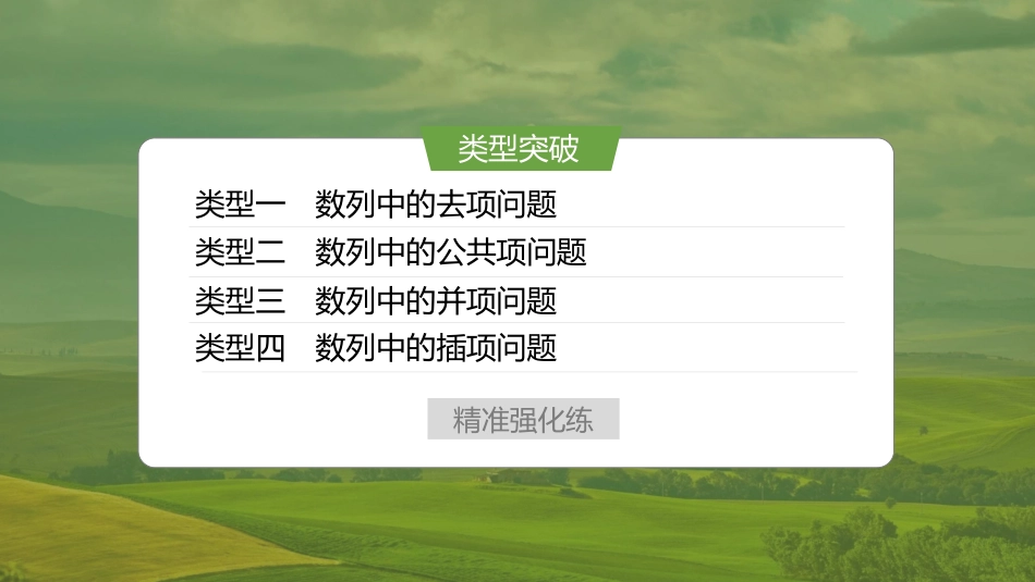 板块三数列提优点7衍生数列问题知识拓展衍生数列是指由已知数列通过插项、去项得到新数列,或由已知的两个数列的公共项得到新数列,解决此类问题要弄清楚衍生数列与已知数列的关系,确定衍生数列的特征,以此来解决问题.精准强化练类型一数列中的去项问题类型二数列中的公共项问题类型三数列中的并项问题类型突破类型四数列中的插项问题例1类型一数列中的去项问题(2024·汕头模拟)已知数列{an}的前n项和是Sn,a1=1,点n,Snn(n∈N*)在斜率为12的直线上,数列{an},{bn}满足a1b1+a2b2+…+anbn=2+(n-1)·2n+1.(1)求数列{an},{bn}的通项公式; 点n,Snn(n∈N*)在斜率为12的直线上,∴Snn-Sn-1n-1=12(n≥2,n∈N*),又S11=a1=1,∴数列Snn是以1为首项,12为公差的等差数列,∴Snn=n+12,∴Sn=n2+n2(n∈N*).当n≥2时,an=Sn-Sn-1=n,当n=1时,a1=1满足上式,∴an=n(n∈N*). 数列{an},{bn}满足a1b1+a2b2+…+anbn=2+(n-1)·2n+1,∴当n≥2时,a1b1+a2b2+…+an-1bn-1=2+(n-2)·2n,两式相减,得anbn=n·2n(n≥2),当n=1时,a1b1=2+(1-1)×21+1=2=1×21,满足上式,∴anbn=n·2n(n∈N*).∴b=2n(n∈N*).(2)若数列{an}中去掉和数列{bn}中相同的项后,余下的项按原来的顺序组成数列{cn},且数列{cn}的前n项和为Tn,求T100.设数列{an}的前p项中有数列{bn}的q项,p-q=100,则2q≤p,即2q≤100+q.易得满足2q≤100+q的最大正整数q为6,∴数列{cn}的前100项,由数列{an}中的前106项去掉和数列{bn}中相同的6项得到,∴T100=S106-(2+22+…+26)=(1+106)×1062-2×(1-26)1-2=5545.解答去项问题的易错之处是不能准确确定数列中去掉的项数,或求和时不会采取原数列和减去去掉各项和的方法.易错提醒训练1已知正项数列{an}和{bn},Sn为数列{an}的前n项和,且满足4Sn=a2n+2an,an=2log2bn.(1)求数列{an}和{bn}的通项公式;因为4Sn=a2n+2an,所以n≥2时,4Sn-1=a2n-1+2an-1,两式相减得4an=a2n-a2n-1+2an-2an-1,(an+an-1)(an-an-1-2)=0,因为an>0,所以an-an-1=2,又4a1=a21+2a1,a1>0,所以a1=2,所以an=2+2(n-1)=2n,2n=2log2bn,bn=2n.(2)将数列{an}中与数列{bn}中相同的项剔除后,按从小到大的顺序构成数列{cn},记数列{cn}的前n项和为Tn,求T100.根据(1)的结论,数列{bn}的前8项依次为:2,4,8,16,32,64,128,256对应数列{an}的第1,2,4,8,16,32,64,128项,故数列{cn}的前100项为数列{an}的前107项,剔除数列{bn}的前7项的数列.所以T100=(a1+a2+…+a107)-(b1+b2+…+b7)=107×(2+214)2-2(1-27)1-2=11302.例2类型二数列中的公共项问题(2024·西安调研)已知数列{an}的前n项和Sn=3n2+n2,{bn}为等比数列,公比为2,且b1,b2+1,b3为等差数列.(1)求{an}与{bn}的通项公式;由Sn=3n2+n2,当n=1时,a1=S1=2,当n≥2时,an=Sn-Sn-1=3n-1,当n=1时,上式也成立,所以an=3n-1.依题意,b1+b3=2(b2+1),b1+b1·22=2(b1·2+1),解得b1=2,所以bn=2n.(2)把数列{an}和{bn}的公共项由小到大排成的数列记为{cn},求数列{cn}的前n项和Tn.数列{an}和{bn}的公共项从小到大依次为21,23,25,27,…,所以21,23,25,27,…构成首项为2,公比为4的等比数列,所以cn=2×4n-1,则Tn=c1+c2+…+cn=2(1-4n)1-4=23(4n-1).两个等差数列的公共项是等差数列,且公差是两等差数列公差的最小公倍数;两个等比数列的公共项是等比数列,公比是两个等比数列公比的最小公倍数;等差数列与等比数列的公共项所构成的新数列,一般仍为等比数列.规律方法训练2数列{2n-1}和数列{3n-2}的公共项从小到大构成一个新数列{an},数列{bn}满足bn=an2n,则数列{bn}的最大项等于________.74数列{2n-1}和数列{3n-2}的公共项从小到大构成一个新数列为1,7,13,…,该数列是首项为1,公差为6的等差数列,所以an=6n-5,所以bn=6n-52n,因为bn+1-bn=6n+12n+1-6n-52n=11-6n2n+1,所以当n≥2时,bn+1...