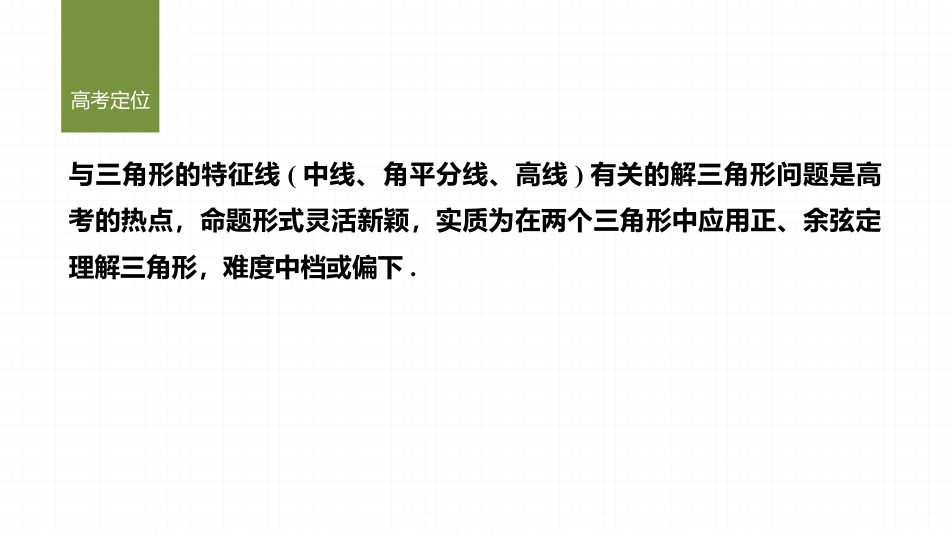 板块二三角函数与平面向量微专题14三角形中的“特征”线高考定位与三角形的特征线(中线、角平分线、高线)有关的解三角形问题是高考的热点,命题形式灵活新颖,实质为在两个三角形中应用正、余弦定理解三角形,难度中档或偏下.【真题体验】真题体验(2023·新高考Ⅱ卷)记△ABC的内角A,B,C的对边分别为a,b,c,已知△ABC面积为3,D为BC的中点,且AD=1.(1)若∠ADC=π3,求tanB;因为D为BC的中点,所以S△ABC=2S△ADC=2·12·AD·DCsin∠ADC=2×12×1·DC·32=3,解得DC=2,所以BD=DC=2,a=4.因为∠ADC=π3,所以∠ADB=2π3.在△ABD中,由余弦定理,得c2=AD2+BD2-2AD·BDcos∠ADB=1+4+2=7,所以c=7.法一在△ADC中,由余弦定理,得b2=AD2+DC2-2AD·DC·cos∠ADC=1+4-2=3,所以b=3.在△ABC中,由余弦定理,得cosB=c2+a2-b22ac=7+16-32×4×7=5714,所以sinB=1-cos2B=2114,所以tanB=sinBcosB=35.法二在△ABD中,由正弦定理,得csin∠ADB=ADsinB,所以sinB=ADsin∠ADBc=2114,又B∈0,π3,所以cosB=1-sin2B=5714,所以tanB=sinBcosB=35.(2)若b2+c2=8,求b,c.法一因为D为BC的中点,所以BD=DC.因为∠ADB+∠ADC=π,所以cos∠ADB=-cos∠ADC,则在△ABD与△ADC中,由余弦定理,得AD2+BD2-c22AD·BD=-AD2+DC2-b22AD·DC,得1+BD2-c2=-(1+BD2-b2),所以2BD2=b2+c2-2=6,所以BD=3,所以a=23.又S△ADC=12×3×1×sin∠ADC=32,得sin∠ADC=1,所以∠ADC=π2,所以b=c=AD2+CD2=2.法二因为D为BC的中点,所以BC=2BD.在△ABD与△ABC中,由余弦定理,得cosB=c2+BD2-AD22c·BD=a2+c2-b22ac,整理,得2BD2=b2+c2-2=6,得BD=3,所以a=23.以下同法一.精准强化练热点一三角形的角平分线热点二三角形的中线热点三三角形的高线热点突破热点一如图,在△ABC中,AD平分∠BAC,∠BAC,∠B,∠C所对的边分别为a,b,c.1.内角平分线定理:AD为△ABC的内角∠BAC的平分线,则ABAC=BDDC.2.因为S△ABD+S△ACD=S△ABC,所以12c·ADsin∠BAC2+12b·ADsin∠BAC2=12bcsin∠BAC,所以(b+c)AD=2bccos∠BAC2,整理得AD=2bccos∠BAC2b+c(角平分线长公式).例1在△ABC中,角A,B,C的对边分别是a,b,c,且2cosC·sinB+π6+cosA=0.(1)求角C的大小;由已知可得2cosC·32sinB+12cosB-cos(B+C)=0,整理得,sinB(3cosC+sinC)=0,因为B∈(0,π),所以sinB≠0,所以3cosC+sinC=0,即tanC=-3,因为C∈(0,π),所以C=2π3.3sinBcosC+cosBcosC-(cosBcosC-sinBsinC)=0,(2)若∠ACB的平分线交AB于点D,且CD=2,BD=2AD,求△ABC的面积.由题意得,ACBC=ADBD=12,即ba=12,所以a=2b.因为S△ACD+S△BCD=S△ABC,所以12×2bsin60°+12×2asin60°=12absin120°,所以b+a=12ab.因为a=2b,所以b=3,a=6,所以S△ABC=12absin120°=932.解决与三角形的角平分线有关问题的方法(1)利用角平分线定理、找边之间的关系;(2)角平分线把三角形分成两个小三角形,故可利用此两个小三角形的面积和为大三角形的面积求解.规律方法训练12(1)(2023·全国甲卷)在△ABC中,∠BAC=60°,AB=2,BC=6,∠BAC的角平分线交BC于D,则AD=________.由余弦定理得cos60°=AC2+4-62×2AC,整理得AC2-2AC-2=0,得AC=1+3.由角平分线长公式得AD=2AB·AC·cos∠BAC2AB+AC=2×2×(1+3)×cos30°3+3=2.(2)(2024·淄博模拟改编)如图,在△ABC中,∠BAC=2π3,∠BAC的角平分线交BC于P点.若AP=2,BC=8,则△ABC的面积为__________________.3+1952△ABC中,设内角A,B,C的对边分别为a,b,c,在△ABC中,由余弦定理得BC2=AB2+AC2-2AB·AC·cos∠CAB,即64=c2+b2+b·c,①由角平分线长公式得AP=2bccos∠BAC2b+c即bc=2(b+c),②联立①②得bc=2+265,所以S△ABC=12bcsin∠BAC=3+1952.热点二三角形的中线1.中线长定理:在△ABC中,AD是边BC上的中线,则AB2+AC2=2(BD2+AD2).推导过程:在△ABD中,cosB=AB2+BD2-AD22AB·BD,在△ABC中,cosB=...