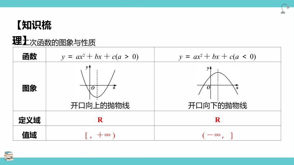 2025年高考数学大一轮复习核心题型讲与练+易错重难点专项突破(新高考版)第05讲一元二次方程、不等式目录易混易错练3常用结论2知识梳理1考点分类练4最新模拟练51.二次函数的图象与性质函数y=ax2+bx+c(a>0)y=ax2+bx+c(a<0)图象开口向上的抛物线开口向下的抛物线定义域RR值域[,+∞)(-∞,]【知识梳理】函数y=ax2+bx+c(a>0)y=ax2+bx+c(a<0)单调性在①上单调递减,在②上单调递增在③上单调递增,在④上单调递减奇偶性当b=0时为偶函数,当b≠0时为非奇非偶函数顶点坐标(-,)对称轴直线x=⑤注意对于函数y=ax2+bx+c,要使它是二次函数,就必须满足a≠0.当题中条件未说明a≠0时,要讨论a=0和a≠0两种情况.2.一元二次不等式把只含有一个未知数,并且未知数的最高次数是__的不等式,称为一元二次不等式,其一般形式为ax2+bx+c>0或________________(a≠0).2ax2+bx+c<03.一元二次不等式的解法步骤(1)将不等式化为右边为零,左边为二次项系数大于零的不等式ax2+bx+c>0(a>0)或ax2+bx+c<0(a>0).(2)求出相应的一元二次方程的根.(3)利用二次函数的图象与x轴的交点确定一元二次不等式的解集.提醒:二次系正的一项数为元二次不等式的解集求法:“大于取,小于取中两边间”.4.一元二次不等式与相应的二次函数及一元二次方程的关系判别式Δ=b2-4acΔ>0Δ=0Δ<0二次函数y=ax2+bx+c(a>0)的图象提醒:解集的端点是方程的根.对应一元二次方程ax2+bx+c=0(a>0)的根有两相异实根x1,x2(x1<x2)有两相等实根x1=x2=-b2a没有实数根ax2+bx+c>0(a>0)的解集_____________________________Rax2+bx+c<0(a>0)的解集_____________∅__{x|x<x1或x>x2}{x|x≠x1}{x|x1<x<x2}∅1.一元二次不等式恒成立问题(1)不等式ax2+bx+c>0(a≠0),x∈R恒成立⇔a>0且Δ<0;(2)不等式ax2+bx+c<0(a≠0),x∈R恒成立⇔a<0且Δ<0.【常用结论】2.简单分式不等式(1)fxgx≥0⇔fxgx≥0,gx≠0;(2)fxgx>0⇔f(x)g(x)>0.3.能成立的化:问题转a>f(x)能成立⇒a>f(x)min;a≤f(x)能成立⇒a≤f(x)max.1.已知集合A={x|ax2+2x+a=0,a∈R},若集合A有且仅有2个子集,则实数a的取值是()A.1B.0,1C.-1,1D.-1,0,1D解析集合A有且仅有2个子集,说明集合A只含有一个元素.集合A={x|ax2+2x+a=0,a∈R},当a=0时,A={0},满足题意.当a≠0时,Δ=4-4a2=0,解得a=±1.当a=1时,集合A={-1},满足题意;当a=-1时,A={1},满足题意.所以a=0或a=±1,故选D.易错点1忽略对参数的分类讨论而致错【易混易错练】2.已知P(m,n)是一次函数y=-12x+12图象上的一个点,且函数y=x2+mx+n的两个零点的平方和等于1,则m+n=()A.3B.1C.1或-错误!D.-1或3B解析 P(m,n)是一次函数y=-12x+12图象上的一个点,∴n=-12m+12,即m+2n=1.设方程x2+mx+n=0的两个不等实根分别为x1,x2,则Δ=m2-4n>0,两实根的平方和为x12+x22=(x1+x2)2-2x1x2=(-m)2-2n=m2-2n=1.∴m=1,n=0或m=-2,n=32(舍去).∴m+n=1,故选B.易错点2忽视一元二次方程有解的条件而致错解析3.若集合A={x|ax2-ax+1<0}=∅,则实数a的取值范围是________________.①若a=0,则1<0不成立,此时不等式ax2-ax+1<0的解集为空集;②若a≠0,则a>0,a2-4a≤0,解得0<a≤4.综上,0≤a≤4.{a|0≤a≤4}易错点3忽略二次项系数的讨论而致错解析4.已知一元二次不等式(m-2)x2+2(m-2)x+4>0的解集为R,则实数m的取值范围是________________. (m-2)x2+2(m-2)x+4>0为一元二次不等式,∴m≠2. 不等式(m-2)x2+2(m-2)x+4>0的解集为R,∴m>2,4(m-2)2-16(m-2)<0,解得2<m<6.∴实数m的取值范围为{m|2<m<6}.{m|2<m<6}易错点4审题不仔细而致错解析5.解不等式:(x2-4x+4)(x2-4x+3)≥0.原不等式可化为x-2≠0,(x-1)(x-3)≥0或x-2=0,解得x≥3或x≤1或x=2.所以原不等式的解集为{x|x≥3或x≤1或x=2}.易错点5随意消项致错解析24.若关于x的不等式3x+ax-1≤1的解集为[-52,1),则实数a的值为()A.-6B....