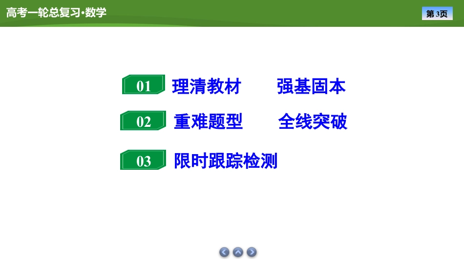 第1页高考一轮总复习•数学第9讲离散型随机变量的分布列、均值与方差第十章统计、排列组合与概率第2页高考一轮总复习•数学复习要点1.通过具体实例,了解离散型随机变量的概念,理解离散型随机变量的分布列.2.通过具体实例,了解超几何分布,并能解决简单的实际问题.3.理解取有限个值的离散型随机变量的均值、方差的概念.4.能计算简单离散型随机变量的均值、方差,并能解决一些简单的实际问题.第3页高考一轮总复习•数学理清教材强基固本01重难题型全线突破02限时跟踪检测03第4页高考一轮总复习•数学理清教材强基固本第5页高考一轮总复习•数学一离散型随机变量随着试验结果变化而变化的变量称为_________,常用字母X,Y,ξ,η,…表示.可能取值为有限个或可以一一列举的随机变量,称为_________________.随机变量离散型随机变量第6页高考一轮总复习•数学二离散型随机变量的分布列及性质1.概念:一般地,若离散型随机变量X的可能取值为x1,x2,…,xn,我们称X取每一个值xi的概率P(X=xi)=pi,i=1,2,…,n为X的______________,简称_________.离散型随机变量的分布列也可以用表格表示(如下表),还可以用图形表示.Xx1x2…xnPp1p2…pn2.离散型随机变量的分布列的性质(1)______________________;(2)_________.概率分布列分布列pi≥0(i=1,2,…,n)∑ni=1pi=1第7页高考一轮总复习•数学三离散型随机变量的均值与方差一般地,若离散型随机变量X的分布列为Xx1x2…xnPp1p2…pn(1)均值称E(X)=_____________________=i=1nxipi为随机变量X的均值或数学期望,数学期望简称期望.它反映了离散型随机变量取值的_________.x1p1+x2p2+…+xnpn平均水平第8页高考一轮总复习•数学(2)方差称D(X)=(x1-E(X))2p1+(x2-E(X))2p2+…+(xn-E(X))2pn=________________为随机变量X的方差,并称DX为随机变量X的_________,记为σ(X).随机变量的方差和标准差都可以度量随机变量取值与其均值的_________.四均值与方差的性质1.E(aX+b)=_________.2.D(aX+b)=_________(a,b为常数).i=1n(xi-E(X))2pi标准差偏离程度aE(X)+ba2D(X)第9页高考一轮总复习•数学常/用/结/论均方差的四常用性值与个质(1)E(k)=k,D(k)=0,其中k常.为数(2)E(X1+X2)=E(X1)+E(X2).(3)D(X)=E(X2)-(E(X))2.如何推导呢?D(X)=i=1n(Xi-E(X))2pi=i=1nX2ipi-2E(X)i=1nxipi+i=1nE2(X)pi=E(X2)-2E2(X)+E2(X)=E(X2)-(E(X))2.(4)若X1,X2相互立,独则E(X1X2)=E(X1)·E(X2).第10页高考一轮总复习•数学1.判断下列结论是否正确.(1)离散型随机变量的各个可能值表示的事件是彼此互斥的.()(2)在离散型随机变量的分布列中,随机变量取各个值的概率之和可以小于1.()(3)若随机变量X的分布列如下,则X服从两点分布.X25P0.30.7()(4)随机变量的方差或标准差越小,则随机变量偏离均值的平均程度越小.()√√第11页高考一轮总复习•数学2.已知X的分布列为X-101P121316设Y=2X+3,则E(Y)的值为()A.73B.4C.-1D.1解析:E(X)=(-1)×12+0×13+1×16=-13,E(Y)=E(2X+3)=2E(X)+3=-23+3=73.答案解析第12页高考一轮总复习•数学3.(2024·重八中月考庆)设某项试验的成功率是失败率的2倍,用随机变量ξ表示一次试验的成功次数,则P(ξ=0)=()A.0B.13C.12D.23解析:设P(ξ=1)=p,则P(ξ=0)=1-p.依意知,题p=2(1-p),解得p=23,故P(ξ=0)=1-p=13.答案解析第13页高考一轮总复习•数学4.若离散型随机变量X的分布列为X01Pa2a22则X的方差D(X)=________.14第14页高考一轮总复习•数学解析:由a2+a22=1,得a=1或a=-2(舍去).∴X的分布列为X01P1212∴E(X)=0×12+1×12=12,则D(X)=0-122×12+1-122×12=14.第15页高考一轮总复习•数学重难题型全线突破第16页高考一轮总复习•数学题型随机变量的概念典例1写出下列随机变量的可能取值,并说明随机变量所表示的意义.(1)一个袋中装有2个白球和5个黑球,从中任取3个,其中所含白球的个数X;(2)投掷两枚均匀的骰子,所得点数之和为可用有序数对来表示.X,所得点数...