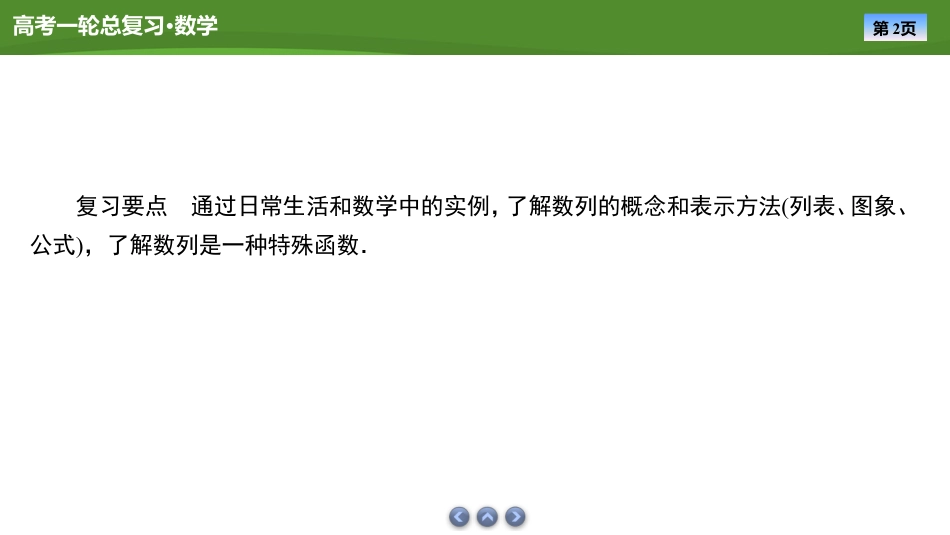第1页高考一轮总复习•数学第1讲数列的概念及简单表示第七章数列第2页高考一轮总复习•数学复习要点通过日常生活和数学中的实例,了解数列的概念和表示方法(列表、图象、公式),了解数列是一种特殊函数.第3页高考一轮总复习•数学理清教材强基固本01重难题型全线突破02限时跟踪检测03第4页高考一轮总复习•数学理清教材强基固本第5页高考一轮总复习•数学一数列的有关概念概念含义数列按照排列的一列数数列的项数列中的数列的通项数列{an}的第n项an通项公式数列{an}的第n项an与n之间的关系能用公式表达,这个公式叫做数列的通项公式前n项和数列{an}中,Sn=叫做数列的前n项和一定顺序每一个数an=f(n)a1+a2+…+an第6页高考一轮总复习•数学二数列的分类分类原则类型满足条件按项数分类有穷数列项数无穷数列项数按项与项间的大小关系分类递增数列an+1an其中n∈N*递减数列an+1an常数列an+1=an按其他标准分类有界数列存在正数M,使|an|≤M摆动数列从第二项起,有些项大于它的前一项,有些项小于它的前一项的数列有限无限><第7页高考一轮总复习•数学三数列的表示方法1.表示方法列表法列表格表达n与an的对应关系图象法把点画在平面直角坐标系中公式法通项公式把数列的通项用表达的方法递推公式使用初始值a1和an+1=f(an)或a1,a2和an+1=f(an,an-1)等表达数列的方法(n,an)公式第8页高考一轮总复习•数学2.数列的函数特征:上面数列的三种表示方法也是函数的表示方法,数列可以看作是定义域为正整数集(或它的有限子集{1,2,…,n})的函数an=f(n),当自变量由小到大依次取值时所对应的一系列四an与Sn的关系若数列{an}的前n项和为Sn,则an=,n=1,,n≥2.函数值S1Sn-Sn-1第9页高考一轮总复习•数学常/用/结/论在列数{an}中,若an最大,则an≥an-1,an≥an+1;若an最小,则an≤an-1,an≤an+1.数列中求最值的方法.第10页高考一轮总复习•数学1.判断下列结论是否正确.(1)1,2,1和1,1,2是同一个数列.()(2)1,1,1,1,…不能构成一个数列.()(3)任何一个数列不是递增数列,就是递减数列.()(4)如果数列{an}的前n项和为Sn,则对任意n∈N*,都有an+1=Sn+1-Sn.()√第11页高考一轮总复习•数学2.已知在数列{an}中,an=-2n2+25n+30(n∈N*),则数列{an}中的最大值是()A.107B.108C.10818D.109解析:由意可题知an=-2n2+25n+30=-2n-2542+10818,由于n∈N*,故当n取距离254最近的正整数6,时an取得最大值108.∴列数{an}中的最大值为a6=108.答案解析第12页高考一轮总复习•数学3.(多选)已知数列的前4项为2,0,2,0,则依此归纳该数列的通项公式可能是()A.an=(-1)n-1+1B.an=2,n为奇数,0,n为偶数C.an=2sinnπ2D.an=cos(n-1)π+1解析:对n=1,2,3,4行,得进验证an=2sinnπ2不合意,其他都可能.题答案解析第13页高考一轮总复习•数学4.中国古代数学有着很多令人惊叹的成就.北宋沈括在《梦溪笔谈》卷十八《技艺》篇中首创隙积术.隙积术意即:将木桶一层层堆放成坛状,每一层长有a个,宽有b个,共计ab个木桶,每一层长、宽各比上一层多一个,共堆放n层.假设最上层有长2、宽1共2个木桶,共堆放15层,则最底层木桶的个数为________.解析:最上有层2,个第2有层(1+1)×(2+1)=2×3(个),第3有层(2+1)×(3+1)=3×4(个),…第15有层15×16=240(个).240第14页高考一轮总复习•数学重难题型全线突破第15页高考一轮总复习•数学题型归纳法求通项公式典例1根据数列的前几项,写出下列各数列的一个通项公式an.(1)-1,7,-13,19,…;(2)12,2,92,8,252,…;(3)4,44,444,4444,…;(4)1,0,13,0,15,0,17,0,…;(5)23,415,635,863,1099,….第16页高考一轮总复习•数学解:(1)符号可通过(-1)n或(-1)n+1调节,其各调节奇偶项的符号变化.项的绝对值的排列规律:后面的数的绝对值总比前面数的绝对值大6,故通项公式为an=(-1)n(6n-5).(2)数列的项有的是分数,有的是整数,可先将各分数型数列常有的结构特点:①分子的变化规律;②分母的变化规律;③分子分母...