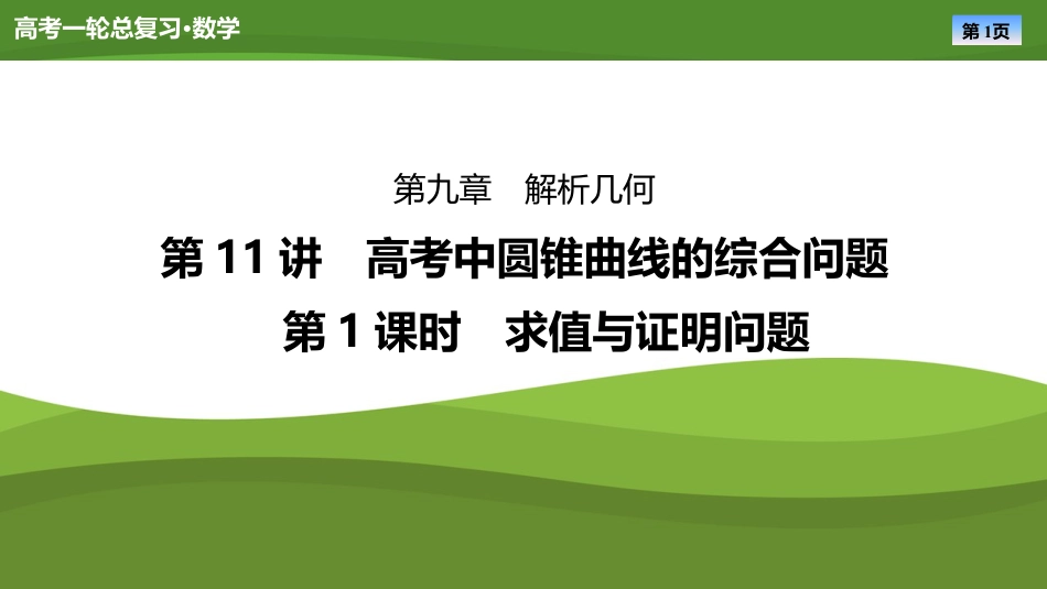 第1页高考一轮总复习•数学第11讲高考中圆锥曲线的综合问题第1课时求值与证明问题第九章解析几何第2页高考一轮总复习•数学重难题型全线突破01限时跟踪检测03第3页高考一轮总复习•数学重难题型全线突破第4页高考一轮总复习•数学题型求值问题典例1(2024·西咸模陕阳拟)已知点P为椭圆E:x2a2+y2b2=1(a>b>0)上的动点,F1,F2分别是椭圆E的左、右焦点,△PF1F2的周长是12,椭圆E上的点到焦点的最短距离是2.(1)求椭圆E的标准方程;(2)过点(2,0)的动直线l与椭圆交于M,Q由△F1MQ知,l的斜率不为0,因此可设l为倒斜截式:x=my+2.两点,求S△F1MQ的最大值及此时l的方程.方法一:需求出弦长|MQ|与F1到l的距离d.方法二:分解△F1MQ的面积:S△F1MQ=S△F1F2M+S△F1F2Q.第5页高考一轮总复习•数学解:(1)由题意得,2a+2c=12,a-c=2,【用结论】椭圆焦点三角形的周长为2a+2c,椭圆上的点到焦点的最短距离是a-c.得a=4,c=2,所以b2=a2-c2=12,所以椭圆E的标准方程是x216+y212=1.(2)设l的方程为x=my+2,M(x1,y1),Q(x2,y2),由x=my+2,x216+y212=1,消去x并整理得关于y的一元二次方程(3m2+4)y2+12my-36=0,Δ=576(m2+1)>0,3m2+4≠0,y1+y2=-12m3m2+4,y1y2=-363m2+4,第6页高考一轮总复习•数学方法一(直接应用弦长公式):|MQ|=1+m2Δ3m2+42=24m2+13m2+4,此式为|y1-y2|,推导如下:设二次方程ay2+by+c=0,则|y1-y2|=y1+y22-4y1y2=-ba2-4ca=b2-4aca2=Δa2.点F1(-2,0)到直线l的距离d=41+m2,所以S△F1MQ=12×|MQ|×d=48m2+13m2+4.令t=m2+1,则t≥1,所以S△F1MQ=48t3t2+1=483t+1t,易知函数y=3t+1t在[1,+∞)上单调递增,所以当t=1时,S△F1MQ取最大值12,此时m=0,直线l的方程为x=2.第7页高考一轮总复习•数学方法二(分解三角形求面积):由题可知点(2,0)即点F2,所以S△F1MQ=S△F1F2M+S△F1F2Q=12×4×|y1|+12×4×|y2|=12×4×|y1-y2|=2|y1-y2|,所以S△F1MQ=2|y1-y2|=2Δ3m2+42=48m2+13m2+4.【会运用】此处应用|y1-y2|=Δ3m2+42简化计算.以下同方法一.第8页高考一轮总复习•数学对点练1(2024·北京四中段阶测试)已知抛物线C:y2=2px(p>0)过点P(1,1).过点0,12作直线l与抛物线C交于不同的两点M,N,过点M作x轴的垂线分别与直线OP,ON交于点A,B,其中O为原点.(1)求抛物线C的标准方程,并求其焦点坐标和准线方程;(2)求|MA||MB|的值.第9页高考一轮总复习•数学解:(1)将点P的坐标代入抛物线C的方程得2p=1,解得p=12,因此抛物线C的标准方程为y2=x.所以抛物线C的焦点坐标为14,0,准线方程为x=-14.(2)由题知,直线l的斜率存在,设直线l的方程为y=kx+12(k≠0),设点M(x1,y1),N(x2,y2),x1≠0,x2≠0.由y=kx+12,y2=x,消去x并整理得2ky2-2y+1=0,Δ=(-2)2-4×2k×1=-4·(2k-1)>0,则k<12且k≠0.第10页高考一轮总复习•数学由根与系数的关系得y1+y2=1k,y1y2=12k.直线OP的方程为y=x,由y=x,x=x1,得点A(x1,x1),直线ON的方程为y=y2x2x,因为y22=x2,所以直线ON的方程为y=1y2x,由y=1y2x,x=x1,得点Bx1,x1y2.又因为M(x1,y1),所以y1+yB-2yA=y1+x1y2-2x1=y1+y21y2-2y21=y1y2+y21-2y21y2y2=y1y1+y2-2y1y2y2=y11k-2×12ky2=0,则y1+x1y2=2x1,因此,A为线段BM的中点,所以|MA||MB|=12.第11页高考一轮总复习•数学题型证明问题典例2已知椭圆C:x2a2+y2b2=1(a>b>0)经过点M1,32,F为椭圆C的右焦点,O为坐标原点,△OFM的面积为34.S△OFM=12×c×32=34⇒c=1.(1)求椭圆C的标准方程;(2)过点P(4,0)作一条斜率不为0的直线与椭圆C相交于A,B两点(A在B,P之间),可采用倒斜截式设法:x=my+4.直线BF与椭圆C的另一个交点为D,求证:点A,D关于x轴对称.第12页高考一轮总复习•数学(1)解:如图,因为△OFM的面积为34,所以12×c×32=34,解得c=1.又M...