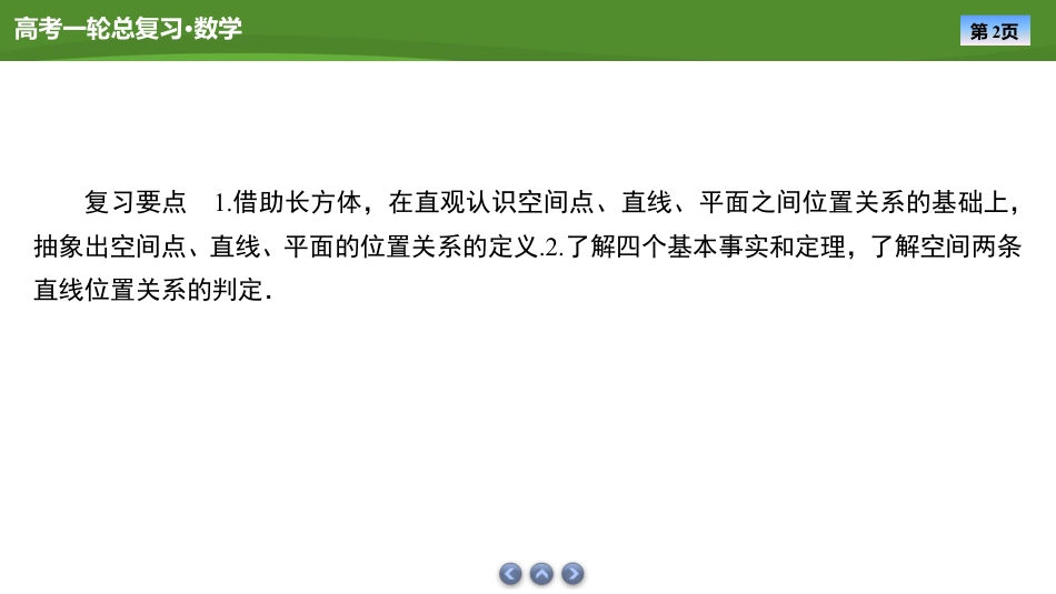 第1页高考一轮总复习•数学第2讲空间点、线、面的位置关系第八章立体几何第2页高考一轮总复习•数学复习要点1.借助长方体,在直观认识空间点、直线、平面之间位置关系的基础上,抽象出空间点、直线、平面的位置关系的定义.2.了解四个基本事实和定理,了解空间两条直线位置关系的判定.第3页高考一轮总复习•数学理清教材强基固本01重难题型全线突破02限时跟踪检测03第4页高考一轮总复习•数学理清教材强基固本第5页高考一轮总复习•数学一平面基本事实1:过的三个点,有且只有一个平面.基本事实2:如果一条直线上的在一个平面内,那么这条直线在这个平面内.基本事实3:如果两个不重合的平面有一个公共点,那么它们有且只有过该点的公共直线.基本事实4:平行于同一条直线的两条直线.不在一条直线上两个点一条平行第6页高考一轮总复习•数学二“三个”推论推论1:经过一条直线和这条直线外一点,有且只有一个平面.推论2:经过两条直线,有且只有一个平面.推论3:经过两条直线,有且只有一个平面.相交平行第7页高考一轮总复习•数学三空间两条直线的位置关系1.位置关系的分类(1)共面直线①直线:在同一平面内,有且只有公共点;②直线:在同一平面内,公共点.(2)异面直线:不同在一个平面内,公共点.2.平行公理平行于同一条直线的两条直线互相.相交一个平行没有任何没有平行第8页高考一轮总复习•数学3.等角定理如果空间中两个角的两条边分别对应平行,那么这两个角.4.异面直线所成的角(1)定义:设a,b是两条异面直线,经过空间任一点O分别作直线a′∥a,b′∥b,把直线a′与b′所成的叫做异面直线a与b所成的角(或夹角).(2)范围:(0°,90°].相等或互补角第9页高考一轮总复习•数学四空间直线、平面的位置关系图形语言符号语言公共点直线与平面相交a∩α=A个平行a∥α个在平面内a⊂α个10无数第10页高考一轮总复习•数学图形语言符号语言公共点平面与平面平行α∥β个相交α∩β=l个0无数第11页高考一轮总复习•数学常/用/结/论1.面直的判定异线平面外一点和平面一点的直,平面不点的直是面直过内线与内过该线异线.如图:A∉α,B∈α,l⊂α.B∉l,则l与AB为异面直线.第12页高考一轮总复习•数学2.唯一性定理(1)直外一点有且只有一直已知直平行;过线条线与线(2)直外一点有且只有一平面已知直垂直;过线个与线(3)平面外一点有且只有一直已知平面垂过条线与直;(4)平面外一点有且只有一平面已知平面平行.过个与第13页高考一轮总复习•数学1.判断下列结论是否正确.(1)两个平面α,β有一个公共点A,就说α,β相交于过A点的任意一条直线.()(2)两两相交的三条直线最多可以确定三个平面.()(3)依次首尾相接的四条线段必共面.()(4)已知a,b是异面直线,直线c平行于直线a,那么b与c不可能是平行直线.()√√第14页高考一轮总复习•数学2.若直线a不平行于平面α,且a⊄α,则下列结论成立的是()A.α内的所有直线与a异面B.α内不存在与a平行的直线C.α内存在唯一的直线与a平行D.α内的直线与a都相交解析:若直线a不平行于平面α,且a⊄α,则α与a相交,A不正确,选项α存在直内线与a相交;B正确,选项C不正确,选项α的直直内线与线a的位置系是相交或者关异面,不可能平行;D不正确,选项α只有直内过线a平面的交点的直与线与a相交.故选B.答案解析第15页高考一轮总复习•数学3.(多选)α是一个平面,m,n是两条直线,A是一个点,若m⊄α,n⊂α,且A∈m,A∈α,则m,n的位置关系可能是()A.垂直B.相交C.异面D.平行解析:依意,题m∩α=A,n⊂α,∴m与n可能面、相交异(垂直是相交的特例),一定不平行.故选ABC.答案解析第16页高考一轮总复习•数学4.(2024·河北石家庄模拟)一个正方体的展开图如图所示,点B,C,D为原正方体的顶点,点A为原正方体一条棱的中点,那么在原来的正方体中,直线CD与AB所成角的余弦值为()A.1510B.105C.55D.1010答案第17页高考一轮总复习•数学解析:原正方体,如所示,正方体的还图设棱长为2,由意可得题AD=1,AF=1,则AB=5,BE=EF=22,所以AE=EF2+AF2=3,又在正方体中,CD∥BE,所以∠ABE或其角即面直补为异...