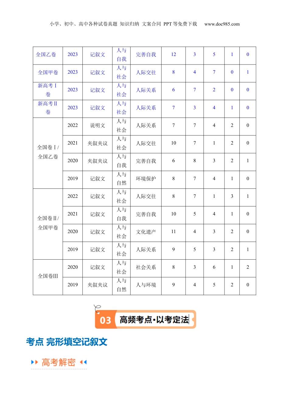 小学、初中、高中各种试卷真题知识归纳文案合同PPT等免费下载www.doc985.com专题13完形空文特点分析填记叙+高分策略01专题网络·思维脑图02考情分析·解密高考03高频考点·以考定法04核心素养·微专题微和短辨析易点专题动词词义动词语错05创新好题·分层练考点完形填空记叙文【高考解密】命题点01动词(短语)和名词命题点02形容词和副词【技巧解密】【考向】预测小学、初中、高中各种试卷真题知识归纳文案合同PPT等免费下载www.doc985.com试卷年份体裁主题考查类型语境内容(短语)动词名词(短语)形容词(短语)副词介词(短语)小学、初中、高中各种试卷真题知识归纳文案合同PPT等免费下载www.doc985.com全国乙卷2023记叙文人与自我完善自我123510全国甲卷2023记叙文人与社会人际交往84701新高考Ⅰ卷2023记叙文人与社会人际关系67200新高考Ⅱ卷2023记叙文人与社会人际关系73410全国卷Ⅰ/全国乙卷2022说明文人与社会人际关系774202021夹叙夹议人与社会人际交往1071202020夹叙夹议人与自我完善自我683212019记叙文人与自然环境保护87410全国卷Ⅱ/全国甲卷2022记叙文人与社会人际交往871312021记叙文人与自我完善自我1054102020记叙文人与社会文化遗产1143202019记叙文人与社会人际关系95321全国卷Ⅲ2020记叙文人与社会社会关系836122019夹叙夹议人与自然人与环境94520考点完形填空记叙文小学、初中、高中各种试卷真题知识归纳文案合同PPT等免费下载www.doc985.com命题点一动词(短语)和名词典例01【2023年新高考全国Ⅱ卷】Itjust___44___thatIwasplanninganotherPNPflightwithanotherpilot,Karen,who___45___totakeTiffyfromKansasCitytoVirginia.WhatIwastodowasflytoTopekato___46___Tiffy.44.A.appearedB.provedC.happenedD.showed解析:根据“IwasplanninganotherPNPflightwithanotherpilot,Karen,”可知,碰巧的是作者和另一名飞行员正在计划另一次PNP飞行。答案:C45.A.waitedB.offeredC.hurriedD.failed解析:根据“totakeTiffyfromKansasCitytoVirginia.”可知,Karen主动提出帮忙把狗Tiffy从堪萨斯城带到弗吉尼亚。答案:B46.A.seeoffB.lookforC.handoverD.pickup解析:根据“WhatIwastodowasflytoTopeka”和常识可知,作者需要飞到托皮卡去接Tiffy。故选D。答案:D典例02【2023年新高考全国Ⅱ卷】InAprillastyear,IsawapostonthePNP(PilotsNPaws)websitefromafamilyinTopeka.TheyhadtomovetoVirginiabuttheywereonaverytight___41___.Theycouldnotaffordtopayfor___42___fortheirdog,Tiffy,and___43___wantedtotakeherwiththem.41.A.turnB.budgetC.scheduleD.connection解析:根据“Theycouldnotaffordtopayfor___2___fortheirdog,Tiffy,”可知,这个家庭的预算非常紧张。答案:B42.A.foodB.shelterC.medicineD.transportation解析:根据“TheyhadtomovetoVirginiabuttheywereonaverytight___1___.”及下文可知,这个家庭的预算非常紧张,所以付不起他们的狗Tiffy的交通费。答案:D43.A.desperatelyB.temporarilyC.secretlyD.originally解析:根据“wantedtotakeherwiththem.”可知,这家人非常想把狗一起带走。小学、初中、高中各种试卷真题知识归纳文案合同PPT等免费下载www.doc985.com答案:A典例03(2022年全国甲卷完形填空)Youcantellalotaboutamanbyhowhetreatshisdogs.Formanyyears,Ienjoyedlivingwithmydogs,TillyandChance.Their___41___wasnearlyenoughtokeepmylonelinessatbay.Nearly.Lastyear,Istarteddating,butwith___42___.41.A.ownershipB.membershipC.companionshipD.leadership42.A.reservationsB.expectationsC.confidenceD.prejudice41.【答案】C【解析】考查名词词义辨析。句意:它们的陪伴几乎足以让我远离孤独。A.ownership所有权;B.membership会员;C.companionship陪伴;D.leadership领导。由上文的“Formanyyears,Ienjoyedlivingwithmydogs,TillyandChance.(多年来,我喜欢和我的狗Tilly和Chance生活在一起)”可知,作者多年和狗狗生活在一起,可得出狗狗陪伴着作者,让作者远离孤独。故选C项。42.【答案】A【解析】考查名词词义辨析。句意:去...