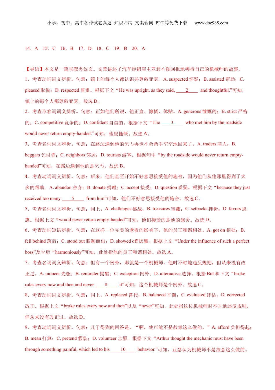 小学、初中、高中各种试卷真题知识归纳文案合同PPT等免费下载www.doc985.com专题验收评价专题14完形填空夹叙夹议文和说明文特点分析+高分策略内容概览A·常考题不丢分【命题点01命题点01完形填空夹叙夹议文】【命题点02完形填空议论文和说明文】【微专题动词词义和动词短语辨析易错点】B·拓展培优拿高分C·挑战真题争满分【命题点01完形填空夹叙夹议文】(2023上·天津·高三天津市咸水沽第一中学校考期末)Foryears,Arthurranacardealership(汽车经销店)inasmalltowninAustralia.Everybodyinthetownknewand1Arthur.Hewasupright,astheysaid,2andthoughtful.Helikedstrollingalongthestreetsofthetownwithhischildren.The3whomethimbytheroadsidewouldneverreturnempty-handed.Theylaterevenbegantofeelembarrassedto4hishandoutsbecausetheyjustreceivedtoomany5fromhim.Undertheinfluenceofsuchaperfectboss,hisemployees6harmoniously.Buttherewasone7—amechanic,whobrokeruleseverynowandthenandnever8it.Arthur’soldersonaskedwhyhisfatherkepttheman.Theanswerthesongotwas,“Ah,heprobablydidn’t9todothat.”Arthurthoughtthemechanicmusthavebeenthroughsomethingpainful,whichledtohis10behavior.Arthurintendedtohelp,butthemechanicseemedtobe11torevealhisheart.小学、初中、高中各种试卷真题知识归纳文案合同PPT等免费下载www.doc985.comSomethingunexpectedhappenednext.Arthur’swifegotaseriousdisease,whichleftherunabletofunction12.Towellcareforhiswifeathome,Arthur13hisdealership.Theemployeesallfound14inotherplaces,exceptthemechanic.15,Arthurkeptpayinghimasalaryuntilhegotajob.Butitdidn’t16themechanicenough;henevervisitedthecoupleonce.ThatwasOKwithArthur.Hefairlyhad17oneverybodyaroundhim18theydidn’tshowanygratitude.Weoftenreservecompassionforthosewhowebelieve19it.Butrealcompassionisthatweofferitwithoutjudgment,eventothosearounduswhomaynotyethavethecapacityto20thefavor.1.A.suspectedB.assistedC.pleasedD.respected2.A.generousB.strictC.competitiveD.confident3.A.tradersB.beggarsC.neighborsD.tourists4.A.abandonB.donateC.acceptD.question5.A.challengesB.treasuresC.setbacksD.favors6.A.gotonB.fellbehindC.stoodoutD.showedoff7.A.pioneerB.reminderC.exceptionD.alternative8.A.replacedB.balancedC.evaluatedD.corrected9.A.affordB.meanC.pretendD.volunteer10.A.unusualB.informalC.amusingD.typical11.A.disappointedB.proudC.unwillingD.unable12.A.rapidlyB.independentlyC.gracefullyD.leisurely13.A.leftasideB.partneredwithC.attendedtoD.shutdown14.A.employmentB.evidenceC.lessonsD.privileges15.A.HelplesslyB.FlexiblyC.IncrediblyD.Obviously16.A.attractB.softenC.convinceD.protect17.A.commentsB.judgmentsC.relianceD.mercy18.A.asthoughB.nowthatC.evenifD.incase19.A.repeatB.deserveC.forgiveD.regret20.A.returnB.refuseC.proveD.spread【答案】1.D2.A3.B4.C5.D6.A7.C8.D9.B10.A11.C12.B13.D小学、初中、高中各种试卷真题知识归纳文案合同PPT等免费下载www.doc985.com14.A15.C16.B17.D18.C19.B20.A【导语】本文是一篇夹叙夹议文。文章讲述了汽车经销店主亚瑟不图回报地善待自己的机械师的故事。1.考查动词词义辨析。句意:镇上的每个人都认识并尊敬亚瑟。A.suspected怀疑;B.assisted帮助;C.pleased取悦;D.respected尊重。根据下文“Hewasupright,astheysaid,2andthoughtful.”可知,镇上的每个人都尊敬亚瑟。故选D。2.考查形容词词义辨析。句意:正如他们所说,他正直、慷慨、体贴。A.generous慷慨的;B.strict严格的;C.competitive竞争的;D.confident自信的。根据下文“The3whomethimbytheroadsidewouldneverreturnempty-handed.”可知,...