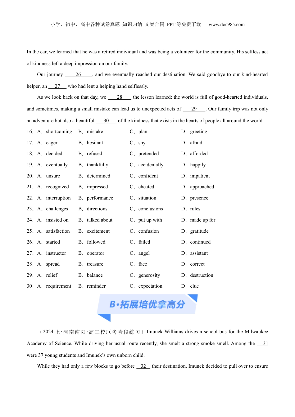 小学、初中、高中各种试卷真题知识归纳文案合同PPT等免费下载www.doc985.com专题验收评价专题15完形空填之句次内层题3大技巧解密内容概览A·常考题不丢分【命题点句内层次题】【微专题完形填空中长难句应对策略】B·拓展培优拿高分C·挑战真题争满分【命题点01句内层次题】(2023上·山东淄博·高三山东省淄博实验中学校联考阶段练习)OneeveningIwasrunninglateforameetingandIpassedafriendinthehallway.Myfriendaskedthedaily1question,“Howareyoudoing?”2,ratherthangivetheexpectedresponse,“Good,howaboutyou?”Idecidedto3mydissatisfactionwithtraffic,peoplewhocan’tputdowntheircellphonesattrafficlights,4visionintherainandeverythingelseaboutmy5journeytowork.Insteadofshowingsympathy,myfriendaskedachallengingquestion,“Whatwouldhavehappenedifyourguardianangelhadn’tcreatedthose6?”Theinference(推断)wasthatImighthavebeen7somethingmuchworsethanbeinglateforameeting.My8reactionwastolaughandwalkon,butlaterIbeganto9whathehadasked.Overthenextfewdays,themoreIthoughtaboutthisquestion,themore10Iwasabletoseeinit.小学、初中、高中各种试卷真题知识归纳文案合同PPT等免费下载www.doc985.comIthoughtaboutmy11experiencesaswellasthethingsthathadhappenedtome,andtheseedhehadplantedstartedtogrow.Irememberedmyunclewhowaslateforaflightandtheflighthehad12crasheddown.Irememberedwhen13keptmefromaccidentsonthesameroadIwastravelingon.Eversincemyfriendgavemehisadviceintheformofa14,Ihavebecomelessstressed.Keepingtheadviceinmindmakesmemore15andhasimprovedmylife.1.A.toughB.trickyC.routineD.awkward2.A.ThusB.BesidesC.HoweverD.Instead3.A.unloadB.containC.spreadD.uncover4.A.goodB.poorC.awesomeD.sensitive5.A.stressfulB.delightfulC.thoughtfulD.sorrowful6.A.opportunitiesB.miraclesC.roadblocksD.misfortunes7.A.savedB.sparedC.offeredD.made8.A.positiveB.habitualC.hesitantD.immediate9.A.reflectonB.careaboutC.dealwithD.calloff10.A.chancesB.wisdomC.concernD.skills11.A.personalB.childhoodC.familyD.school12.A.forgottenB.missedC.avoidedD.boarded13.A.delaysB.schedulesC.budgetsD.events14.A.dialogueB.lectureC.questionD.statement15.A.atleastB.atbestC.atseaD.atease【微专题完形填空中长难句应对策略】(2023上·河北沧州·高三校联考阶段练习)Lastsummermyfamilywentonamemorablevacationtoaforeigncountry.Littledidweknowthatasimple16wouldleadustoanunexpectedactofkindness.Ourfamilywasexploringalivelyandbusycity,17toexperiencethelocalculture.Onasunnymorning,we18totakeabustoawell-knownmarket.However,we19gotoffatthewrongstop.Aswestoodthere,20aboutournextstep,alocalstranger21us.Bytalking,heunderstoodour22immediately.Insteadofjustgivingus23,hewenttheextramile.Ournewfoundfriendledustohiscarand24drivingustoourintendeddestination.Wewereoverwhelmedwith25asweacceptedhisofferofhelp.小学、初中、高中各种试卷真题知识归纳文案合同PPT等免费下载www.doc985.comInthecar,welearnedthathewasaretiredindividualandwasbeingavolunteerforthecommunity.Hisselflessactofkindnessleftadeepimpressiononourfamily.Ourjourney26,andweeventuallyreachedourdestination.Wesaidgoodbyetoourkind-heartedhelper,an27whohadlentahelpinghandselflessly.Aswelookbackonthatday,we28thelessonlearned:theworldisfullofgood-heartedindividuals,andsometimes,makingasmallmistakecanleadustounexpectedactsof29.Ourfamilytripwasnotonlyanadventurebutalsoabeautiful30ofthekindnessthatexistsintheheartsofpeopleallaroundtheworld.16.A.shortcomingB.mistakeC.planD.greeting17.A...