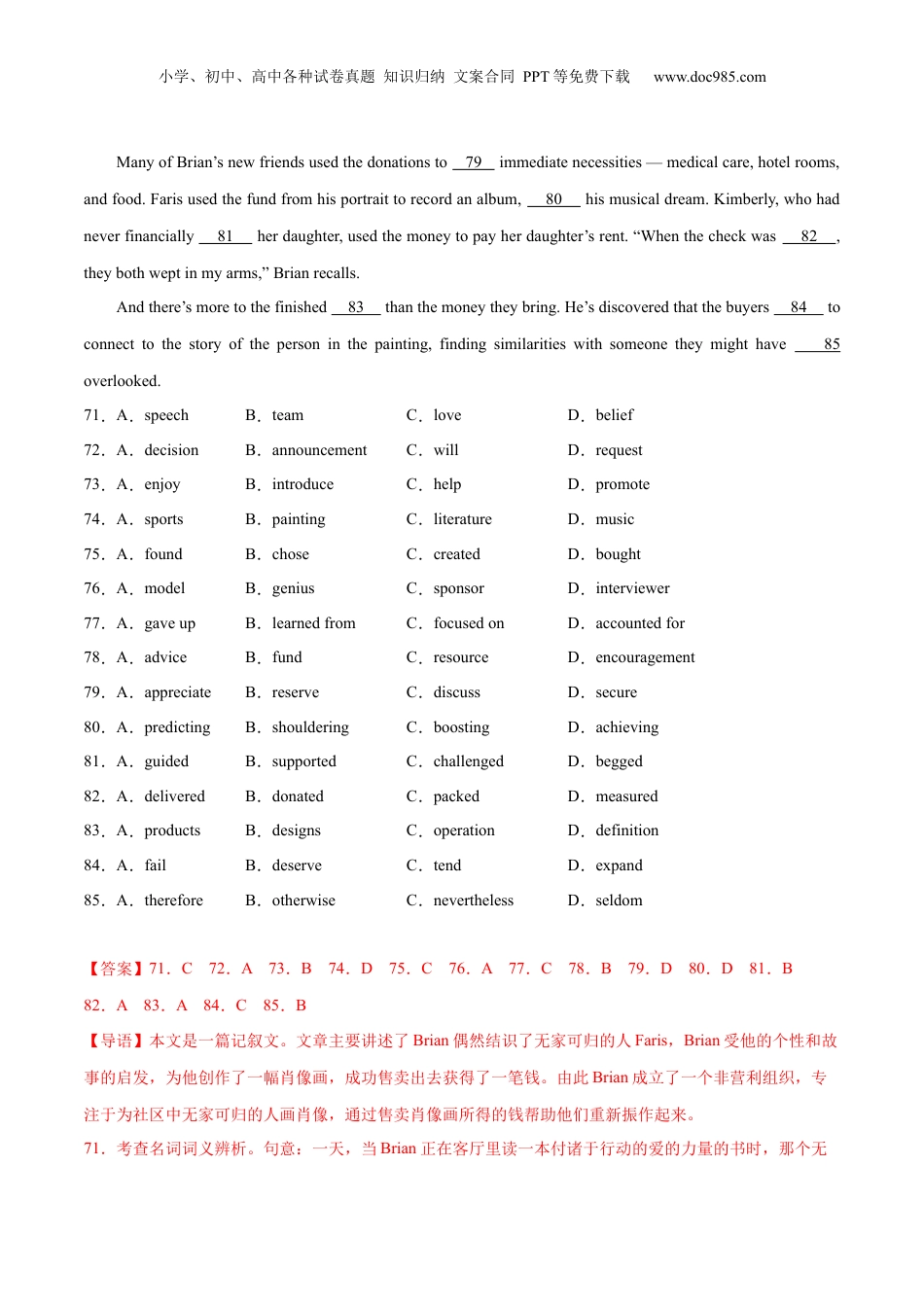 小学、初中、高中各种试卷真题知识归纳文案合同PPT等免费下载www.doc985.com专题验收评价专题16完形空之句填间+篇次语层题3大技巧解密内容概览A·常考题不丢分【命题点01句间层次题】【命题点02语篇层次题】【微专题完形填空5大易错点】B·拓展培优拿高分C·挑战真题争满分【命题点01句间层次题】(2024·河南·校联考模拟预测)Brian,anartist,hadjustmovedtoSantaAna.Hewouldpassahomelessmanonhiswayhomefromwork.Oneday,whenBrianwasreadingabookinhislivingroomaboutthepowerof71inaction,thehomelessmanpassedbyoutsidethewindow.Asecondlater,hemadea(n)72.Hewasgoingtogooutsideand73himself.Inthatfirstconversation,BrianlearnedthatthemanwasMattFaris,whoendeduplivingonthestreetafterhisunsuccessfulcareerin74.Inspiredbyhispersonalityandlifestory,Brian75aportrait(肖像画)oftheman.Briansoldtheportraitforafewthousanddollarsandputitintoa“loveaccount”forhis76.HeformedFacesofSantaAna,anon-profitorganizationthat77paintingportraitsofhomelessmembersofthecommunity.Hethenusedthe78tohelppeoplegetbackontheirfeet.小学、初中、高中各种试卷真题知识归纳文案合同PPT等免费下载www.doc985.comManyofBrian’snewfriendsusedthedonationsto79immediatenecessities—medicalcare,hotelrooms,andfood.Farisusedthefundfromhisportraittorecordanalbum,80hismusicaldream.Kimberly,whohadneverfinancially81herdaughter,usedthemoneytopayherdaughter’srent.“Whenthecheckwas82,theybothweptinmyarms,”Brianrecalls.Andthere’smoretothefinished83thanthemoneytheybring.He’sdiscoveredthatthebuyers84toconnecttothestoryofthepersoninthepainting,findingsimilaritieswithsomeonetheymighthave85overlooked.71.A.speechB.teamC.loveD.belief72.A.decisionB.announcementC.willD.request73.A.enjoyB.introduceC.helpD.promote74.A.sportsB.paintingC.literatureD.music75.A.foundB.choseC.createdD.bought76.A.modelB.geniusC.sponsorD.interviewer77.A.gaveupB.learnedfromC.focusedonD.accountedfor78.A.adviceB.fundC.resourceD.encouragement79.A.appreciateB.reserveC.discussD.secure80.A.predictingB.shoulderingC.boostingD.achieving81.A.guidedB.supportedC.challengedD.begged82.A.deliveredB.donatedC.packedD.measured83.A.productsB.designsC.operationD.definition84.A.failB.deserveC.tendD.expand85.A.thereforeB.otherwiseC.neverthelessD.seldom【答案】71.C72.A73.B74.D75.C76.A77.C78.B79.D80.D81.B82.A83.A84.C85.B【导语】本文是一篇记叙文。文章主要讲述了Brian偶然结识了无家可归的人Faris,Brian受他的个性和故事的启发,为他创作了一幅肖像画,成功售卖出去获得了一笔钱。由此Brian成立了一个非营利组织,专注于为社区中无家可归的人画肖像,通过售卖肖像画所得的钱帮助他们重新振作起来。71.考查名词词义辨析。句意:一天,当Brian正在客厅里读一本付诸于行动的爱的力量的书时,那个无小学、初中、高中各种试卷真题知识归纳文案合同PPT等免费下载www.doc985.com家可归的人从窗外经过。A.speech演讲;B.team团队;C.love爱;D.belief信仰。根据下文Brian出去和无家可归的人打招呼,帮他画肖像画可推知,这本书谈的是付诸于行动的爱的力量,Brian是受到书中思想的激励做出了行动。故选C。72.考查名词词义辨析。句意:一秒钟后,他做了一个决定。A.decision决定;B.announcement公告;C.will意愿;D.request请求。根据下文“Hewasgoingtogooutsideand___3___himself.”可推知,接下来的行动是Brian所做的决定。故选A。73.考查动词词义辨析。句意:他要到外面去做自我介绍。A.enjoy享受;B.introduce介绍;C.help帮助;D.promote促进。根据下文“Inthatfirstconversation,BrianlearnedthatthemanwasMattFaris”可推知,Brian...