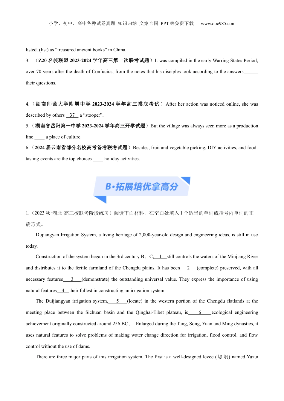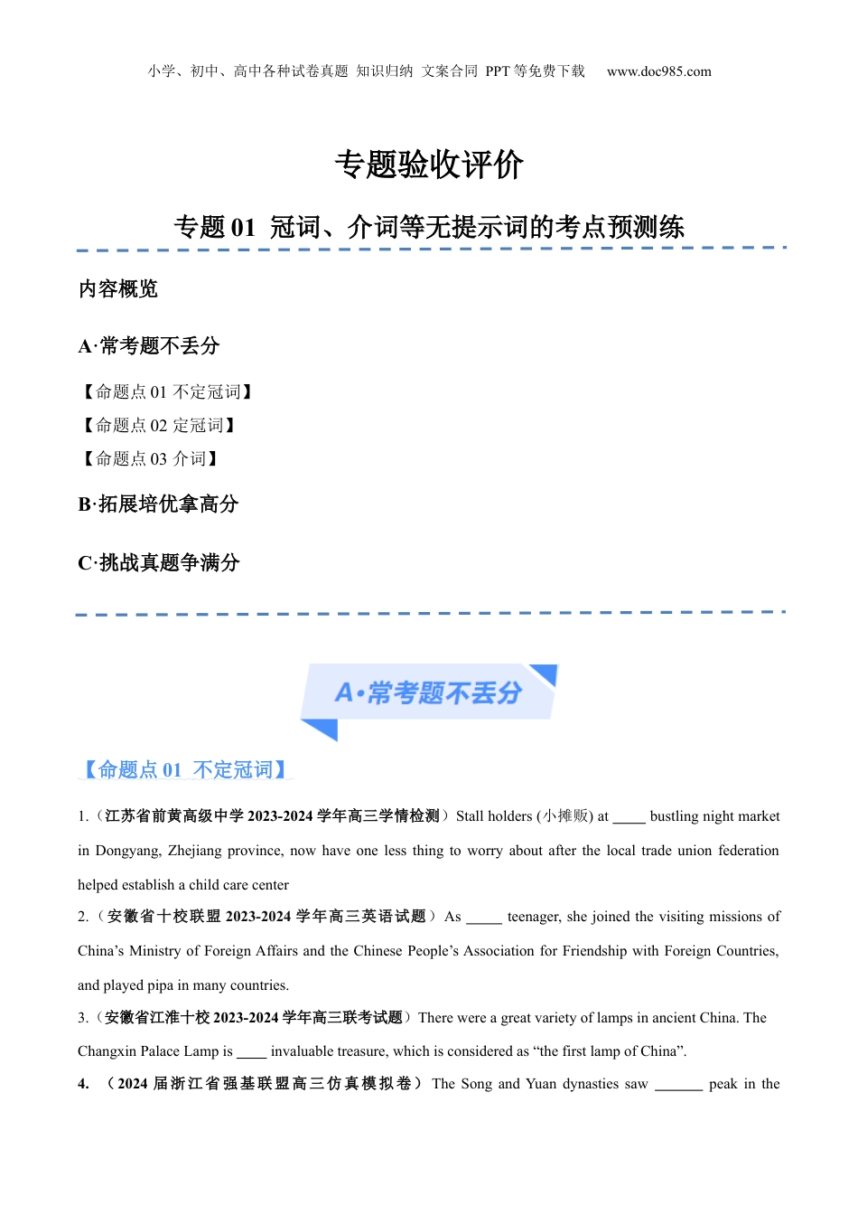 小学、初中、高中各种试卷真题知识归纳文案合同PPT等免费下载www.doc985.com专题验收评价专题01冠词、介词等无提示词的考点预测练内容概览A·常考题不丢分【命题点01不定冠词】【命题点02定冠词】【命题点03介词】B·拓展培优拿高分C·挑战真题争满分【命题点01不定冠词】1.(江苏省前黄高级中学2023-2024学年高三学情检测)Stallholders(小摊贩)atbustlingnightmarketinDongyang,Zhejiangprovince,nowhaveonelessthingtoworryaboutafterthelocaltradeunionfederationhelpedestablishachildcarecenter2.(安徽省十校联盟2023-2024学年高三英语试题)Asteenager,shejoinedthevisitingmissionsofChina’sMinistryofForeignAffairsandtheChinesePeople’sAssociationforFriendshipwithForeignCountries,andplayedpipainmanycountries.3.(安徽省江淮十校2023-2024学年高三联考试题)TherewereagreatvarietyoflampsinancientChina.TheChangxinPalaceLampisinvaluabletreasure,whichisconsideredas“thefirstlampofChina”.4.(2024届浙江省强基联盟高三仿真模拟卷)TheSongandYuandynastiessawpeakinthe小学、初中、高中各种试卷真题知识归纳文案合同PPT等免费下载www.doc985.comdevelopmentofChineseculture,andthiscoincidedwiththegoldenageofancientbooksinChina,saysChuXiaobo5.(2023年浙江省镇海中学高三试题)InChinacalligraphyoccupiesadistinguishedpositioninthefieldoftraditionalart.Itisnotonlyameansofcommunication,butameansofexpressingaperson’sinnerworldin_____aestheticway.6.(江苏省南京外国语中学2023-2024学年高三试题)FangJifan,thefifth-generationteafarmersays.“It’s_____signatureofourhome.”【命题点02定冠词】1.(浙江省浙南名校联盟2023年高三试题)IntheHujiayuancommunityinBeijing,anoldbuildingthathousedaboilertoheatapartmentshasbeentransformedtoprovidefacilities,includingamedicalcenterfor_____elderlyandafitnesscenter.2.(黑龙江省牡丹江市第三高级中学2023-2024学年高三试卷)CoveringanareaaboutthreetimessizeofYellowstoneNationalPark,theGPNPwillbeoneofthefirstnationalparksinthecountry.3.(2023·全国·高三专项练习)BrownfamilyliveinanapartmentbuildingoutsideToronto.Onthedayoftheaccident,Mrs.BrownwasatworkandEricwasathomewithhisfather.4.(2023·全国·高三专项练习)Aftertheearthquake,injuredwerequicklytakentodifferenthospitals.5.(2023·全国·高三专项练习)Itseemsthatprotectingtheenvironmentisverycostly,butin______longterm,itwillbenefitthewholesociety.【命题点03介词】1.(广东省七校联合体2023-2024学年高三联考试题)Institutionalmechanismsandpolicysystemsforgreendevelopmentinurbanandruralareaswillbebasicallyestablishedby2025,whilegreendevelopmentwillcoverurbanandruralareas__acomprehensivewayby2035,withanincreasedcutincarbonemissions,saidtheguideline.2.(2024届浙江省强基联盟高三仿真模拟卷)AncientbooksfromtheSong(960—1279)andYuan(1271—1368)dynastiesarenowshowatanewexhibitionattheShanghaiMuseumandabouthalfoftheexhibitsare小学、初中、高中各种试卷真题知识归纳文案合同PPT等免费下载www.doc985.comlisted(list)as“treasuredancientbooks”inChina.3.(Z20名校联盟2023-2024学年高三第一次联考试题)ItwascompiledintheearlyWarringStatesPeriod,over70yearsafterthedeathofConfucius,fromthenotesthathisdisciplestookaccordingtotheanswers_____theirquestions.4.(湖南师范大学附属中学2023-2024学年高三摸底考试)Afterheractionwasnoticedonline,shewasdescribedbyothers37a“stooper”.5.(湖南省岳阳第一中学2023-2024学年高三开学试题)Butthevillagewasalwaysseenmoreasaproductionlineaplaceofculture.6.(2024届云南省部分名校高考备考联考试题)Besides,fruitandvegetablepicking,DIYactivities,andfood-tastingeventsaretheto...