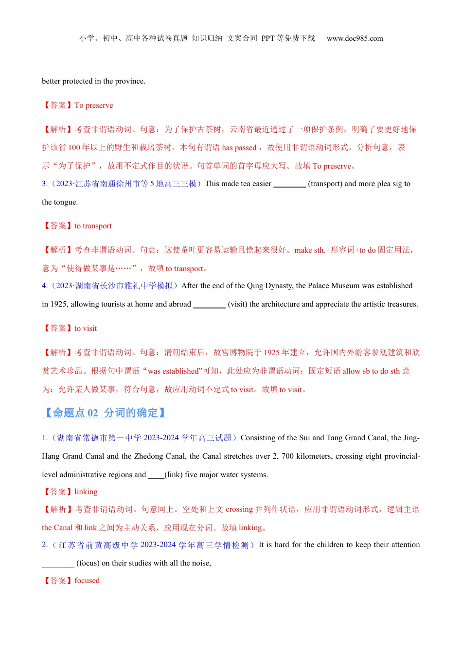 小学、初中、高中各种试卷真题知识归纳文案合同PPT等免费下载www.doc985.com专题验收评价专题03非谓语动词的确定内容概览A·常考题不丢分【命题点01动词不定式的确定】【命题点02分词的确定】【命题点03动名词的确定】B·拓展培优拿高分C·挑战真题争满分【命题点01动词不定式的确定】1.(2024届辽宁省本溪市高中高三一模试题)Thegovermment,however,doesnotintend__(stop)theprotectionprogrammes,sincethethreatstotheTibetanantelopehavenotyetdisappeared.【答案】tostop【解析】考查非谓语动词。句意:然而,政府并不打算停止保护计划,因为对藏羚羊的威胁还没有消失。根据谓语动词“intend”可知,空处应为非谓语动词;动词短语intendtodosth表示“打算做某事”,符合句意,故应用动词不定式作宾语。故填tostop。2.(2023·河北省衡水中学高三下学期五调)________(preserve)theancientteatrees,YunnanProvincehaspassedaprotectionregulationrecently,clarifyingthatwildandcultivatedteaplantsagedover100yearsshouldbe小学、初中、高中各种试卷真题知识归纳文案合同PPT等免费下载www.doc985.combetterprotectedintheprovince.【答案】Topreserve【解析】考查非谓语动词。句意:为了保护古茶树,云南省最近通过了一项保护条例,明确了要更好地保护该省100年以上的野生和栽培茶树。本句有谓语haspassed,故使用非谓语动词形式,分析句意,表示“为了保护”,故用不定式作目的状语。句首单词的首字母应大写。故填Topreserve。3.(2023·江苏省南通徐州市等5地高三三模)Thismadeteaeasier________(transport)andmorepleasigtothetongue.【答案】totransport【解析】考查非谓语动词。句意:这使茶叶更容易运输且偿起来很好。makesth.+形容词+todo固定用法,意为“使得做某事是……”,故填totransport。4.(2023·湖南省长沙市雅礼中学模拟)AftertheendoftheQingDynasty,thePalaceMuseumwasestablishedin1925,allowingtouristsathomeandabroad________(visit)thearchitectureandappreciatetheartistictreasures.【答案】tovisit【解析】考查非谓语动词。句意:清朝结束后,故宫博物院于1925年建立,允许国内外游客参观建筑和欣赏艺术珍品。根据句中谓语“wasestablished”可知,此处应为非谓语动词;固定短语allowsbtodosth意为:允许某人做某事,符合句意,故应用动词不定式tovisit。故填tovisit。【命题点02分词的确定】1.(湖南省常德市第一中学2023-2024学年高三试题)ConsistingoftheSuiandTangGrandCanal,theJing-HangGrandCanalandtheZhedongCanal,theCanalstretchesover2,700kilometers,crossingeightprovincial-leveladministrativeregionsand(link)fivemajorwatersystems.【答案】linking【解析】考查非谓语动词。句意同上。空处和上文crossing并列作状语,应用非谓语动词形式,逻辑主语theCanal和link之间为主动关系,应用现在分词。故填linking。2.(江苏省前黄高级中学2023-2024学年高三学情检测)Itishardforthechildrentokeeptheirattention________(focus)ontheirstudieswithallthenoise,【答案】focused小学、初中、高中各种试卷真题知识归纳文案合同PPT等免费下载www.doc985.com【解析】考查非谓语动词。句意:孩子们很难把注意力集中在学习上,如果父母要照顾孩子,他们就永远无法集中精力在生意上。空处应为非谓语动词,且和宾语“attention”之间为动宾关系,故应为done形式作宾语补足语。故填focused。3.(2023·江苏省南京市统考)Linsaidafriendgothim________(involve)indragonboatracingoveradecadeago.In2018,theydecidedtohosttheirownfestival.【答案】involved【解析】考查非谓语动词。句意:林说,十多年前,一位朋友让他参与了龙舟比赛。分析句子可知,句中有谓语动词“got”,故空格处应用非谓语动词,“involve”意为“参加”,动词词性,“him”和“involve”为逻辑上的动宾关系,故应用“involve”的过去分词“involved”,作宾语补足语。故填involved。4.(2023·江苏省常州市期中)Animage________(generate)withanAIsystemcalledMidj...