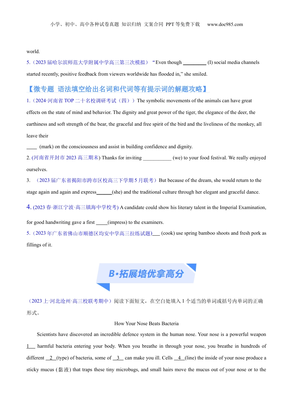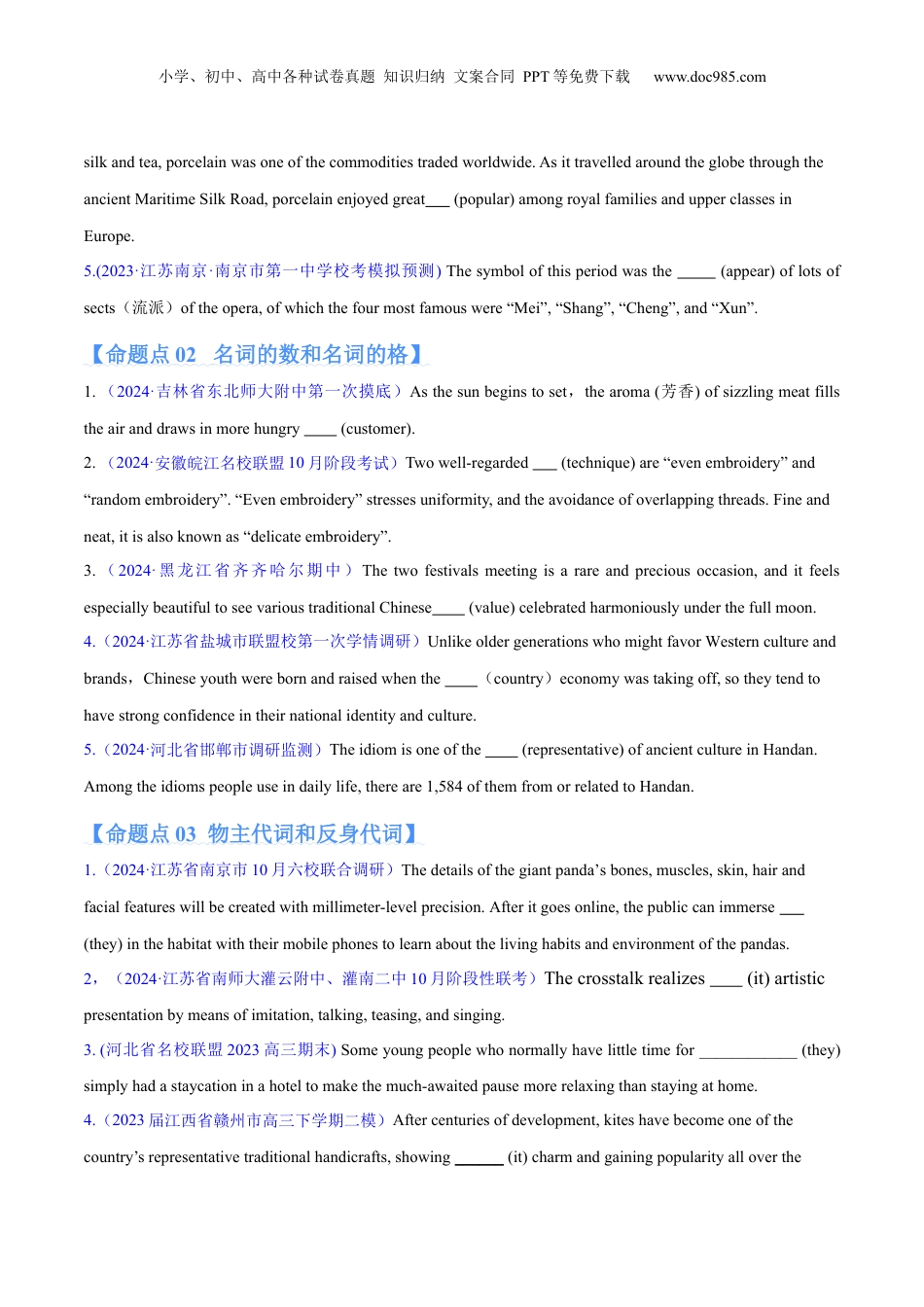 小学、初中、高中各种试卷真题知识归纳文案合同PPT等免费下载www.doc985.com专题验收评价专题04名词和代词等有提示词的揭秘内容概览A·常考题不丢分【命题点01名词的构成】【命题点02名词的数】【命题点03物主代词和反身代词】【微专题语法填空给出名词和代词等有提示词的解题攻略】B·拓展培优拿高分C·挑战真题争满分【命题点01名词的构成】1.(2024·黑龙江省齐齐哈尔期中)Overthepastdecade,morethan4,500teachersacrossthecountryhavebeenawardedatthenationallevelfortheirprofessionalismand(devote)toeducation.2.(2024·河北省衡水市第二中学综合素养检测)Ifoundawaytochannelthat(curious)intoscienceandthatsoonblossomedintoengineering.3.(2024·江苏省镇江第一中学学情检测)“TheTerracottaWarriorsusedaveryspecialmechanismtoconnectpiecestogether.Such(wise)wasuniquetoChina,”LvQiuxia,anexpertonancientChineseart,toldtheGlobalTimesonWednesday.4.(2024·江苏省决胜新高考大联考)Porcelainhasalsobeenacarrierforculturalexchanges.AlongwithChina’s小学、初中、高中各种试卷真题知识归纳文案合同PPT等免费下载www.doc985.comsilkandtea,porcelainwasoneofthecommoditiestradedworldwide.AsittravelledaroundtheglobethroughtheancientMaritimeSilkRoad,porcelainenjoyedgreat(popular)amongroyalfamiliesandupperclassesinEurope.5.(2023·江苏南京·南京市第一中学校考模拟预测)Thesymbolofthisperiodwasthe(appear)oflotsofsects(流派)oftheopera,ofwhichthefourmostfamouswere“Mei”,“Shang”,“Cheng”,and“Xun”.【命题点02名词的数和名词的格】1.(2024·吉林省东北师大附中第一次摸底)Asthesunbeginstoset,thearoma(芳香)ofsizzlingmeatfillstheairanddrawsinmorehungry(customer).2.(2024·安徽皖江名校联盟10月阶段考试)Twowell-regarded(technique)are“evenembroidery”and“randomembroidery”.“Evenembroidery”stressesuniformity,andtheavoidanceofoverlappingthreads.Fineandneat,itisalsoknownas“delicateembroidery”.3.(2024·黑龙江省齐齐哈尔期中)Thetwofestivalsmeetingisarareandpreciousoccasion,anditfeelsespeciallybeautifultoseevarioustraditionalChinese(value)celebratedharmoniouslyunderthefullmoon.4.(2024·江苏省盐城市联盟校第一次学情调研)UnlikeoldergenerationswhomightfavorWesterncultureandbrands,Chineseyouthwerebornandraisedwhenthe(country)economywastakingoff,sotheytendtohavestrongconfidenceintheirnationalidentityandculture.5.(2024·河北省邯郸市调研监测)Theidiomisoneofthe(representative)ofancientcultureinHandan.Amongtheidiomspeopleuseindailylife,thereare1,584ofthemfromorrelatedtoHandan.【命题点03物主代词和反身代词】1.(2024·江苏省南京市10月六校联合调研)Thedetailsofthegiantpanda’sbones,muscles,skin,hairandfacialfeatureswillbecreatedwithmillimeter-levelprecision.Afteritgoesonline,thepubliccanimmerse(they)inthehabitatwiththeirmobilephonestolearnaboutthelivinghabitsandenvironmentofthepandas.2,(2024·江苏省南师大灌云附中、灌南二中10月阶段性联考)Thecrosstalkrealizes(it)artisticpresentationbymeansofimitation,talking,teasing,andsinging.3.(河北省名校联盟2023高三期末)Someyoungpeoplewhonormallyhavelittletimefor____________(they)simplyhadastaycationinahoteltomakethemuch-awaitedpausemorerelaxingthanstayingathome.4.(2023届江西省赣州市高三下学期二模)Aftercenturiesofdevelopment,kiteshavebecomeoneofthecountry’srepresentativetraditionalhandicrafts,showing______(it)charmandgainingpopularityalloverthe小学、初中、高中各种试卷真题知识归纳文案合同PPT等免费下载www.doc985.comworld.5.(2023届哈尔滨师范大学附属中学高三第三次模拟)“Eventhough_________(I)socialmediachannelss...