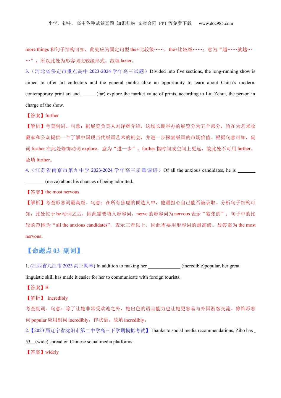 小学、初中、高中各种试卷真题知识归纳文案合同PPT等免费下载www.doc985.com专题验收评价专题05形容词、副词的等级及利用构词法进行词类转换内容概览A·常考题不丢分【命题点01形容词的构成】【命题点02形容词的级】【命题点03副词】【微专题形容词、副词4大易错陷阱】B·拓展培优拿高分C·挑战真题争满分【命题点01形容词的构成】1.(江苏省南京市五校2023年高三联考试题)Chinahasdone(cooperate)researchongiantpandaconservationwith22zoosin18countries,”saidHuaChunying,aspokespersonforChina’sForeignMinistry,atapressconferencein2021.【答案】cooperative【解析】考查形容词。句意:“该项目突出了中国与其他国家之间的密切伙伴关系和科学合作。中国已与18个国家的22家动物园开展了大熊猫保护合作研究,”中国外交部发言人华春莹在2021年的一次新闻发布会上说。分析句子结构可知,此处为形容词作定语修饰名词research,cooperate的形容词为cooperative意为“合作的”符合句意。故填cooperative。小学、初中、高中各种试卷真题知识归纳文案合同PPT等免费下载www.doc985.com2.(河南省开封市2023高三期末)AccordingtoProfessorJohnson,wedon'thavetoreadthebookifwedon'twantto,asitis_____________(option).【答案】optional【解析】考查形容词。句意:根据约翰逊教授的说法,如果我们不想读这本书,就不必读,因为这是可选择的。作表语,用形容词形式。optional可供选择的。3.(安徽省合肥市2023高三期末)Whatwasso_____________(impress)aboutJasmineWestland'svictorywasthatshecamefirstintheMarathonbarefooted.【答案】impressive【解析】考查形容词。句意:关于JasmineWestland的胜利令人印象深刻的是她在马拉松比赛中赤脚,并且得了第一名。此处应用形容词作表语。4.Hedevotedhimselfto(science)researchonhowtoimprovetheproductivityoffarming.【答案】scientific【解析】考查形容词。句意:他致力于如何提高农业生产力的科学研究。分析句子结构,空白处在句子中作定语表示属性,使用形容词,名词science的形容词为:scientific,故填scientific。5.Toensurea(benefit)andethicalfuturewithAI,itiscrucialtoaddresstheseconcerns.【答案】beneficial【解析】考查形容词。句意:为了确保人工智能有一个有益的、合乎道德的未来,解决这些问题至关重要。分析句子可知,此空应填形容词和and后ethical为并列关系,在本句中作定语,修饰名词future。故填beneficial。【命题点02形容词的级】1.(广东省深圳市2023高三期末)Whole-genomesequencing,whichismuch_____________(costly)--upto$1000,coulddetectmanymoredisorders,suchasthyroidconditionsthatcancausebraindamage.【答案】costlier【解析】考查形容词比较级。句意:全基因组测序成本高达1000美元,可以检测更多疾病,如甲状腺疾病,这些疾病会导致大脑损伤。根据空前的much和句意可知,空处需要形容词的比较级,表示全基因检测的费用更高。故填costlier。2.Aseverybodyknows,the(lazy)apersonis,themorethingsheneedstodotomorrow.【答案】lazier【解析】考查形容词比较级。句意:众所周知,一个人越懒,他明天需要做的事情就越多。根据后面the小学、初中、高中各种试卷真题知识归纳文案合同PPT等免费下载www.doc985.commorethings和句子结构可知,此处应为固定句型the+比较级……,the+比较级……;意为“越……就越……”,所以此处为形容词比较级形式。故填lazier。3.(河北省保定市重点高中2023-2024学年高三试题)Dividedintofivesections,thelong-runningshowisaimedtoofferartcollectorsandthegeneralpublicalikeanopportunitytolearnaboutChina’smodern,contemporaryprintartand(far)explorethemarketvalueofprints,accordingtoLiuZehui,thepersoninchargeoftheshow.【答案】further【解析】考查副词。句意:据展览负责人刘泽辉介绍,这场长期举办的展览分为五个部分,旨在为艺术收藏家和公众提供一个了解中国现当代版画艺术的机会,并进一步探索版画的市场价值。根据句意可知,副词further在此处...