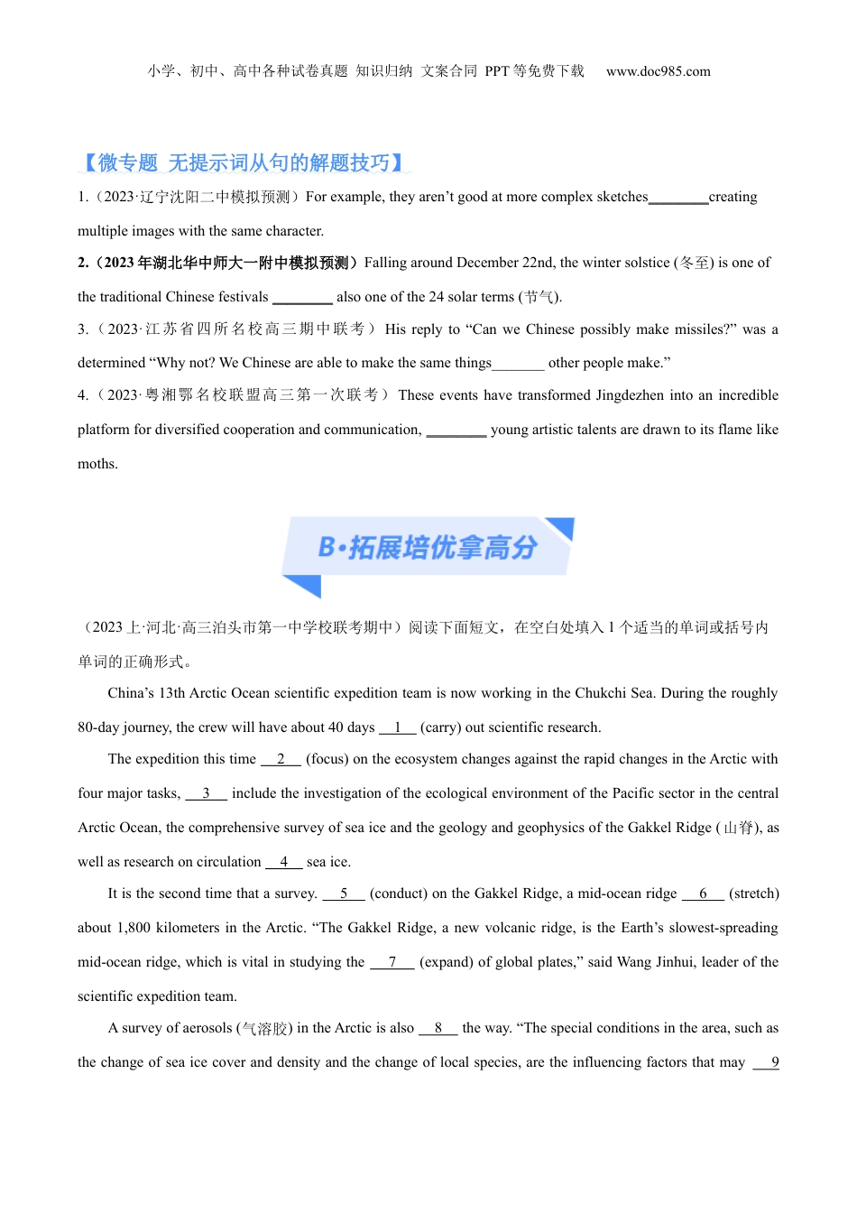 小学、初中、高中各种试卷真题知识归纳文案合同PPT等免费下载www.doc985.com专题验收评价专题06列句、三大句及特殊句式的探究并从内容概览A·常考题不丢分【命题点01并列连词的确定】【命题点02关系词的确定】【命题点03名词性从句连接词的确定】【命题点04主语从句从属连词的确定】【微专题无提示词从句的解题技巧】B·拓展培优拿高分C·挑战真题争满分【命题点01并列连词的确定】1.(2023届河北省衡水中学高三下学期五调试题)Thenewregulation,whichcameintoforcestartingfromMarchl,2023,prohibitssixkindsofbehaviorsthatharmancientteaplants________theirgrowingenvironment.2.(山东师范大学附属中学2023年高三诊断试题)Harvestsgrewlargerandhigherquality,________anotherresultwasthatsometraditionalcropswerelost.3.(山东省齐鲁名校2023年高三英语试题)Xi’ananditsneighboringareaprovidedcrucialreferencepointsforstudiesonurbanconstruction,socialstructures,________theformationofcentraldynastiesinancienttimes.4.(2023·湖北武汉统考模拟预测)Atule’er,a200-year-oldvillageinSichuanprovince,madeheadlinesaroundtheworldwhenphotographsemergedin2016ofschoolchildrengoingdownthecliff(悬崖)onunstablehand-made小学、初中、高中各种试卷真题知识归纳文案合同PPT等免费下载www.doc985.comladders(梯子)________“skyladders”,aslocalscalledthem.【命题点02关系词的确定】1.(江苏省决胜新高考2023年高三4月大联考试题)Hongcunvillagefeaturesitsoveralldesign________resemblestheshapeofanox.2.(重庆市第八中学校2023学年高三下学期4月试题)Afterspendingfivemonthswanderingthroughthecharmingneighborhoods,Ifellinlovewiththeveryatmosphere________cameoutfromeveryopendoor,andwitheveryspokenword.3.(广东省信宜市第二中学2023学年高三试题)AndthenIdecidedtolivewithoutitandjustenjoylife.That’sthereason________I’mhappynow.”4.(河北省石家庄市二中2023年高三试题)However,after2012thenumberofmid-lakeislands_________thegullsmadetheirnestskeptdecreasing,leadingtothenumberofthebabygullsdroppingto2,000.【命题点03名词性从句连接词的确定】1.(2023届湖北省高考冲刺模拟试卷英语试题)youcanlearnfromtheantphilosophyis:Nevergiveup,lookahead,staypositiveanddoallyoucan.2.(2023届河南省名校联考高三5月最终模拟英语试题)Wearesocasualandcarelessaboutweusethingsaroundustomakeusfun,butitisimportantforourhappinessandhealth.3.(2023年北京交通大学附中高三练习)ChineseNewYearisacelebrationmarkingtheendofthewinterseasonandthebeginningofspring.Thisis________decoratingwithplants,fruitsandflowerscarriesspecialsignificance.4.(北京市西城区2022-2023学年高三期末试卷)Butmanypeople,thoughcomplainingaboutthestupidquizzes,stilltakethem,wonderingtheiranswersgeneratetheircorrectbirthyear.【命题点04状语从句从属连词的确定】1.(2023届浙江省91高中联盟年高三5月高考模拟试卷)Manycivilianteamsactivelyjoinedrescuework________ChinaincreaseditsaidtoTurkeyandneighboringSyria.2.(2023届四川省绵阳市高三上学期一诊试题)_________therehavebeenotherriceexperimentsinspace,theonebeingconductedonTiangongisthefirstofitskind.Theaimistoproducethecompletelifecycleoftheplant.3.【江苏省苏锡常镇四市2021届高三教学情况调查(一)】Likeanynaturalforce,gravitypullcanworkwithusornot.Thegravitypullofourhabitsmaycurrentlybekeepingusfromgoing64.wewanttogo.小学、初中、高中各种试卷真题知识归纳文案合同PPT等免费下载www.doc985.com【微专题无提示词从句的解题技巧】1.(2023·辽宁沈阳二中模拟预测)Forexample,theyaren’tgoodatmorecomplexsketches________creatingmultipleimageswiththesamecharacter.2.(2023年湖北华中师大一附中模拟预测)FallingaroundDecember22nd,the...