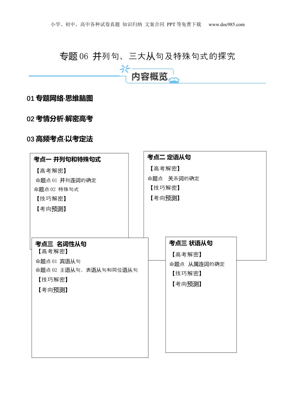 小学、初中、高中各种试卷真题知识归纳文案合同PPT等免费下载www.doc985.com专题06列句、三大句及特殊句式的探究并从01专题网络·思维脑图02考情分析·解密高考03高频考点·以考定法考点二定语从句【高考解密】命点系的确定题关词【技巧解密】【考向】预测考点一并列句和特殊句式【高考解密】命点题01列的确定并连词命点题02特殊句式【技巧解密】【考向】预测考点三名词性从句【高考解密】命点题01句宾语从命点题02主句、表句和同位句语从语从语从【技巧解密】【考向】预测考点三状语从句【高考解密】命点的确定题从属连词【技巧解密】【考向】预测小学、初中、高中各种试卷真题知识归纳文案合同PPT等免费下载www.doc985.com04核心素养·微专题微无提示句的解技巧专题词从题05创新好题·分层练小学、初中、高中各种试卷真题知识归纳文案合同PPT等免费下载www.doc985.com考点考查内容高考考题设问并列句和特殊句式核心价值:高考英语试卷试题取材广泛、体裁多样,引导学生德智体美劳全面发展,加强对中华优秀传统文化和社会主义先进文化的考查,充分发挥文化铸魂的育人功能。融入中华优秀传统文化,增强学生的文化自信。如2023年新高考全国I卷语法填空介绍小笼包;又如2022年新高考全国I卷语法填空语篇报道中国设立大熊猫保护国家公园的情况,介绍中国生态文明建设成就。这些语篇和情境通过讲述中国故事,以浸润的方式引导学生加强对中华优秀传统文化和社会主义核心价值观的认同,增强文化自信,厚植爱国主义情怀。学科素养:1.从选材方面来说,近几年的语法填空选材新颖,紧跟时代脚步和热门话题,体现时代性和立德树人,强调中国元素,引入传统文化的介绍,融入人与自然和谐发展的观念,引导学生德智体美劳全面发展。2.从考查的能力方面来说,在高考试卷中,语法填空对英语学习的考查是多方面的,主要从单词的记忆、语法知识的掌握、长难句分析和语言的感知、推理能力、逻辑判断能力和思维能力等。从考查的考点角度分析,主要考查点包括名词的单复数,代词的指代,冠词的用法,介词、动词短语的固定搭配,形容词、副词的变形,谓语动词的时态语态,动词的非谓语形2023年新高考I卷语法填空:or2023年新高考II卷语法填空:and2023年全国乙卷语法填空:but2023年(1月)语法填空:and2022年新高考I卷语法填空:and2022年新高考II卷语法填空:and2022年全国乙卷语法填空:and2021年新高考I卷语法填空:and2021年新高考II卷语法填空:and2021年全国甲卷语法填空:but2021年浙江卷(1月)语法填空:and2022年新高考II卷语法填空:how+todo作宾语定语从句2023年全国甲卷语法填空:where;as2023年全国乙卷语法填空:which/that2023年北京卷语法填空:where2022年新高考I卷语法填空:that2022年全国甲卷语法填空:who2022年北京卷语法填空:which2022年浙江卷(1月)语法填空:that/who2021年新高考II卷语法填空:which或that小学、初中、高中各种试卷真题知识归纳文案合同PPT等免费下载www.doc985.com式变化,并列连词和复合句的考查等。2021年北京卷语法填空:that;where2021年浙江卷(1月)语法填空:that或which名词性从句2023年新高考II卷语法填空:why表语从句2023年浙江卷(1月)语法填空:whether或if宾语从句2022年新高考II卷语法填空:how+todo作宾语2022年北京卷语法填空:whether宾语从句2021年新高考I卷语法填空:what主语从句考点一并列句和特殊句式命题点01并列连词的确定典例01(2023·新高考Ⅰ卷语法填空)Thedumplingsarrivesteaminganddangerouslyhot.Toeatone,youhavetodecidewhethertobiteasmallholeinitfirst,releasingthestreamandriskingaspill(溢出),toputthewholedumplinginyourmouth,lettingthehotsoupexplodeonyourtongue.【答案】or【解析】考。句意查连词:吃小包的候笼时,必要定是先咬一小口你须决个,放蒸汽释,里面的汁流出让汤来还是把整小包放嘴里个笼进,在舌上爆炸。此考短让热汤头处查语whether…or…“是……是……”。还小学、初中、高中各种试卷真题知识归纳文案合同PPT等免费下载www.doc985.com典例02(2023·新高考Ⅱ卷语法填空)It’sbeenanhonourtowatchthepandaprogrammedevelop64.t...