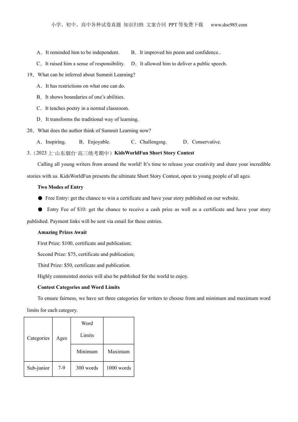 小学、初中、高中各种试卷真题知识归纳文案合同PPT等免费下载www.doc985.com专题验收评价专题07细节理解题内容概览A·常考题不丢分【命题点01直接信息题】【命题点02间接信息题】【微专题如何通原法定位理解的正确答案过还细节题】B·拓展培优拿高分C·挑战真题争满分【命题点01直接信息题】1.(2023·江苏·统考模拟预测片段)Avastmajorityofpeopleusuallyarguethatcyclingcanmakeasignificantcontributiontoourworld.Inreality,thereisagapbetweendesiredandactualnumbers.InGermany,forinstance,only20%oftheeverydayshort-distancetripsarecoveredbybicycle.Whenenquiringaboutthecauses,researchersfoundonepointrepeatedlytopsthelist:theperceivedorpotentialriskonthebikeroutesused.Increasingtheshareofcyclingtripsthusdependscruciallyonwell-developedbikepaths.However,designingefficientbikepathnetworksisacomplextaskthatinvolvesbalancingavarietyoflimitationswhilemeetingoveralldemand.Inaddition,manydistrictsareconfrontedwithashortageoffundsavailableforimprovingtheinfrastructure.Researchersproposeanewapproachtogeneratingefficientbikepathnetworks.Thisconsidersdemanddistributionandtherouteoptionofcyclistsbasedonpreferencesforsecure小学、初中、高中各种试卷真题知识归纳文案合同PPT等免费下载www.doc985.comoutings.Typically,minimizingthetraveldistanceisfarfromthesolelygoal.Aspectssuchasattractivenessofaroutearealsotakenintoaccount.14.Whatisachallengeforgoodbikepathnetworks?A.Tightbudgets.B.Complexroutes.C.Maximizedtraveldistance.D.Decreasingcyclingdemand.2.(2023·四川攀枝花·统考一模)WhenIfirstheardaboutSummitLearning,IadmittedIwasnotabithappyandexcitedatall.Ithoughtitwouldrequireinteractionswithothers.Butlater,IwasastonishedwhenIgottoexperienceitfirsthand.Recently,wedidapoetryproject,andoneoftheactivitieswasapeer(同伴)review.Iwouldneverhavetakenpartifitwasuptome,asIpreferredtoworkindependently.ButwhenIgotinvolved,Ifoundintheexperience,IhaddonesomethingthatIthoughtwasnearlyimpossible—itmademypoetrybetter.MypartnerinformedmeofmymistakesandtoldmewhereIcouldgivemoredetail.Oneofourfinalproductsoftheprojectwastopresentourpoetrytotheclass.I’vealwayslovedpublicspeakingbutIthoughtwithSummitLearning,Iwouldhavefewerchancestospeak.Iwaswrong.Thepeeractivitieswedidwithapartnergavememorebeliefinmyabilityandinspiredmetodomoretomakemypresentationthebestitcouldpossiblybe.InteractionslikethesearewhatSummitLearningisallabout.Thisstyleoflearningbringsapositiveandhard-workingculturethatallowsustopushourboundariesandkeepgoingItcreatesasenseofcommunitysinceweareallworkingtowardsasimilargoal.Asanactiveboy,Ihavealwaysbeenaheadandadvanced,butinanormalclassroom,therearerestrictionsonwhatIcando.WithSummitLearning,IcangobeyondexpectationsinprojectsormoveaheadinlearningnewcontentwhenI’mready.Ihaveownershipofmyworkandpursuemygoals.SummitLearninghasshowedmehowmuchpeoplecangrowandchange.Ithashelpedmeseepeopleandmyselfdifferently.Ithasbeenoneofthegreatestexperiencesofmylife,andIcannotseemyselfgoingbacktoanormalclassroom.17.Whatwastheauthor’sinitialresponsetoSummitLearning?A.Hewasastonishedtohearaboutit.B.Hewasabitexcitedaboutit.C.Hewasunwillingtoattendit.D.Hewascuriousabouthowitworked.18.Howdidtheauthorbenefitfromthepoetryproject?小学、初中、高中各种试卷真题知识归纳文案合同PPT等免费下载www.doc985.comA.Itremindedhimtobeindependent.B.Itimprovedhispoemandconfidence..C.Itraisedhimasenseofresponsibility.D.Itallowedhimtodeliverapublicspeech.19.Wh...