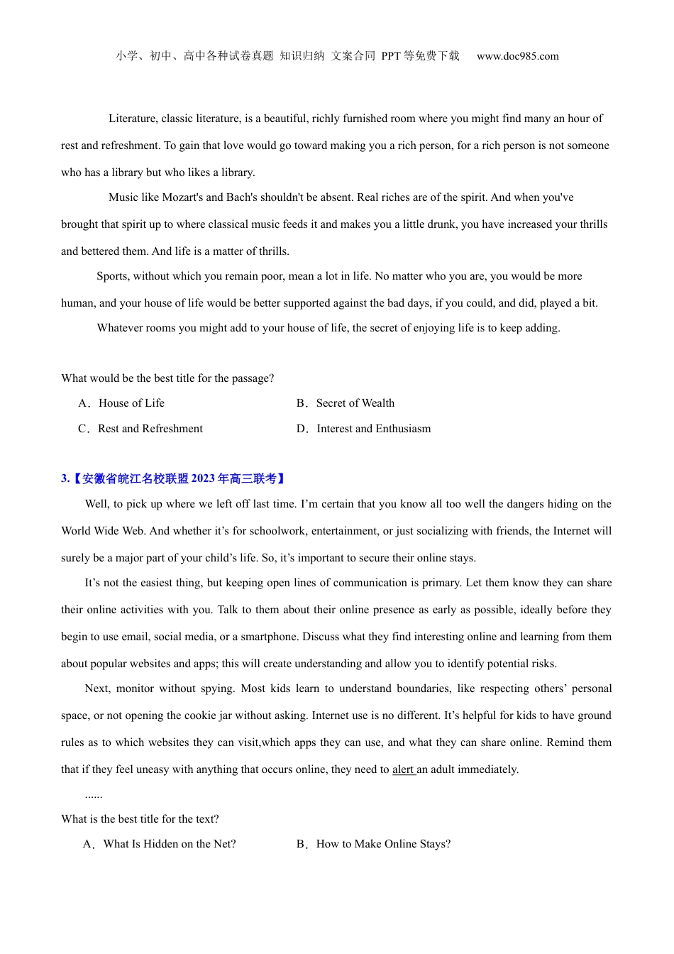 小学、初中、高中各种试卷真题知识归纳文案合同PPT等免费下载www.doc985.com专题验收评价专题10主旨大意题内容概览A·常考题不丢分【命题点01标题归纳题】【命题点02文章大意题】【命题点03段落大意题】【微专题主旨大意题易错陷阱】B·拓展培优拿高分C·挑战真题争满分【命题点01标题归纳题】1.【2023届浙江省四校(杭州二中、温州中学、绍兴一中、金华一中)高三5月联考】Intheanimalkingdom,mimics(模仿)arenotrare.Stickinsectspretendtobetwigs.Hawkmothcaterpillarsresemblepoisonoussnakes.Theexamples,though,arevisual.Auditorymimicryisrarer.DaniloRussooftheUniversityofNaplesFedericoIIthinkshehasfoundanovelcaseofit,ashedescribesinCurrentBiology.Somebats,hebelieves,mimicangrybeesinordertoscareawayowlsthatmightotherwiseeatthem.Dr.Russofirstnoticedbatbuzzingafewyearsago.Thenoisestruckhimassimilartothesoundofsomebees.Hewonderedwhetherbatbuzzingwasaformofmimicrywhichhelpedtoscareoffwould-bepredators.Totestthisidea,heandhiscolleaguesfirstrecordedthebuzzingthatcapturedbatsmade.Then,with小学、初中、高中各种试卷真题知识归纳文案合同PPT等免费下载www.doc985.comprotectiveclothing,theybeganthemoredangeroustaskofrecordingthebuzzingmadebydifferentbees.Computeranalysisrevealedthatbees’andbats’buzzingwere,indeed,similar.Thentheresearchersrecruitedseveralowls.Theyputtheowls,oneatatime,inanenclosurewithbranchesforthemtostayon,andtwoboxeswithholesinthem.Theyplacedaloudspeakeralongsideoneoftheboxesand,afterthebirdshadsettledin,broadcastthroughitfivesecondsofuninterruptedbatbuzzingandasimilaramountofinsectbuzzingthreetimesinarowforeachnoise.Asacontrol,theybroadcastinlikemannerseveralnon-buzzingsoundsmadebybats.Duringthebroadcastsandforfiveminutesthereafter,theyvideoedtheowls.Afteranalysis,theresultswereunequivocal.Whentheyheardboththebatbuzzingandthebeebuzzing,theowlsmovedasfarfromthespeakersastheycould.Incontrast,whenthenon-buzzingbatsoundswereplayed,theycreptcloser.Dr.Russobelievesthisisthefirstreportedcaseofamammalusingauditorymimicrytoscareawayapredator.Theystronglysuspect,however,thatitisnotunique.Anecdotessuggestseveralbirdsalsomakebuzzingnoiseswhentheirnestsaredisturbed.Andwiththeresultoftheexperiment,hethereforepredictsthatauditorymimicryisfarmorewidespreadthancurrentlyrealized.35.Whatisasuitabletitleforthetext?A.ANewTricktoScareAwayOwlsB.AnimalMimicry:BuzzoffC.ASelf-protectionBehavioramongAnimalsD.Bats:NoMoreVictimtoOwls2.【山东省曲阜师范大学附属中学2023-2024学年质量检测】Perhapsyouthinkyoucouldeasilyaddtoyourhappinesswithmoremoney.Strangeasitmayseem,ifyou'reunsatisfied,theissueisnotalackofmeanstomeetyourdesiresbutalackofdesires—notthatyoucannotsatisfyyourtastesbutthatyoudon'thaveenoughtastes.Realrichesconsistofwell-developedandheartycapacities(能力)toenjoylife.Mostpeoplearealreadyswamped(淹没)withthings.Theyeat,wear,goandtalktoomuch.Theyliveintoobigahousewithtoomanyrooms,yettheirhouseoflifeisahut.Yourhouseoflifeoughttobeamansion(豪宅),aroyalpalace.Everynewtaste,everyadditionalinterest,everyfreshenthusiasmaddsaroom.Hereareseveralroomsyourhouseoflifeshouldhave.Artshouldbeadesireforyoutodevelopsimplybecausetheworldisfullofbeautifulthings.Ifyouonlyunderstoodhowtoenjoythemandfeedyourspiritonthem,theywouldmakeyouashappyastofindplentyofhamburgersandeggswhenyou'rehungry.小学、初中、高中各种试卷真题知识归纳文案合同PPT等免费下载www.doc985.comLiterature,classicliterature,isabeautiful,richlyfurnishedroomwhereyoumightfin...