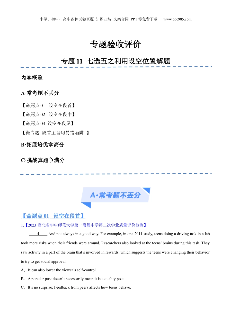 小学、初中、高中各种试卷真题知识归纳文案合同PPT等免费下载www.doc985.com专题验收评价专题11七选五之利用设空位置解题内容概览A·常考题不丢分【命题点01设空在段首】【命题点02设空在段中】【命题点03设空在段尾】【微专题段首主旨句易错陷阱】B·拓展培优拿高分C·挑战真题争满分【命题点01设空在段首】1.【2023·湖北省华中师范大学第一附属中学第二次学业质量评价检测】____4____Andnotalwaysinagoodway.Forexample,inone2011study,teensdoingadrivingtaskinalabtookmoreriskswhentheirfriendswerearound.Researchersalsolookedattheteens’brainsduringthistask.Theysawactivityinapartofthebrainthat’sinvolvedinrewards,whichsuggeststheteenswerechangingtheirbehaviortotrytogetsocialapproval.A.Itcanalsolowertheviewer’sself-control.B.Apopularpostdoesn’tnecessarilymeanitisaqualitypost.C.It’snosurprise:Feedbackfrompeersaffectshowteensbehave.小学、初中、高中各种试卷真题知识归纳文案合同PPT等免费下载www.doc985.comD.Theirbrainsrespondtothoselikesbyturningontherewardcenter.E.Andthatcan,inappropriately,makeusfeellesssuccessfulthanthem.F.Butthose“likes”canhavepowerthatgoesbeyondasimpleconnection.G.Mostofwhattheydoisreadandrespondtopostsbyfriendsandfamily.2.【2023·江苏省苏北七市高三二模】●____3____Youcannotachievethemunlessyouunderstandyourneedsandintentions.Itiseasiersaidthandonebecausemostpeoplefailtomakeanefforttoknowthemselves.Spendtimethinkingoverandknowingyourstrengthsandweaknesses.Onceyouknowyourselfbetter,youcancreateaplantoworktowardsbecomingmorepatient,honest,andforgiving.A.Knowyourselfbetter.B.Acceptthepersonyouare.C.Lifecanbealotbetterwiththerightdecisions.D.Itisahealthychoicethatenablesyoutobehappy.E.Pickitasadailyhabit,andyouwillnoticethedifference.F.Thewayyouspendyourtimedeterminesthecourseofyourlife.G.Thebestwaytobuildself-beliefisbyreflectingonyourownthoughts.3.【2023·安徽省皖江联盟高三最后一卷联考】____39____Askyourselfwhysomanypeoplearedrawntocountlesstraveltripsordestinations.Evenifyoudisagreewitheverythingthattravelagenciessay,exploringtheviewpointsmightexplainwhysomeroutesthatdon’tseemvalidtoyouappealtoothers.Thiswillallowyoutoexplorealternatives,evaluateyourownchoices,andultimatelyhelpyoumakemoreinformeddecisions.A.Exploreotherpointsofview.B.Applytheinformationcollected.C.Inotherwords,gettoknowwhatyou’relookingfor.D.Thenwhataboutthelong-termenvironmentaleffects?E.Butitcanhelpusincreasethenumberofpositivechoiceswemake.F.Therefore,askyourselfaboutwhatinterestsyoumostandwhatisneeded.小学、初中、高中各种试卷真题知识归纳文案合同PPT等免费下载www.doc985.comG.Ithelpsyouweighdifferentoptions,movingyouclosertoawiserdecision.4.【2023·湖北省十一校第二次联考】Butifyou’rea‘glasshalfempty’typeofperson,couldseeingtheworldthroughrose-tintedglassesworkforyou?Everybeanhasitsblack.____4____Somepeoplesayit’sbesttocelebratethepositivesandignorethenegativepartsofourlives.____5____.VickiSiskasays“Musicfeedsmysoul,asenseofhumourkeepsthingsinperspective”.PippaKennedysays“beinggratefulforwhatyouhave!”Otherpeoplerecommenddoingyogaandmeditationaswellasstayingfittohelpmaintainapositiveoutlookonlife.A.AcceptingthishelpsuscontrolouremotionsB.AcceptitandmakeeffortstoimproveyourselfC.it’spossiblethatoptimistsbetterhandleinfectionsD.ButhavingthismindsetcouldhavemanybenefitsE.ButitcouldhelpyouhaveapositiveoutlookonlifeF.itmightencourageyoutohaveamorehopefuloutlookonlifeG.Peoplehavetheirpe...