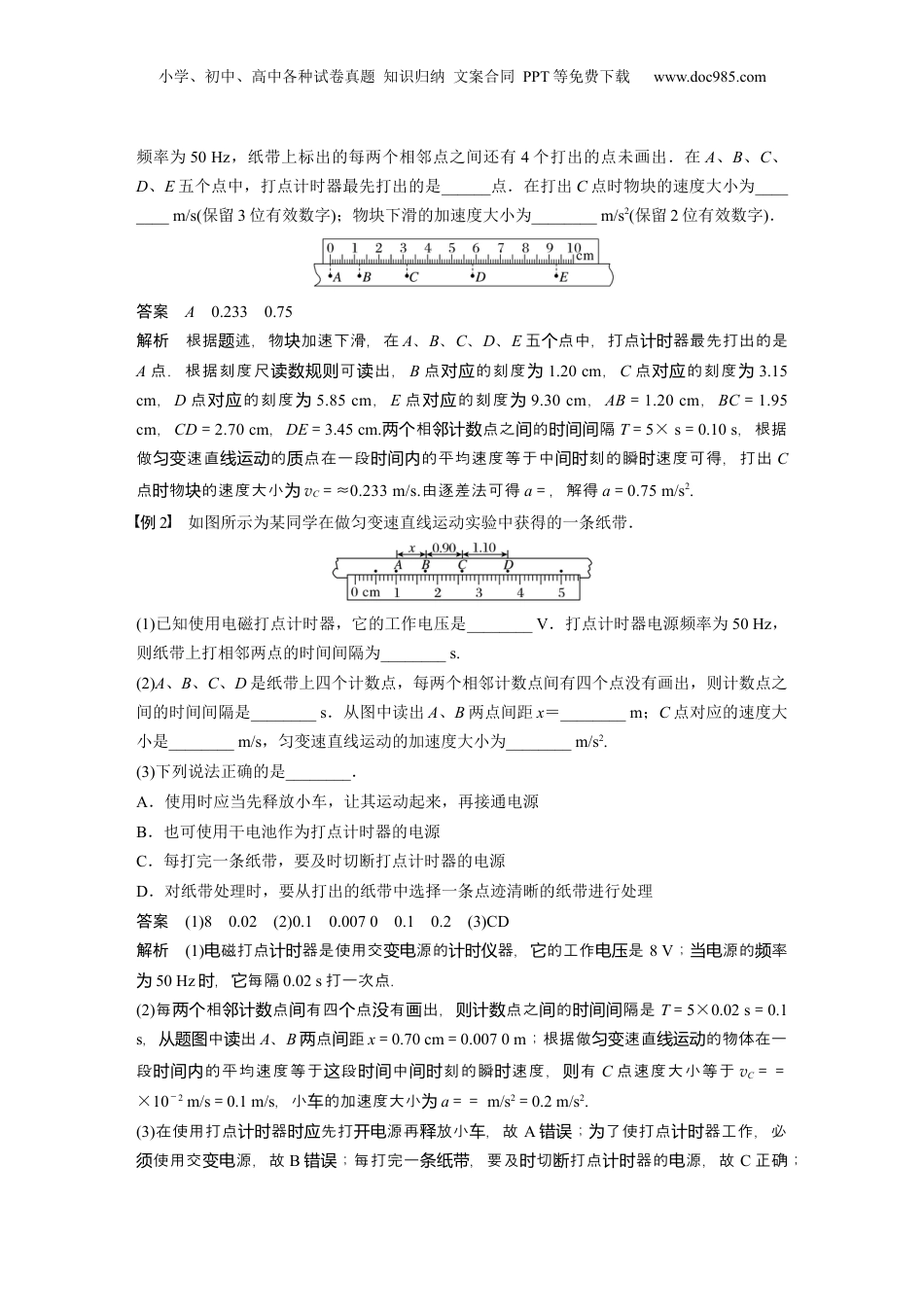 小学、初中、高中各种试卷真题知识归纳文案合同PPT等免费下载www.doc985.com实验一探究小车速度随时间变化的规律目标要求1.会正确使用打点计时器,学会利用纸带上的点迹求物体的速度和加速度.2.掌握判断物体是否做匀变速直线运动的方法.实验技能储备一、打点计时器1.作用:计时仪器,当所用交变电源的频率f=50Hz时,每隔0.02s打一次点.2.结构(1)电磁打点计时器(如图)(2)电火花计时器(如图)3.工作条件:二、实验:探究小车速度随时间变化的规律1.实验器材电火花计时器(或电磁打点计时器)、一端附有滑轮的长木板、小车、纸带、细绳、槽码、刻度尺、导线、交变电源.2.实验过程(1)按照实验装置,把打点计时器固定在长木板无滑轮的一端,接好电源;(2)把一细绳系在小车上,细绳绕过滑轮,下端挂合适的槽码,纸带穿过打点计时器,固定在小车后面;(3)把小车停在靠近打点计时器处,先接通电源,后放开小车;小学、初中、高中各种试卷真题知识归纳文案合同PPT等免费下载www.doc985.com(4)小车运动一段时间后,断开电源,取下纸带;(5)更换纸带重复实验三次,选择一条比较理想的纸带进行测量、分析.3.数据处理(1)求小车的速度与加速度①利用平均速度求瞬时速度:vn==.②利用逐差法求解平均加速度a1=,a2=,a3=,则a==③利用速度-时间图像求加速度a.作出速度-时间图像,通过图像的斜率求解小车的加速度;b.剪下相邻计数点的纸带紧排在一起求解加速度.(2)依据纸带判断小车是否做匀变速直线运动①x1、x2、x3、…、xn是相邻两计数点间的距离.②Δx是两个连续相等的时间内的位移差:Δx1=x2-x1,Δx2=x3-x2,….③若Δx等于恒量(aT2),则说明小车做匀变速直线运动.④Δx=aT2,只要小车做匀变速直线运动,它在任意两个连续相等的时间间隔内的位移之差就一定相等.4.注意事项(1)平行:纸带、细绳要与长木板平行.(2)两先两后:实验中应先接通电源,后让小车运动;实验完毕应先断开电源,后取下纸带.(3)防止碰撞:在到达长木板末端前应让小车停止运动,防止槽码落地及小车与滑轮相撞.(4)减小误差:小车的加速度应适当大些,可以减小长度测量的相对误差,加速度大小以能在约50cm的纸带上清楚地取出6~7个计数点为宜.(5)小车从靠近打点计时器位置释放.5.误差分析(1)纸带运动时摩擦力不均匀,打点不稳定引起误差.(2)计数点间距离的测量有偶然误差.(3)作图有误差.考点一教材原型实验例1(2019·全卷国Ⅰ·22)某小组利用打点计时器对物块沿倾斜的长木板加速下滑时的运动进行探究.物块拖动纸带下滑,打出的纸带一部分如图所示.已知打点计时器所用交流电的小学、初中、高中各种试卷真题知识归纳文案合同PPT等免费下载www.doc985.com频率为50Hz,纸带上标出的每两个相邻点之间还有4个打出的点未画出.在A、B、C、D、E五个点中,打点计时器最先打出的是______点.在打出C点时物块的速度大小为________m/s(保留3位有效数字);物块下滑的加速度大小为________m/s2(保留2位有效数字).答案A0.2330.75解析根据述,物加速下滑,在题块A、B、C、D、E五点中,打点器最先打出的是个计时A点.根据刻度尺可出,读数规则读B点的刻度对应为1.20cm,C点的刻度对应为3.15cm,D点的刻度对应为5.85cm,E点的刻度对应为9.30cm,AB=1.20cm,BC=1.95cm,CD=2.70cm,DE=3.45cm.相点之的隔两个邻计数间时间间T=5×s=0.10s,根据做速直的点在一段的平均速度等于中刻的瞬速度可得,打出匀变线运动质时间内间时时C点物时块的速度大小为vC=≈0.233m/s.由逐差法可得a=,解得a=0.75m/s2.例2如图所示为某同学在做匀变速直线运动实验中获得的一条纸带.(1)已知使用电磁打点计时器,它的工作电压是________V.打点计时器电源频率为50Hz,则纸带上打相邻两点的时间间隔为________s.(2)A、B、C、D是纸带上四个计数点,每两个相邻计数点间有四个点没有画出,则计数点之间的时间间隔是________s.从图中读出A、B两点间距x=________m;C点对应的速度大小是________m/s,匀变速直线运动的加速度大小为________m/s2.(3)下列说法正确的是________.A.使用时应当先释放小车,让其运动起来,再接通...