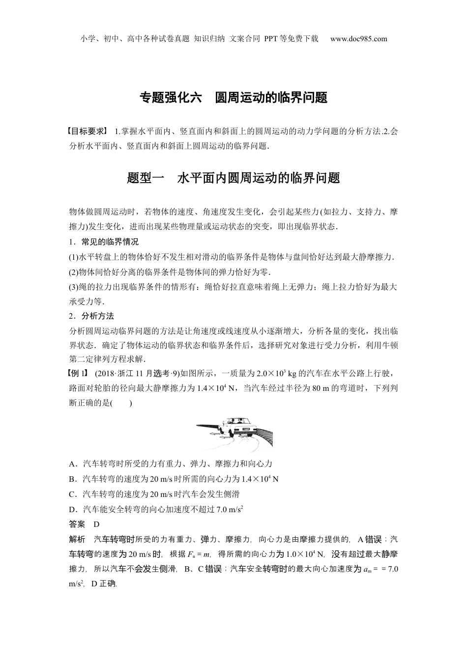 小学、初中、高中各种试卷真题知识归纳文案合同PPT等免费下载www.doc985.com专题强化六圆周运动的临界问题目标要求1.掌握水平面内、竖直面内和斜面上的圆周运动的动力学问题的分析方法.2.会分析水平面内、竖直面内和斜面上圆周运动的临界问题.题型一水平面内圆周运动的临界问题物体做圆周运动时,若物体的速度、角速度发生变化,会引起某些力(如拉力、支持力、摩擦力)发生变化,进而出现某些物理量或运动状态的突变,即出现临界状态.1.常见的临界情况(1)水平转盘上的物体恰好不发生相对滑动的临界条件是物体与盘间恰好达到最大静摩擦力.(2)物体间恰好分离的临界条件是物体间的弹力恰好为零.(3)绳的拉力出现临界条件的情形有:绳恰好拉直意味着绳上无弹力;绳上拉力恰好为最大承受力等.2.分析方法分析圆周运动临界问题的方法是让角速度或线速度从小逐渐增大,分析各量的变化,找出临界状态.确定了物体运动的临界状态和临界条件后,选择研究对象进行受力分析,利用牛顿第二定律列方程求解.例1(2018·浙江11月考选·9)如图所示,一质量为2.0×103kg的汽车在水平公路上行驶,路面对轮胎的径向最大静摩擦力为1.4×104N,当汽车经过半径为80m的弯道时,下列判断正确的是()A.汽车转弯时所受的力有重力、弹力、摩擦力和向心力B.汽车转弯的速度为20m/s时所需的向心力为1.4×104NC.汽车转弯的速度为20m/s时汽车会发生侧滑D.汽车能安全转弯的向心加速度不超过7.0m/s2答案D解析汽所受的力有重力、力、摩擦力,向心力是由摩擦力提供的,车转弯时弹A;汽错误的速度车转弯为20m/s,根据时Fn=m,得所需的向心力为1.0×104N,有超最大摩没过静擦力,所以汽不生滑,车会发侧B、C;汽安全的最大向心加速度错误车转弯时为am==7.0m/s2,D正确.小学、初中、高中各种试卷真题知识归纳文案合同PPT等免费下载www.doc985.com例2(多选)如图所示,两个质量均为m的小木块a和b(可视为质点)放在水平圆盘上,a与转轴OO′的距离为l,b与转轴的距离为2l.木块与圆盘间的最大静摩擦力为木块所受重力的k倍,重力加速度大小为g.若圆盘从静止开始绕转轴缓慢地加速转动,用ω表示圆盘转动的角速度,且最大静摩擦力等于滑动摩擦力,下列说法正确的是()A.b一定比a先开始滑动B.a、b所受的摩擦力始终相等C.ω=是b开始滑动的临界角速度D.当ω=时,a所受摩擦力的大小为kmg答案AC解析小木块a、b做周,由摩擦力提供向心力,即圆运动时静Ff=mω2R.角速度增大,当时摩擦力增大,增大到最大摩擦力,生相滑,木静当静时发对动对块a有Ffa=mωa2l,当Ffa=kmg,时kmg=mωa2l,ωa=;木对块b有Ffb=mωb2·2l,当Ffb=kmg,时kmg=mωb2·2l,ωb=,则ω=是b始滑的界角速度,所以开动临b先到最大摩擦力,即达静b比a先始滑开动,选项A、C正确;木滑前的角速度相同,两块动转动则Ffa=mω2l,则Ffb=mω2·2l,Ffa<Ffb,选项B;错误ω=<ωa=,a有滑,没动则Ffa′=mω2l=kmg,选项D.错误例3细绳一端系住一个质量为m的小球(可视为质点),另一端固定在光滑水平桌面上方h高度处,绳长l大于h,使小球在桌面上做如图所示的匀速圆周运动,重力加速度为g.若要小球不离开桌面,其转速不得超过()A.B.2πC.D.答案D解析小球受力分析,小球受三力的作用,重力对个mg、水平面支持力桌FN、子拉力绳F.小球所受合力提供向心力,子直方向角设绳与竖夹为θ,由几何系可知关R=htanθ,受力分析可知Fcosθ+FN=mg,Fsinθ=m=mω2R=4mπ2n2R=4mπ2n2htanθ;球即离水平当将开桌面,时FN=0,速转n有最大,此值时nm=,故选D.例4(多选)(2023·湖北省公安等六县县质检)如图所示,AB为竖直放置的光滑圆筒,一根长细绳穿过圆筒后一端连着质量为m1=5kg的小球(可视为质点),另一端和细绳BC(悬点为B)在结点C处共同连着一质量为m2的小球(可视为质点),长细绳能承受的最大拉力为60N,细绳BC能承受的最大拉力为27.6N.圆筒顶端A到C点的距离l1=1.5m,细绳BC刚小学、初中、高中各种试卷真题知识归纳文案合同PPT等免费下载www.doc985.com好被水平拉直时长l2=0.9m,转动圆筒并逐渐缓慢增大角速度,在BC绳被拉直之前,用手拿着m1,保证...