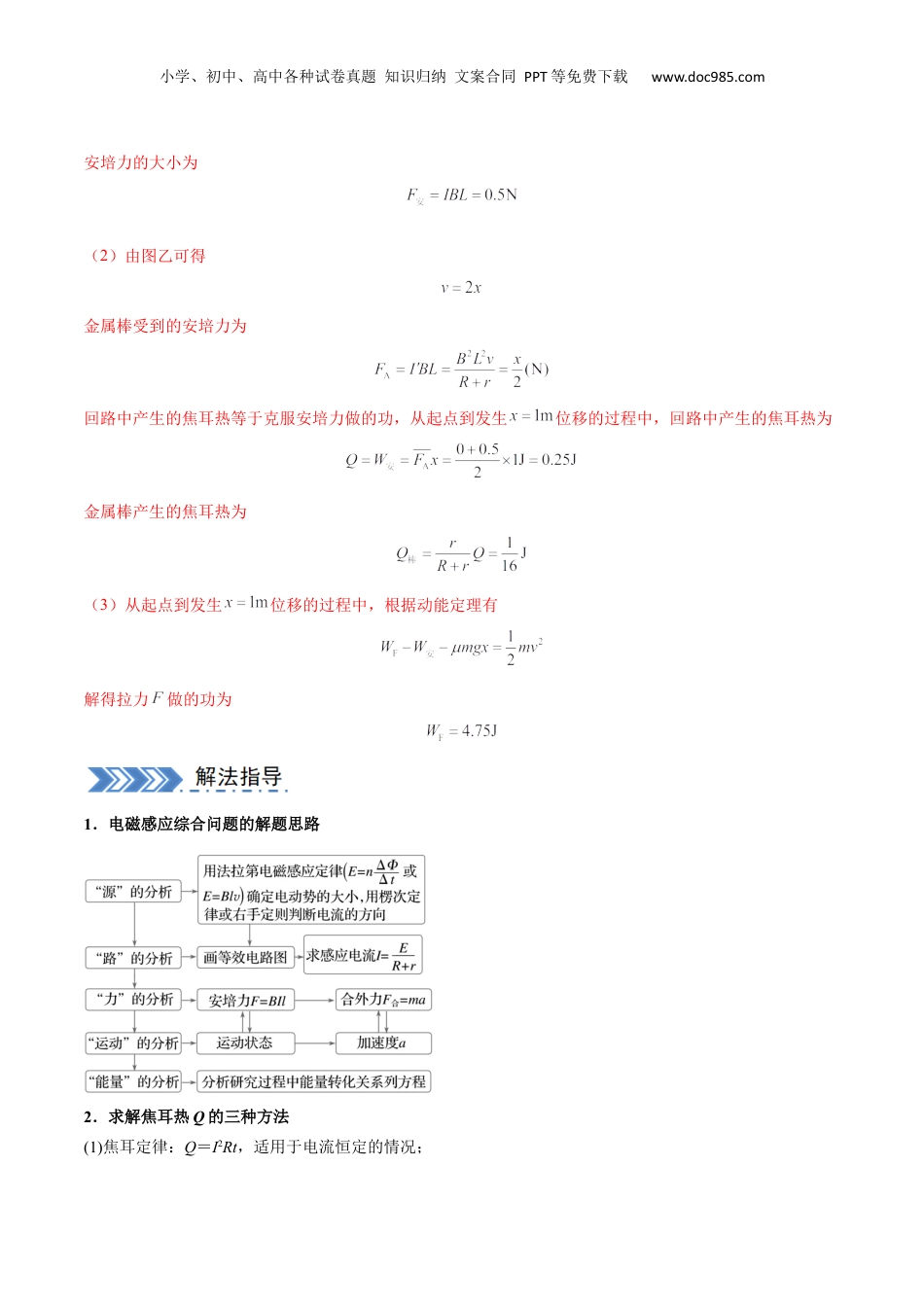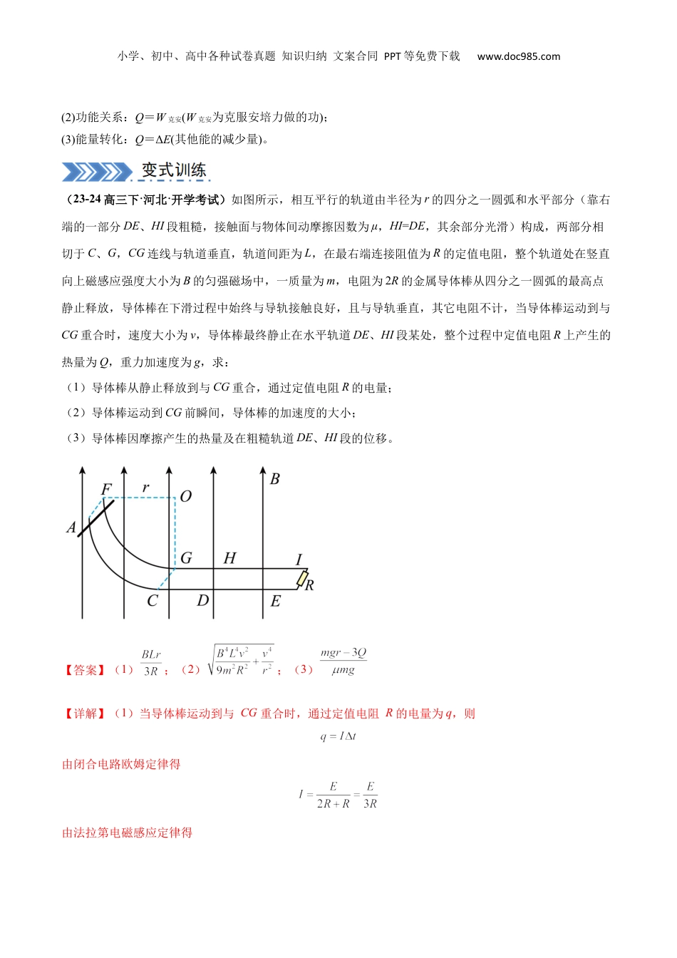 小学、初中、高中各种试卷真题知识归纳文案合同PPT等免费下载www.doc985.com大题10电磁感应综合问题1.掌握应用动量定理处理电磁感应问题的思路。2.掌握应用动量守恒定律处理电磁感应问题的方法。3.熟练应用楞次定律与法拉第电磁感应定律解决问题。4.会分析电磁感应中的图像问题。5.会分析电磁感应中的动力学与能量问题。电磁感应中的动力学与能量问题【例1】(2024·河北·模拟预测)如图甲所示,水平粗糙导轨左侧接有定值电阻,导轨处于垂直纸面向外的匀强磁场中,磁感应强度,导轨间距。一质量,阻值的金属棒在水平向右拉力作用下由静止开始从处运动,金属棒与导轨间动摩擦因数,金属棒的图像如图乙所示,取,求:(1)时,安培力的大小;(2)从起点到发生位移的过程中,金属棒产生的焦耳热;(3)从起点到发生位移的过程中,拉力做的功。【答案】(1);(2);(3)【详解】(1)由图乙可知,时,,回路中电流为小学、初中、高中各种试卷真题知识归纳文案合同PPT等免费下载www.doc985.com安培力的大小为(2)由图乙可得金属棒受到的安培力为回路中产生的焦耳热等于克服安培力做的功,从起点到发生位移的过程中,回路中产生的焦耳热为金属棒产生的焦耳热为(3)从起点到发生位移的过程中,根据动能定理有解得拉力做的功为1.电磁感应综合问题的解题思路2.求解焦耳热Q的三种方法(1)焦耳定律:Q=I2Rt,适用于电流恒定的情况;小学、初中、高中各种试卷真题知识归纳文案合同PPT等免费下载www.doc985.com(2)功能关系:Q=W克安(W克安为克服安培力做的功);(3)能量转化:Q=ΔE(其他能的减少量)。(23-24高三下·河北·开学考试)如图所示,相互平行的轨道由半径为r的四分之一圆弧和水平部分(靠右端的一部分DE、HI段粗糙,接触面与物体间动摩擦因数为μ,HI=DE,其余部分光滑)构成,两部分相切于C、G,CG连线与轨道垂直,轨道间距为L,在最右端连接阻值为R的定值电阻,整个轨道处在竖直向上磁感应强度大小为B的匀强磁场中,一质量为m,电阻为2R的金属导体棒从四分之一圆弧的最高点静止释放,导体棒在下滑过程中始终与导轨接触良好,且与导轨垂直,其它电阻不计,当导体棒运动到与CG重合时,速度大小为v,导体棒最终静止在水平轨道DE、HI段某处,整个过程中定值电阻R上产生的热量为Q,重力加速度为g,求:(1)导体棒从静止释放到与CG重合,通过定值电阻R的电量;(2)导体棒运动到CG前瞬间,导体棒的加速度的大小;(3)导体棒因摩擦产生的热量及在粗糙轨道DE、HI段的位移。【答案】(1);(2);(3)【详解】(1)当导体棒运动到与CG重合时,通过定值电阻R的电量为q,则由闭合电路欧姆定律得由法拉第电磁感应定律得小学、初中、高中各种试卷真题知识归纳文案合同PPT等免费下载www.doc985.com解得(2)导体棒刚运动到CG时,回路中的瞬时电动势回路中的电流导体棒受到的安培力水平方向的加速度导体棒做圆周运动的向心加速度所以导体棒运动到CG前瞬间,导体棒的加速度的大小为(3)由于导体棒与定值电阻串联,因此导体棒上产生的热量为2Q,根据能量守恒定律可知,导体棒因与轨道摩擦产生的热量导体棒因摩擦产生的热量等于导体棒克服摩擦力所做的功解得粗糙轨道DE、HI段的位移大小为动量观点在电磁感应中的应用【例2】(23-24高三下·四川成都·开学考试)如图所示,足够长的运输带沿倾角α=30°的方向固定,且运小学、初中、高中各种试卷真题知识归纳文案合同PPT等免费下载www.doc985.com输带以v0的速度向上匀速传动,虚线1、2间存在垂直运输带向下的匀强磁场,磁感应强度大小为B,质量为m、电阻值为R、边长为d0的正方形导线框随运输带共同向上运动,经过一段时间ab边越过虚线1,且导线框相对运输带发生运动,当ab边刚好到达虚[信息]导线框完全进入磁场后,导线框中无感应电流,运输带带动导线框加速运动线2瞬间导线框的速度恢复到v0,已知虚线间的距离为L,且L>2d0,导线框与运输带之间的动摩擦因数为μ=,重力加速度为g,整个过程导线框的ab边始终与两虚线平行。求:(1)ab边刚越过虚线1瞬间的加速度大小以及方向;(2)导线框的ab边由虚线1运动到虚线2的时间;(3)导线框的ab...