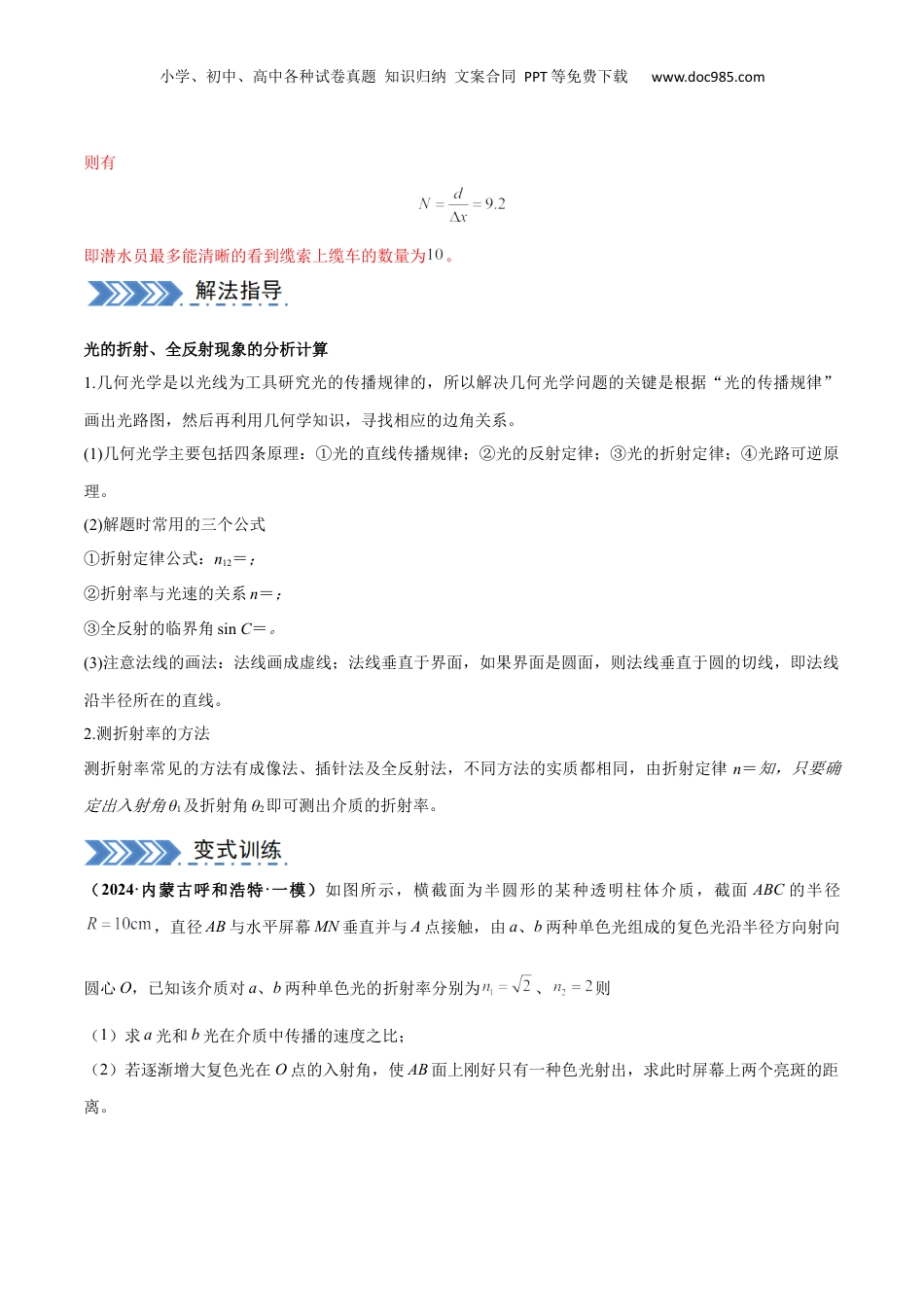 小学、初中、高中各种试卷真题知识归纳文案合同PPT等免费下载www.doc985.com大题13几何光学光学时高中物理的边缘模块,但在历年高考中都有多以计算题的形式出现分值一般10分。其中以光的折射、全反射等为命题载体,重点考察学生光路的绘制尤其是临界光线的寻找以及应用数学知识解决物理问题的能力。【例1】(23-24高三下·广东佛山·阶段练习)在一个平静的湖面上,距离水面高度处有一条水平缆索,缆索上每隔就从站台以速度沿一个方向持续开出一辆缆车。湖水深,缆索中央正下方的湖底有一员潜水员,该潜水员只能看到湖面半径的圆面有亮光,又在透过湖面半径的圆面上才能清晰的看到缆索上的缆车。已知,,,求:(1)湖水的折射率的大小(用分式表示);(2)潜水员最多能清晰的看到缆索上缆车的数量。【答案】(1);(2)【详解】(1)根据题意可知,由于潜水员只能看到湖面半径的圆面有亮光,如图所示小学、初中、高中各种试卷真题知识归纳文案合同PPT等免费下载www.doc985.com则有解得(2)潜水员透过湖面半径的圆面看到缆索,如图所示由几何关系有,又有解得由对称性可知,潜水员透过湖面半径的圆面看到缆索长度为由题意可知,相邻缆车间的距离为小学、初中、高中各种试卷真题知识归纳文案合同PPT等免费下载www.doc985.com则有即潜水员最多能清晰的看到缆索上缆车的数量为。光的折射、全反射现象的分析计算1.几何光学是以光线为工具研究光的传播规律的,所以解决几何光学问题的关键是根据“光的传播规律”画出光路图,然后再利用几何学知识,寻找相应的边角关系。(1)几何光学主要包括四条原理:①光的直线传播规律;②光的反射定律;③光的折射定律;④光路可逆原理。(2)解题时常用的三个公式①折射定律公式:n12=;②折射率与光速的关系n=;③全反射的临界角sinC=。(3)注意法线的画法:法线画成虚线;法线垂直于界面,如果界面是圆面,则法线垂直于圆的切线,即法线沿半径所在的直线。2.测折射率的方法测折射率常见的方法有成像法、插针法及全反射法,不同方法的实质都相同,由折射定律n=知,只要确定出入射角θ1及折射角θ2即可测出介质的折射率。(2024·内蒙古呼和浩特·一模)如图所示,横截面为半圆形的某种透明柱体介质,截面ABC的半径,直径AB与水平屏幕MN垂直并与A点接触,由a、b两种单色光组成的复色光沿半径方向射向圆心O,已知该介质对a、b两种单色光的折射率分别为、则(1)求a光和b光在介质中传播的速度之比;(2)若逐渐增大复色光在O点的入射角,使AB面上刚好只有一种色光射出,求此时屏幕上两个亮斑的距离。小学、初中、高中各种试卷真题知识归纳文案合同PPT等免费下载www.doc985.com【答案】(1);(2)【详解】(1)设光在介质中传播速度为,由折射率定律得,所以光在介质中传播速度之比(2)光在介质的面上发生全反射的临界角分别为,由全反射规律得,解得所以增大入射角时光先发生全反射,光路图如图所示此时光入射角因为所以根据折射定律解得小学、初中、高中各种试卷真题知识归纳文案合同PPT等免费下载www.doc985.com所以则1.(2024·四川泸州·二模)如图所示,光源S位于装有某液体的容器底部,容器右侧的内壁固定一平面镜,平面镜上端与容器顶端平齐、下端与液面平齐。光源S沿方向发射一束红光,经O点折射后照到平面镜上的P点,反射光线刚好过容器左侧上端点Q。已知入射角,容器宽度为,反射点P分别到平面镜上端点M、下端点N的距离为、,液体深度为,光在真空中的传播速度,,。求:(1)红光在该液体中的折射率n;(2)这束红光在液体中的传播时间。【答案】(1);(2)【详解】(1)根据几何关系可知在MN平面发生的反射,入射角符合小学、初中、高中各种试卷真题知识归纳文案合同PPT等免费下载www.doc985.com则则光从液体中射出时的折射角根据折射定律可知(2)传播距离红光在液体中的传播速度这束红光在液体中的传播时间2.(23-24高三下·重庆·阶段练习)如图,一束很细的光线A从空气中射入半径为R的玻璃球的右上方,在玻璃球内表面发生一次反射,最后从玻璃球左上方射出。已知入射光线与球心的距离为,出射光线与入射光线平行,光速为c。...