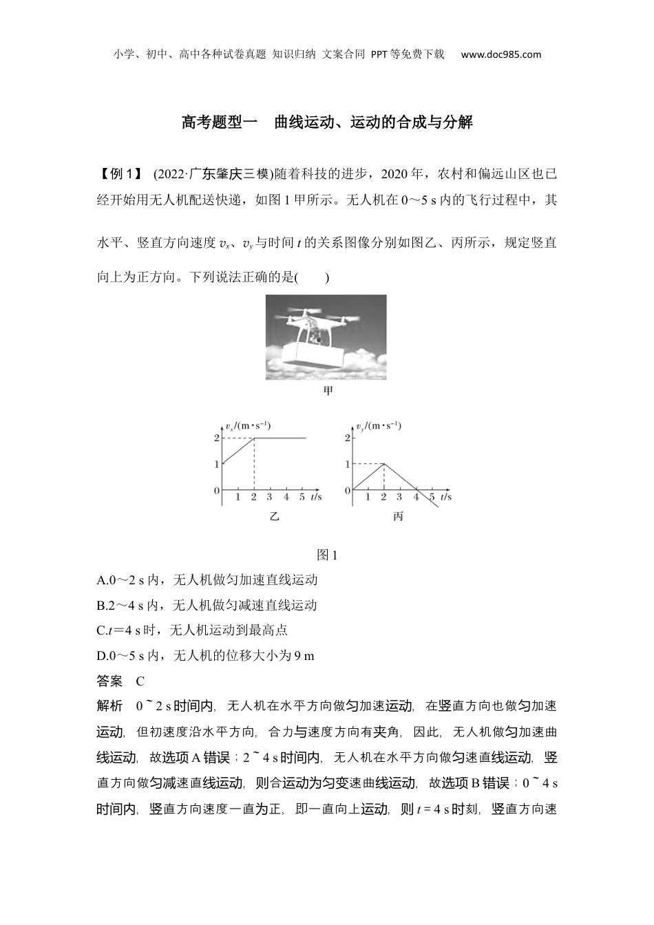 小学、初中、高中各种试卷真题知识归纳文案合同PPT等免费下载www.doc985.com第4课时力与曲线运动内容重要的规律、公式和二级结论1.运动的合成与分解(1)小船垂直河岸过河时,所用时间最短。(2)小船过河时,船速大于水速,船才能垂直河岸过河。(3)绳端物体速度分解规律:分解为沿绳方向和垂直于绳方向两个分速度。2.曲线运动中质点的速度、加速度(4)曲线运动中质点的速度方向时刻改变,总沿该点的切线方向。(5)曲线运动中质点所受合外力方向指向曲线弯曲的凹侧。3.抛体运动(6)平抛运动的速度的反向延长线一定过水平位移的中点。(7)在斜面上做平抛运动时,落到斜面上的速度方向与斜面的夹角不变。4.匀速圆周运动、圆周运动的向心力(8)圆锥摆、火车转弯、漏斗壁上的小球在水平面内做匀速圆周运动,F向=mgtanθ,方向水平,指向圆心。(9)水流星最高点最小速度为,最低点最小速度为,上下两点拉力之差为6mg。(10)小球在“杆”模型最高点vmin=0,v临=v>v临,杆对小球有向下的拉力;v=v临,杆对小球的作用力为零;v<v临,杆对小球有向上的支持力。小学、初中、高中各种试卷真题知识归纳文案合同PPT等免费下载www.doc985.com高考题型一曲线运动、运动的合成与分解【例1】(2022·广肇三模东庆)随着科技的进步,2020年,农村和偏远山区也已经开始用无人机配送快递,如图1甲所示。无人机在0~5s内的飞行过程中,其水平、竖直方向速度vx、vy与时间t的关系图像分别如图乙、丙所示,规定竖直向上为正方向。下列说法正确的是()图1A.0~2s内,无人机做匀加速直线运动B.2~4s内,无人机做匀减速直线运动C.t=4s时,无人机运动到最高点D.0~5s内,无人机的位移大小为9m答案C解析0~2s,无人机在水平方向做加速,在直方向也做加速时间内匀运动竖匀,但初速度沿水平方向,合力速度方向有角,因此,无人机做加速曲运动与夹匀,故线运动选项A;错误2~4s,无人机在水平方向做速直,时间内匀线运动竖直方向做速直,合速曲,故匀减线运动则运动为匀变线运动选项B;错误0~4s,直方向速度一直正,即一直向上,时间内竖为运动则t=4s刻,直方向速时竖小学、初中、高中各种试卷真题知识归纳文案合同PPT等免费下载www.doc985.com度为0,所以,无人机到最高点,故运动选项C正确;0~5s,无人机的水平内位移为x=9m,直位移竖为y=1.75m,合位移则为s=,不等于9m,选项D。错误【素能提升】1.(2022·广惠州模东拟)质量为m的物体P置于倾角为θ1的固定光滑斜面上,轻细绳跨过光滑定滑轮分别连接着P与小车,P与滑轮间的细绳平行于斜面,小车以速率v水平向右做匀速直线运动。当小车与滑轮间的细绳和水平方向成夹角θ2时(如图2),下列判断正确的是()图2A.P的速率为vB.P的速率为vsinθ2C.P处于超重状态D.P处于失重状态答案C解析小的速度将车v行分解如所示,有进图则vP=vcosθ2,选项A、B;错误小向右,车运动θ2小,减v不,变则vP逐增大,明物体渐说P沿斜面向上做加速,于超重,运动处状态选项C正确,D。错误2.发高远球是羽毛球运动中的一项基本技能。某同学发高远球,球的运动轨迹如图3所示,假设此过程中羽毛球竖直方向所受空气阻力大小保持不变,以竖直向上为正方向,则下列关于羽毛球竖直方向的位移—时间图像中,可能正确的是()小学、初中、高中各种试卷真题知识归纳文案合同PPT等免费下载www.doc985.com图3答案A解析羽毛球上升段,直方向的速度逐小,像的斜率逐小,在最阶竖渐减图渐减高点,直方向的速度零,即像的斜率零;羽毛球下落段,直方向的竖为图为阶竖速度逐增大,像的斜率逐增大。羽毛球上升段直方向的合力大,加渐图渐阶竖较速度大,根据速直的律,羽毛球上升段直方向的初速度大于较匀变线运动规阶竖下降段直方向的末速度,即羽毛球上升段直方向的平均速度大,上升阶竖阶竖较短。上所述,只有时间较综选项A正确。高考题型二抛体运动处理平抛(类平抛)运动的四条注意事项(1)处理平抛运动(或类平抛运动)时,一般将运动沿初速度方向和垂直于初速度方向进行分解,先按分运动规律列式,再用运动的合成求合运动。(2)对于在斜面上平抛又落到斜面上的问题,其竖直位移与水平位移之比等于斜面倾角的正切值。...