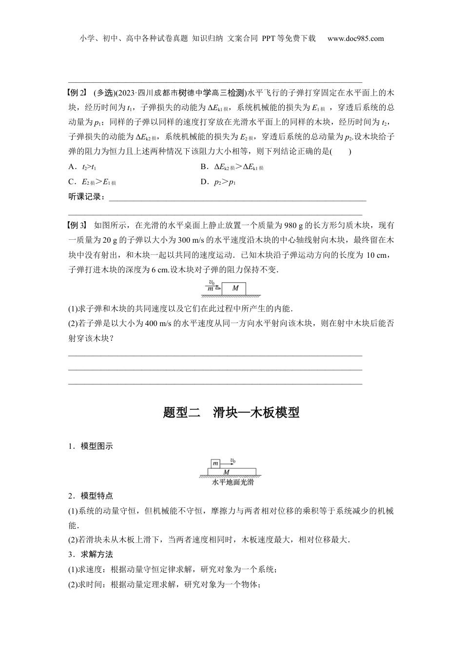 小学、初中、高中各种试卷真题知识归纳文案合同PPT等免费下载www.doc985.com专题强化十一动量守恒在子弹打木块模型和板块模型中的应用目标要求1.会用动量观点和能量观点分析计算子弹打木块模型.2.会用动量观点和能量观点分析计算滑块—木板模型.题型一子弹打木块模型1.模型图示2.模型特点(1)子弹水平打进木块的过程中,系统的动量守恒.(2)系统的机械能有损失.3.两种情景(1)子弹嵌入木块中,两者速度相等,机械能损失最多(完全非弹性碰撞)动量守恒:mv0=(m+M)v能量守恒:Q=Ff·s=mv02-(M+m)v2(2)子弹穿透木块动量守恒:mv0=mv1+Mv2能量守恒:Q=Ff·d=mv02-(Mv22+mv12)例1(多选)如图所示,两个质量和速度均相同的子弹分别水平射入静止在光滑水平地面上质量相等、材料不同的两矩形滑块A、B中,射入A中的深度是射入B中深度的两倍.已知A、B足够长,两种射入过程相比较()A.射入滑块A的子弹速度变化大B.整个射入过程中两滑块受的冲量一样大C.射入滑块A中时阻力对子弹做功是射入滑块B中时的两倍D.两个过程中系统产生的热量相等听课记录:______________________________________________________________小学、初中、高中各种试卷真题知识归纳文案合同PPT等免费下载www.doc985.com________________________________________________________________________例2(多选)(2023·四川成都市德中高三树学检测)水平飞行的子弹打穿固定在水平面上的木块,经历时间为t1,子弹损失的动能为ΔEk1损,系统机械能的损失为E1损,穿透后系统的总动量为p1;同样的子弹以同样的速度打穿放在光滑水平面上的同样的木块,经历时间为t2,子弹损失的动能为ΔEk2损,系统机械能的损失为E2损,穿透后系统的总动量为p2.设木块给子弹的阻力为恒力且上述两种情况下该阻力大小相等,则下列结论正确的是()A.t2>t1B.ΔEk2损>ΔEk1损C.E2损>E1损D.p2>p1听课记录:_______________________________________________________________________________________________________________________________________例3如图所示,在光滑的水平桌面上静止放置一个质量为980g的长方形匀质木块,现有一质量为20g的子弹以大小为300m/s的水平速度沿木块的中心轴线射向木块,最终留在木块中没有射出,和木块一起以共同的速度运动.已知木块沿子弹运动方向的长度为10cm,子弹打进木块的深度为6cm.设木块对子弹的阻力保持不变.(1)求子弹和木块的共同速度以及它们在此过程中所产生的内能.(2)若子弹是以大小为400m/s的水平速度从同一方向水平射向该木块,则在射中木块后能否射穿该木块?________________________________________________________________________________________________________________________________________________________________________________________________________________________题型二滑块—木板模型1.模型图示2.模型特点(1)系统的动量守恒,但机械能不守恒,摩擦力与两者相对位移的乘积等于系统减少的机械能.(2)若滑块未从木板上滑下,当两者速度相同时,木板速度最大,相对位移最大.3.求解方法(1)求速度:根据动量守恒定律求解,研究对象为一个系统;(2)求时间:根据动量定理求解,研究对象为一个物体;小学、初中、高中各种试卷真题知识归纳文案合同PPT等免费下载www.doc985.com(3)求系统产生的内能或相对位移:根据能量守恒定律Q=FfΔx或Q=E初-E末,研究对象为一个系统.例4如图所示,质量m1=0.3kg的小车静止在光滑的水平面上,车长L=1.5m,现有质量m2=0.2kg可视为质点的物块,以水平向右的速度v0从左端滑上小车,最后在车面上某处与小车保持相对静止.物块与车面间的动摩擦因数μ=0.5,取g=10m/s2,则()A.物块滑上小车后,系统动量守恒、机械能守恒B.增大物块与车面间的动摩擦因数,摩擦生热变大C.若v0=2.5m/s,则物块在车面上滑行的时间为0.24sD.若要保证物块不从小车右端滑出,则v0不得大于5m/s听课记录:____________________________________________________________________________________________________________________________...