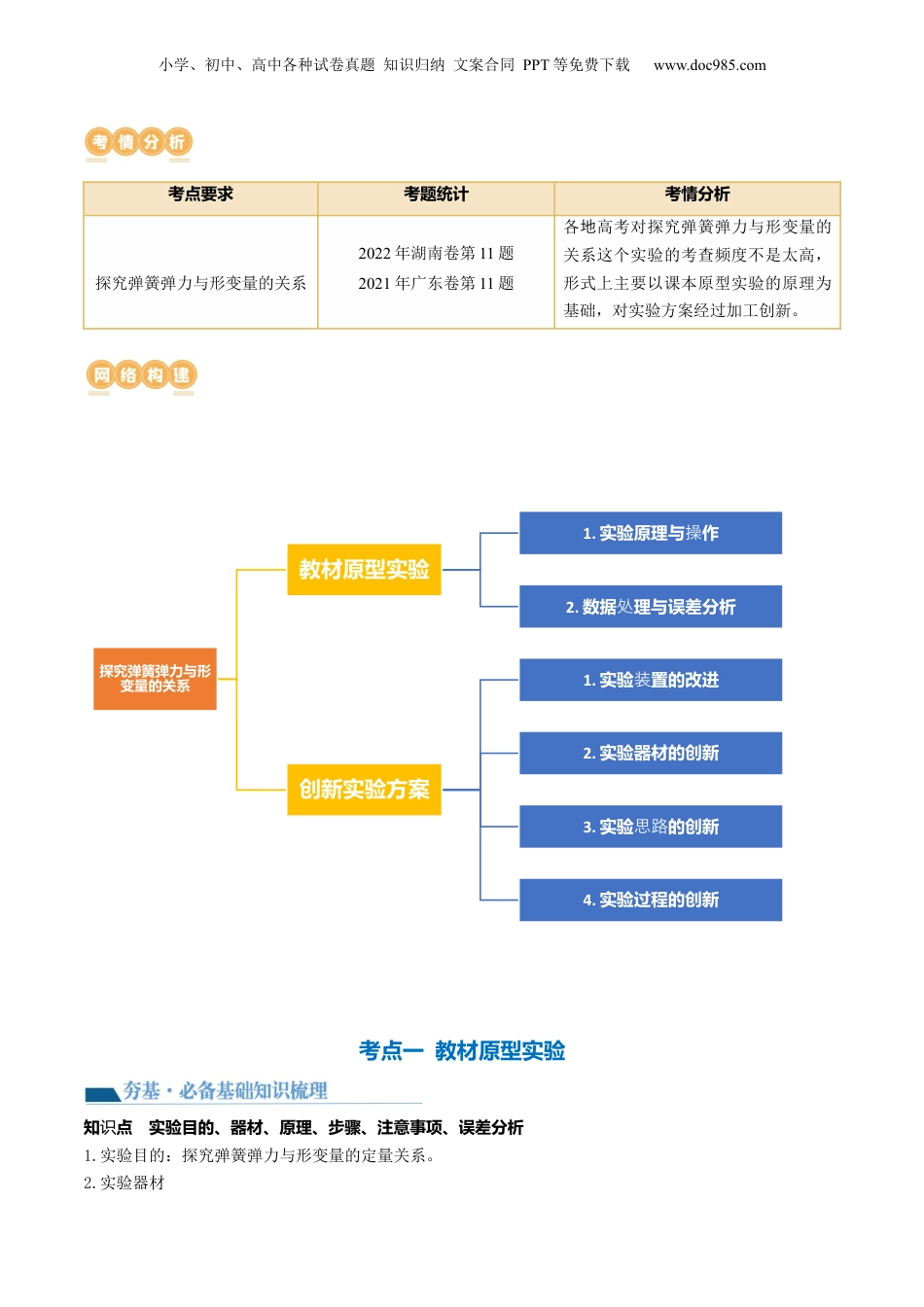 小学、初中、高中各种试卷真题知识归纳文案合同PPT等免费下载www.doc985.com第10讲探究弹簧弹力与形变量的关系目录复习目标网络构建考点一教材原型实验【夯基·必备基础知识梳理】知识点实验目的、器材、原理、步骤、注意事项、误差分析【提升·必考题型归纳】考向1实验原理与操作考向2数据处理与误差分析考点二创新实验方案【夯基·必备基础知识梳理】知识点实验方案的改进【提升·必考题型归纳】考向1实验装置的改进考向2实验器材的创新考向3实验思路的创新考向4实验过程的创新真题感悟1、掌握实验的原理,通过采集的数据利用图像,探究弹簧弹力与形变量的关系,并会做出必要的误差分析。2、能够在原型实验基础上,通过对实验的改进或者创新,做出同类探究。小学、初中、高中各种试卷真题知识归纳文案合同PPT等免费下载www.doc985.com考点要求考题统计考情分析探究弹簧弹力与形变量的关系2022年湖南卷第11题2021年广东卷第11题各高考对地探究弹簧弹力与形变量的关系这个实验的考查频度不是太高,形式上主要以课本原型实验的原理为基础,对实验方案经过加工创新。考点一教材原型实验知点识实验目的、器材、原理、步骤、注意事项、误差分析1.实验目的:探究弹簧弹力与形变量的定量关系。2.实验器材探究弹簧弹力与形变量的关系教材原型实验1.实验原理与作操2.数据理与误差分析处创新实验方案1.实验置的改进装2.实验器材的创新3.实验的创新思路4.实验过程的创新小学、初中、高中各种试卷真题知识归纳文案合同PPT等免费下载www.doc985.com弹簧、毫米刻度尺、铁架台、钩码若干、坐标纸。3.实验原理:用刻度尺测出弹簧在不同钩码拉力下的伸长量x,建立直坐标系,以纵坐标表示弹力大小角F,以横坐标表示弹簧的伸长量x,在坐标系中描出实验所测得的各组(x,F)对应的点,用平滑的曲线连接起来,根据实验所得的图线,就可探知弹力大小与弹簧伸长量间的关系。4.数据处理:(1)以弹力F为纵坐标,以弹簧的伸长量x为横坐标,建立坐标系,选取合的单位适,用描点法作图。用平滑的曲线连接各点,得到弹力F随弹簧伸长量x变化的关系图像。(2)以弹簧的伸长量为自变量,出曲线所代表的函数。首先试一次函数写尝,如果不行,则考二次函数等虑。(3)得出弹力和弹簧伸长量之间的定量关系,解释函数表式中数的物理意。达常义5.注意事项:(1)不要超过弹性限度:实验中弹簧下端挂的钩码不要太多,以免弹簧被过度拉伸,超过弹簧的弹性限度。(2)尽量多测几组数据:要使用轻质弹簧,且要尽量多测几组数据。(3)观察所描点的走向:本实验是探究性实验,实验前并不知道其规律,所以描点以后所作的曲线是试探性的,只是在分析了点的分布和走向以后才决定用直线来连接这些点。(4)统一单位:记录数据时要注意弹力及弹簧伸长量的对应关系及单位。6.误差分析:(1)钩码标值不准确、弹簧长度测量不准确以及图时描点连线不准确等都会起实验误差。画引(2)悬挂钩码数量过多,导致弹簧的形变量超出其弹性限度,不再符合胡克定律(F=kx),故图像曲。生弯发(3)水平放置弹簧测量其原长,由于弹簧有自重,将其悬挂起来后会有一定的伸长量,故图像横轴截距不为零。考向1实验原理与作操1.利用如图所示装置做研究弹力与弹簧伸长量关系的实验,所用的钩码都相同。“”小学、初中、高中各种试卷真题知识归纳文案合同PPT等免费下载www.doc985.com(1)在安装刻度尺时,必须使刻度尺保持___________状态;(2)下列操作正确的是____________A.实验前,应该先把弹簧水平放置在桌面上测量其长度B.用直尺测得弹簧的长度作为弹簧的伸长量C.用悬挂钩码的方法给弹簧施加拉力,要在钩码处于静止状态时读刻度尺的读数D.逐一增挂钩码,记下每增加一个钩码后指针所指的刻度尺刻度和对应的钩码总重量(3)某同学采用正确的方法操作后,用图像法处理数据时,把弹簧的伸长量作为横坐标,弹力作为纵坐标,然后描点作图,则作出的图像应为________。A.B.C.D.【答案】竖直CD/DCA【详解】(1)[1]在安装刻度尺时,必须使刻度尺保持竖直状态。(2)[2]A.实验前,应该先把弹簧竖直悬挂后测量其长度,故A错误;B.用直尺测得弹簧的长度不是弹簧的伸长量,...