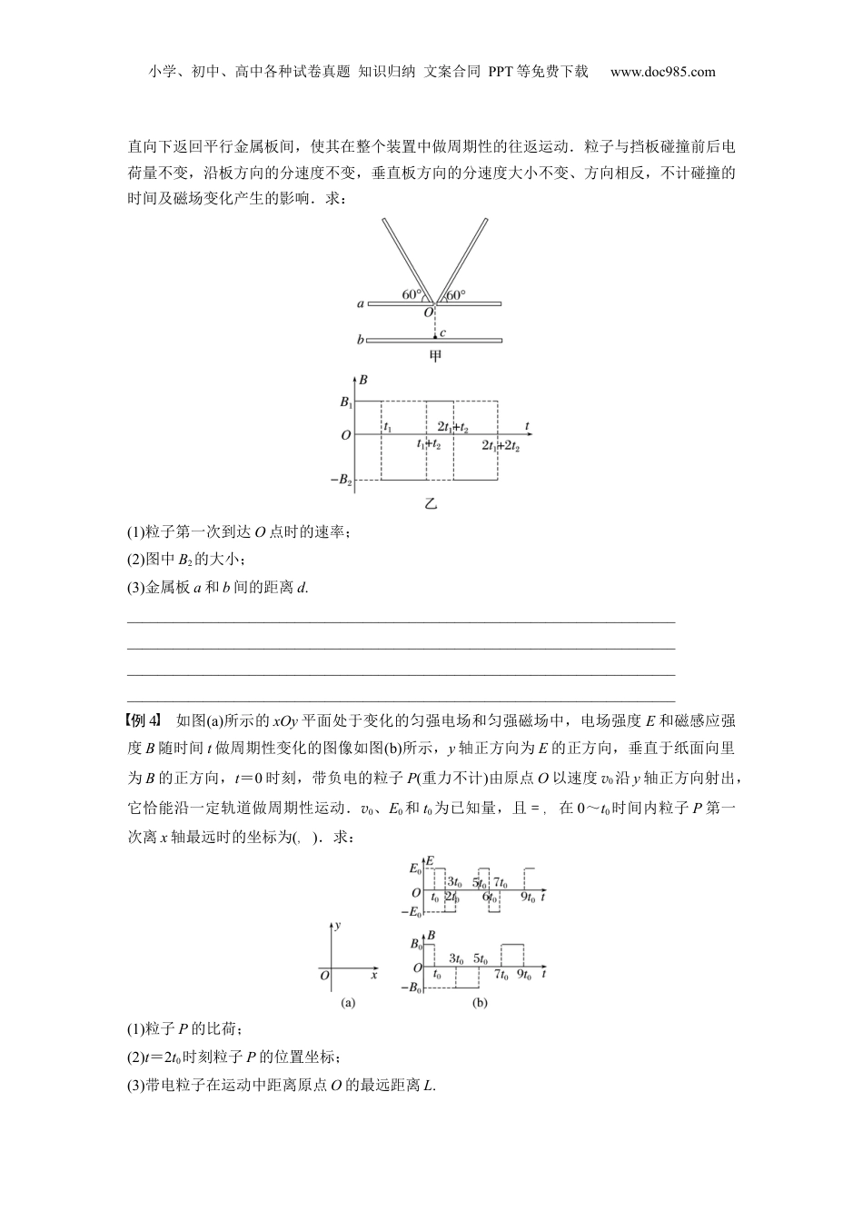 小学、初中、高中各种试卷真题知识归纳文案合同PPT等免费下载www.doc985.com专题强化二十一带电粒子在叠加场和交变电、磁场中的运动目标要求1.了解叠加场的特点,会处理带电粒子在叠加场中的运动问题.2.掌握带电粒子在交变电、磁场中运动的解题思路和处理方法.题型一带电粒子在叠加场中的运动1.叠加场电场、磁场、重力场共存,或其中某两场共存.2.带电粒子在叠加场中常见的几种运动形式运动性质受力特点方法规律匀速直线运动粒子所受合力为0平衡条件匀速圆周运动除洛伦兹力外,另外两力的合力为零:qE=mg牛顿第二定律、圆周运动的规律较复杂的曲线运动除洛伦兹力外,其他力的合力既不为零,也不与洛伦兹力等大反向动能定理、能量守恒定律例1(多选)(2022·广卷东·8)如图所示,磁控管内局部区域分布有水平向右的匀强电场和垂直纸面向里的匀强磁场.电子从M点由静止释放,沿图中所示轨迹依次经过N、P两点.已知M、P在同一等势面上,下列说法正确的有()A.电子从N到P,电场力做正功B.N点的电势高于P点的电势C.电子从M到N,洛伦兹力不做功D.电子在M点所受的合力大于在P点所受的合力听课记录:_______________________________________________________________________________________________________________________________________小学、初中、高中各种试卷真题知识归纳文案合同PPT等免费下载www.doc985.com例2如图所示,位于竖直平面内的坐标系xOy,在第三象限空间有垂直于纸面向外的匀强磁场,磁感应强度大小为B=0.5T,还有沿x轴负方向的匀强电场,电场强度大小为E=2N/C.在第一象限空间有沿y轴负方向、电场强度大小也为E的匀强电场,并在y>h=0.4m的区域有磁感应强度大小也为B的垂直于纸面向里的匀强磁场.一个带电荷量为q的油滴从图中第三象限的P点得到一初速度,恰好能沿PO做匀速直线运动(PO与x轴负方向的夹角为θ=45°),并从原点O进入第一象限.已知重力加速度g取10m/s2,求:(1)油滴在第三象限运动时受到的重力、静电力、洛伦兹力三力的大小之比,并指出油滴带哪种电荷;(2)油滴在P点得到的初速度大小;(3)油滴在第一象限运动的时间(取π=3.14).________________________________________________________________________________________________________________________________________________________________________________________________________________________________________________________________________________________________题型二带电粒子在交变电、磁场中的运动解决带电粒子在交变电、磁场中的运动问题的基本思路先读图看清并且明白场的变化情况受力分析分析粒子在不同的变化场区的受力情况过程分析分析粒子在不同时间段内的运动情况找衔接点找出衔接相邻两过程的速度大小及方向选规律联立不同阶段的方程求解例3如图甲所示,水平放置的平行金属板a、b间加直流电压U,a板上方有足够长的“V”字形绝缘弹性挡板,两板夹角为60°,在挡板间加垂直纸面的交变磁场,磁感应强度随时间变化如图乙,垂直纸面向里为磁场正方向,其中B1=B0,B2未知.现有一比荷为、不计重力的带正电粒子从c点由静止释放,t=0时刻,粒子刚好从小孔O进入上方磁场中,在t1时刻粒子第一次撞到左挡板,紧接着在t1+t2时刻粒子撞到右挡板,然后粒子从O点竖小学、初中、高中各种试卷真题知识归纳文案合同PPT等免费下载www.doc985.com直向下返回平行金属板间,使其在整个装置中做周期性的往返运动.粒子与挡板碰撞前后电荷量不变,沿板方向的分速度不变,垂直板方向的分速度大小不变、方向相反,不计碰撞的时间及磁场变化产生的影响.求:(1)粒子第一次到达O点时的速率;(2)图中B2的大小;(3)金属板a和b间的距离d.________________________________________________________________________________________________________________________________________________________________________________________________________________________________________________________________________________________________例4如图(a)所示的xOy平面处于变化的...