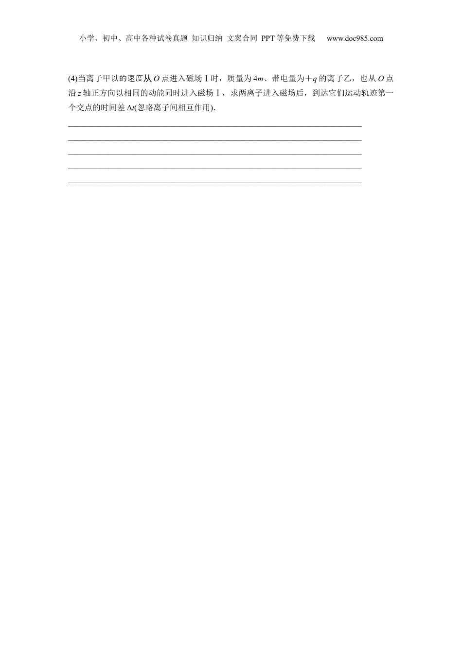 小学、初中、高中各种试卷真题知识归纳文案合同PPT等免费下载www.doc985.com专题强化二十二带电粒子在立体空间中的运动目标要求1.会处理带电粒子在匀强磁场中的螺旋线运动和叠加场中的旋进运动.2.掌握带电粒子在立体空间中的运动的解题思路和处理方法.题型一带电粒子的螺旋线运动和旋进运动空间中匀强磁场的分布是三维的,带电粒子在磁场中的运动情况可以是三维的.现在主要讨论两种情况:(1)空间中只存在匀强磁场,当带电粒子的速度方向与磁场的方向不平行也不垂直时,带电粒子在磁场中就做螺旋线运动.这种运动可分解为平行于磁场方向的匀速直线运动和垂直于磁场平面的匀速圆周运动.(2)空间中的匀强磁场和匀强电场(或重力场)平行时,带电粒子在一定的条件下就可以做旋进运动,这种运动可分解为平行于磁场方向的匀变速直线运动和垂直于磁场平面的匀速圆周运动.例1如图所示,质子以初速度v进入磁感应强度为B且足够大的匀强磁场中,速度方向与磁场方向的夹角为θ.已知质子的质量为m、电荷量为e.质子重力不计,则下列说法正确的是()A.质子运动的轨迹为螺旋线,螺旋线的中轴线方向垂直于纸面向里B.质子在垂直于磁场平面做圆周运动的半径为C.质子做螺旋线运动的周期为D.一个周期内,质子沿着螺旋线轴线方向运动的距离(即螺距)为听课记录:_______________________________________________________________________________________________________________________________________例2(2023·山市模东菏泽拟)在空间中存在水平向右的匀强磁场和匀强电场,磁感应强度大小为B,电场强度大小为E,方向均沿x轴水平向右.在O点,一个α粒子(氦原子核)以速度v0沿与x轴夹角为60°的方向射入电、磁场,已知质子质量为m、电荷量为q,不计α粒子的重力.求:小学、初中、高中各种试卷真题知识归纳文案合同PPT等免费下载www.doc985.com(1)α粒子离x轴的最远距离;(2)α粒子从O点射出后,第3次与x轴相交时的动能.________________________________________________________________________________________________________________________________________________________________________________________________________________________________________________________________________________________________题型二带电粒子在立体空间中的偏转分析带电粒子在立体空间中的运动时,要发挥空间想象力,确定粒子在空间的位置关系.带电粒子依次通过不同的空间,运动过程分为不同的阶段,只要分析出每个阶段上的运动规律,再利用两个空间交界处粒子的运动状态和关联条件即可解决问题.有时需要将粒子的运动分解为两个互相垂直的平面内的运动(比如螺旋线运动和旋进运动)来求解.例3(2022·山卷东·17)中国“人造太阳”在核聚变实验方面取得新突破,该装置中用电磁场约束和加速高能离子,其部分电磁场简化模型如图所示,在三维坐标系Oxyz中,0<z≤d空间内充满匀强磁场Ⅰ,磁感应强度大小为B,方向沿x轴正方向;-3d≤z<0,y≥0的空间内充满匀强磁场Ⅱ,磁感应强度大小为B,方向平行于xOy平面,与x轴正方向夹角为45°;z<0,y≤0的空间内充满沿y轴负方向的匀强电场.质量为m、带电量为+q的离子甲从yOz平面第三象限内距y轴为L的点A以一定速度出射,速度方向与z轴正方向夹角为β,在yOz平面内运动一段时间后,经坐标原点O沿z轴正方向进入磁场Ⅰ.不计离子重力.(1)当离子甲从A点出射速度为v0时,求电场强度的大小E;________________________________________________________________________________________________________________________________________________________________________________________________________________________________________________________________________________________________(2)若使离子甲进入磁场后始终在磁场中运动,求进入磁场时的最大速度vm;(3)离子甲以的速度从O点沿z轴正方向第一次穿过xOy面进入磁场Ⅰ,求第四次穿过xOy平面的位置坐标(用d表示);小学、初中、高中各种试卷真题知识归纳文案合同PPT等免费下载www.doc985.com(4)...
