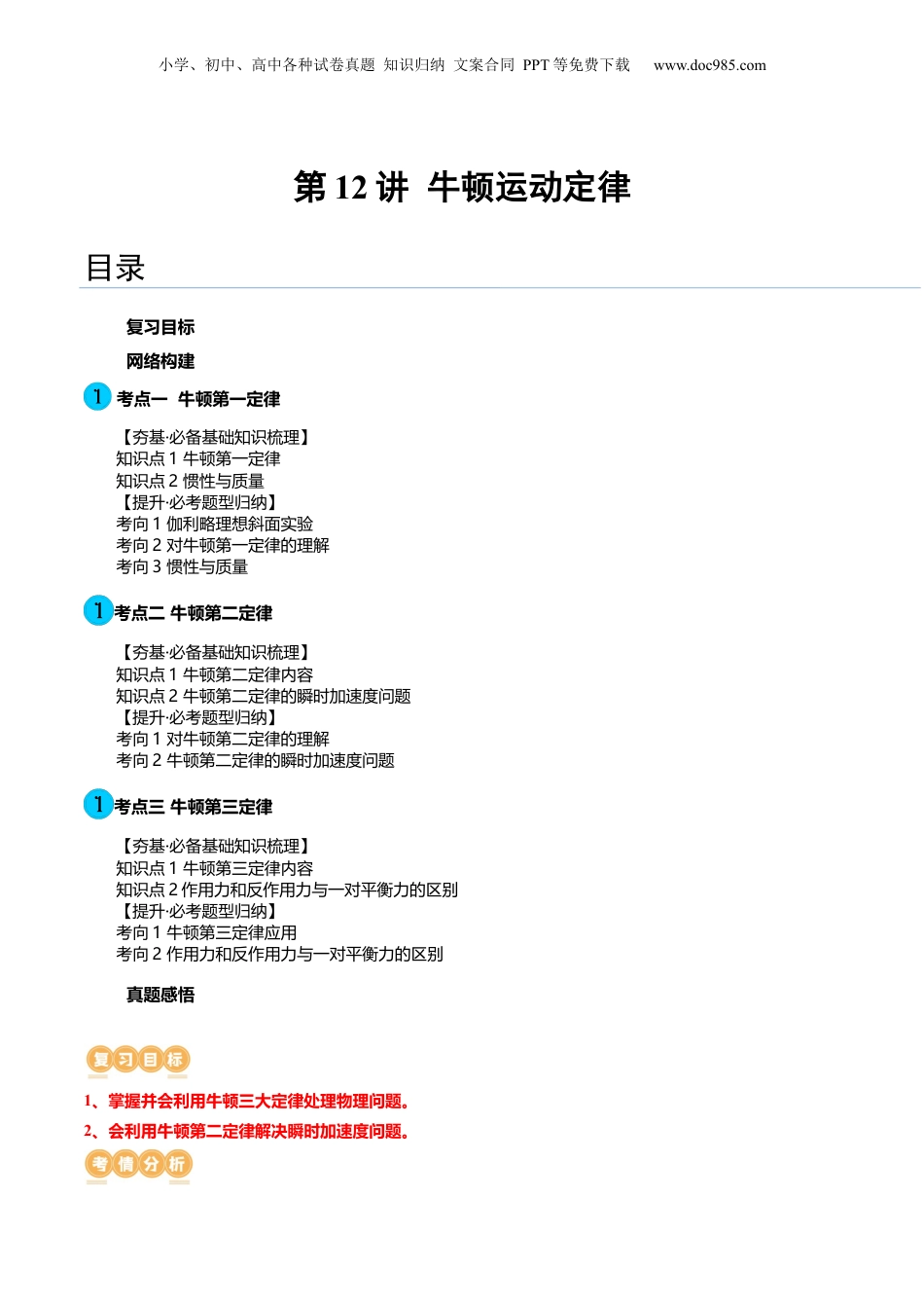 小学、初中、高中各种试卷真题知识归纳文案合同PPT等免费下载www.doc985.com第12讲牛顿运动定律目录复习目标网络构建考点一牛顿第一定律【夯基·必备基础知识梳理】知识点1牛顿第一定律知识点2惯性与质量【提升·必考题型归纳】考向1伽利略理想斜面实验考向2对牛顿第一定律的理解考向3惯性与质量考点二牛顿第二定律【夯基·必备基础知识梳理】知识点1牛顿第二定律内容知识点2牛顿第二定律的瞬时加速度问题【提升·必考题型归纳】考向1对牛顿第二定律的理解考向2牛顿第二定律的瞬时加速度问题考点三牛顿第三定律【夯基·必备基础知识梳理】知识点1牛顿第三定律内容知识点2作用力和反作用力与一对平衡力的区别【提升·必考题型归纳】考向1牛顿第三定律应用考向2作用力和反作用力与一对平衡力的区别真题感悟1、掌握并会利用牛顿三大定律处理物理问题。2、会利用牛顿第二定律解决瞬时加速度问题。小学、初中、高中各种试卷真题知识归纳文案合同PPT等免费下载www.doc985.com考点要求考题统计考情分析(1)牛顿第一定律惯性(2)牛顿第二定律(3)牛顿第三定律2023年6月浙江卷第2题2023年全国乙卷第1题2022年海南卷第1题高考对牛顿三定律基规律的考,本查多以题的式出现,同时与实形选择际生的实结论,题目相对为活例密紧较简。单考点一牛顿第一定律知识点1牛顿第一定律1.牛顿第一定律:一物体总保持切,作用在它上面的力使它改变种状态除非迫这。(1)示了物体的惯性:不受力的作用时,一物体总保持揭切。牛顿运动定律牛顿第一定律1.牛顿第一定律内容2.惯性与质量关系牛顿第二定律1.牛顿第二定律内容2.牛顿第二定律瞬时加速度牛顿第三定律1.牛顿第三定律内容2.作用力与平衡力的区别小学、初中、高中各种试卷真题知识归纳文案合同PPT等免费下载www.doc985.com2.牛顿第一、第二定律的关系(1)牛顿第一定律是以理解实验为基础,经过学抽、归纳推理总结出来的,牛顿第二定律是实验定律科象。(2)牛顿第一定律不是牛顿第二定律的特,它示了物体运动的原和力的作用对运动的;牛顿第例揭因影响二定律则定量出了力和运动的系。指联(2)示了力的作用对运动的:力是改变揭影响的原。因知识点2惯性与质量对惯性的理解:(1)保持“原状”:物体在不受力或所受合外力为零时,惯性表现为使物体保持原来的运动状态()。(2)反改变:物体受到外力时,惯性表现为运动状态改变。惯性越大,物体的运动状态越难以被改抗抗拒变。(3)惯性的量度:是物体惯性大小的唯一量度,质量越大,惯性越大,与物体的速度和受力情况无关。考向1利理面实验伽略想斜1.如图所示,关于两个斜面实验,下列分析正确的是()A.伽利略利用图甲的U型槽进行实验,球从左边斜面滚上右侧也是理想的,现实不存在的B.伽利略利用图乙中的斜而进行实验,得出下落的小球位移与时间成正比C.伽利略利用图甲中的斜面进行实验,得出物体的运动不需要力;利用图乙中的斜面进行实验,最后推导得出自由落体运动的规律D.伽利略利用图甲中的斜面进行实验,物体的运动需要力来维持;利用图乙中的斜面进行实验,直接得出自由落体运动的规律考向2对牛顿第一定律的理解2.关于牛顿第一定律,下列说法中正确的是()A.物体的运动状态改变时,一定受到了外力的作用B.作用在物体上的力消失后,物体保持静止状态或匀速直线运动状态C.牛顿第一定律是在伽利略“理想实验”的基础上总结出来的D.牛顿第一定律表明,物体只有在静止或做匀速直线运动时才具有惯性E.不受力作用的物体是不存在的,故牛顿第一定律的建立毫无意义考向3惯性与质量3.如图所示,一个盛满水的容器固定在一个小车上,在容器中分别悬挂和拴着一个铁球和一个乒乓球.容器中的水、铁球和乒乓球都处于静止状态,当容器随小车突然向右运动时,两球的运动状况是(以小车小学、初中、高中各种试卷真题知识归纳文案合同PPT等免费下载www.doc985.com为参考系)()A.铁球向左运动B.铁球向右运动C.乒乓球向左运动D.乒乓球向右运动考点二牛顿第二定律知识点1牛顿第二定律内容1.牛顿第二定律:物体加速度的大小跟它受到的作用力成、跟它的质量成,加速度的方向跟作用力的方向。2.表达式:F=ma,其...