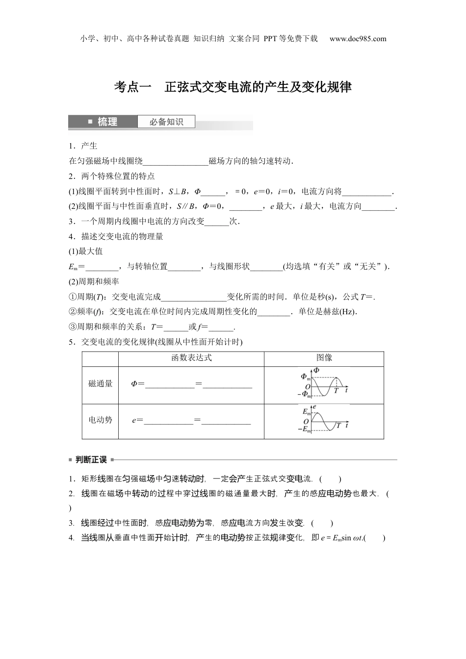 小学、初中、高中各种试卷真题知识归纳文案合同PPT等免费下载www.doc985.com考情分析交流电及四值2022·浙江1月选考·T92022·广东卷·T42022·河北卷·T32021·辽宁卷·T52021·江苏卷·T122021·天津卷·T32021·北京卷·T52021·浙江1月选考·T162021·浙江6月选考·T52018·全国卷Ⅲ·T16变压器综合问题2022·山东卷·T42022·湖北卷·T92022·湖南卷·T62022·北京卷·T42022·重庆卷·T32021·广东卷·T72021·河北卷·T82021·湖南卷·T62021·湖北卷·T62021·福建卷·T32020·全国卷Ⅲ·T202020·江苏卷·T22020·山东卷·T5远距离输电2020·全国卷Ⅱ·T192020·浙江7月选考·T11电磁波2021·浙江6月选考·T82021·福建卷·T52020·北京卷·T32020·江苏卷·T13B(1)传感器2022·河北卷·T122022·北京卷·T132022·重庆卷·T11试题情境生活实践类发电机、变压器、远距离输电、无线充电、家用和工业电路、家用电器、雷达、射电望远镜、X射线管、电子秤、烟雾报警器等学习探究类探究变压器原、副线圈电压与匝数的关系,探究家用小型发电机的原理,探究负载增加对供电系统的影响、电磁振荡、利用传感器制作简单的自动控制装置第1讲交变电流的产生和描述目标要求1.理解正弦式交变电流的产生过程,能正确书写交变电流的函数表达式.2.理解并掌握交变电流图像的意义.3.理解描述交变电流的几个物理量,会计算交变电流的有效值.4.知道交流电“四值”在具体情况下的应用.小学、初中、高中各种试卷真题知识归纳文案合同PPT等免费下载www.doc985.com考点一正弦式交变电流的产生及变化规律1.产生在匀强磁场中线圈绕________________磁场方向的轴匀速转动.2.两个特殊位置的特点(1)线圈平面转到中性面时,S⊥B,Φ______,=0,e=0,i=0,电流方向将____________.(2)线圈平面与中性面垂直时,S∥B,Φ=0,________,e最大,i最大,电流方向________.3.一个周期内线圈中电流的方向改变______次.4.描述交变电流的物理量(1)最大值Em=________,与转轴位置________,与线圈形状________(均选填“有关”或“无关”).(2)周期和频率①周期(T):交变电流完成________________变化所需的时间.单位是秒(s),公式T=.②频率(f):交变电流在单位时间内完成周期性变化的________.单位是赫兹(Hz).③周期和频率的关系:T=______或f=______.5.交变电流的变化规律(线圈从中性面开始计时)函数表达式图像磁通量Φ=____________=____________电动势e=____________=____________1.矩形圈在强磁中速,一定生正弦式交流.线匀场匀转动时会产变电()2.圈在磁中的程中穿圈的磁通量最大,生的感也最大.线场转动过过线时产应电动势()3.圈中性面,感零,感流方向生改.线经过时应电动势为应电发变()4.圈垂直中性面始,生的按正弦律化,即当线从开计时产电动势规变e=Emsinωt.()小学、初中、高中各种试卷真题知识归纳文案合同PPT等免费下载www.doc985.com书写交变电流瞬时值表达式的技巧(1)确定正弦交变电流的峰值:根据已知图像读出或由公式Em=NBSω求出相应峰值.(2)明确线圈的初始位置:①若线圈从中性面位置开始计时,则i-t图像为正弦函数图像,函数表达式为i=Imsinωt.②若线圈从垂直中性面位置开始计时,则i-t图像为余弦函数图像,函数表达式为i=Imcosωt.例1(2023·广西柳州市模拟)为研究交变电流产生的规律,某研究小组把长60m导线绕制成N=100匝的矩形闭合线圈,如图所示.现把线圈放到磁感应强度大小B=0.1T、方向水平向右的匀强磁场中,线圈可以绕其对称轴OO′转动.现让线圈从图示位置开始(t=0)以恒定的角速度ω=10πrad/s转动.下列说法正确的有()A.t=0时,线圈位于中性面位置B.t=0.05s时,感应电流达到最大值C.当bc=2ab时,感应电动势的表达式为e=2πsin10πt(V)D.当ab=ad时,感应电动势的有效值最大听课记录:______________________________________________________________________________________________________________________________________例2(2023·江省高三月考苏)两人在赤道上站立,各自手握金属绳OPO′的一端,绕东西方向的水平轴沿顺时...