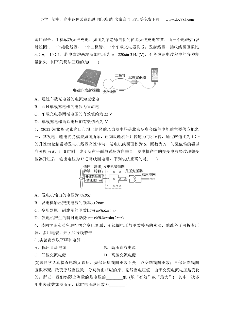 小学、初中、高中各种试卷真题知识归纳文案合同PPT等免费下载www.doc985.com1.(2020·江卷苏·2)电流互感器是一种测量电路中电流的变压器,工作原理如图所示.其原线圈匝数较少,串联在电路中,副线圈匝数较多,两端接在电流表上.则电流互感器()A.是一种降压变压器B.能测量直流电路的电流C.原、副线圈电流的频率不同D.副线圈的电流小于原线圈的电流2.(多选)(2020·全国卷Ⅱ·19)特高压输电可使输送中的电能损耗和电压损失大幅降低.我国已成功掌握并实际应用了特高压输电技术.假设从A处采用550kV的超高压向B处输电,输电线上损耗的电功率为ΔP,到达B处时电压下降了ΔU.在保持A处输送的电功率和输电线电阻都不变的条件下,改用1100kV特高压输电.输电线上损耗的电功率变为ΔP′,到达B处时电压下降了ΔU′.不考虑其他因素的影响,则()A.ΔP′=ΔPB.ΔP′=ΔPC.ΔU′=ΔUD.ΔU′=ΔU3.(2021·广卷东·7)某同学设计了一个充电装置,如图所示,假设永磁铁的往复运动在螺线管中产生近似正弦式交流电,周期为0.2s,电压最大值为0.05V,理想变压器原线圈接螺线管,副线圈接充电电路,原、副线圈匝数比为1∶60,下列说法正确的是()A.交流电的频率为10HzB.副线圈两端电压最大值为3VC.变压器输入电压与永磁铁磁场强弱无关D.充电电路的输入功率大于变压器的输入功率4.(多选)无线充电器能给手机充电是因为两者内部有线圈存在,当电源的电流通过无线充电器的送电线圈会产生变化的磁场,手机端的受电线圈靠近该磁场就会产生感应电流,双方小学、初中、高中各种试卷真题知识归纳文案合同PPT等免费下载www.doc985.com密切配合,手机成功无线充电.如图为某老师自制的简易无线充电装置,由一个电磁炉(发射线圈)、一个接收线圈、一个二极管、一个车载充电器构成,发射线圈、接收线圈匝数比n1∶n2=10∶1,若电磁炉两端所加电压为u=220sin314t(V),不考虑充电过程中的各种能量损失.则下列说法正确的是()A.通过车载充电器的电流为交流电B.通过车载充电器的电流为直流电C.车载充电器两端电压的有效值约为22VD.车载充电器两端电压的有效值约为V5.(2022·河北卷·3)张家口市坝上地区的风力发电场是北京冬奥会绿色电能的主要供应地之一,其发电、输电简易模型如图所示,已知风轮机叶片转速为每秒z转,通过转速比为1∶n的升速齿轮箱带动发电机线圈高速转动,发电机线圈面积为S,匝数为N,匀强磁场的磁感应强度为B,t=0时刻,线圈所在平面与磁场方向垂直,发电机产生的交变电流经过理想变压器升压后.输出电压为U.忽略线圈电阻,下列说法正确的是()A.发电机输出的电压为πNBSzB.发电机输出交变电流的频率为2πnzC.变压器原、副线圈的匝数比为πNBSnz∶UD.发电机产生的瞬时电动势e=πNBSnz·sin(2πnz)6.某同学在实验室进行探究变压器原、副线圈电压与匝数关系的实验.他准备了可拆变压器、多用电表、开关和导线若干.(1)实验需要以下哪种电源________;A.低压直流电源B.高压直流电源C.低压交流电源D.高压交流电源(2)该同学认真检查电路无误后,先保证原线圈匝数不变,改变副线圈匝数;再保证副线圈匝数不变,改变原线圈匝数.分别测出相应的原、副线圈电压值.由于交变电流电压是变化的,所以,我们实际上测量的是电压的________值(填“有效”或“最大”).其中一次多用电表读数如图所示,此时电压表读数为________;小学、初中、高中各种试卷真题知识归纳文案合同PPT等免费下载www.doc985.com(3)理想变压器原、副线圈电压应与其匝数成________(选填“正比”或“反比”),实验中由于变压器的铜损和铁损,导致原线圈与副线圈的电压之比一般________(选填“大于”“小于”或“等于”)原线圈与副线圈的匝数之比;(4)实验中原、副线圈的电压之比与它们的匝数之比有微小差别.原因不可能为________.(填字母代号)A.原、副线圈上通过的电流发热B.铁芯在交变磁场作用下发热C.变压器铁芯漏磁D.原线圈输入电压发生变化7.自耦变压器在高铁技术中被广泛应用.如图所示,一理想自耦变压器接在u=Umsin100πt的正弦交流电压上,P为滑动触头,初始位置位于线圈CD的中点G,A1和A...