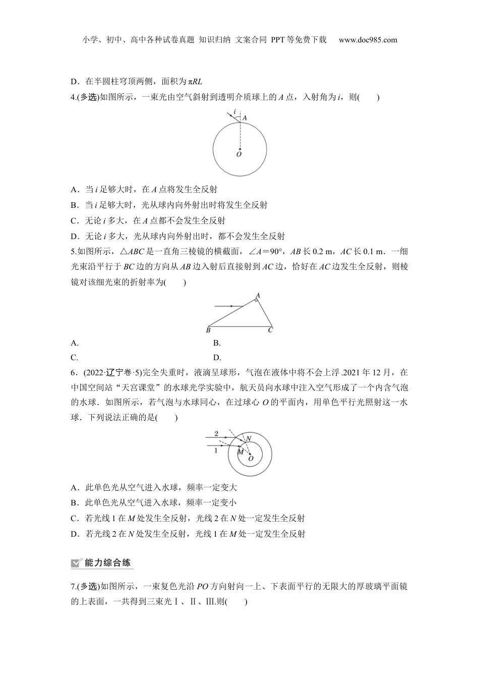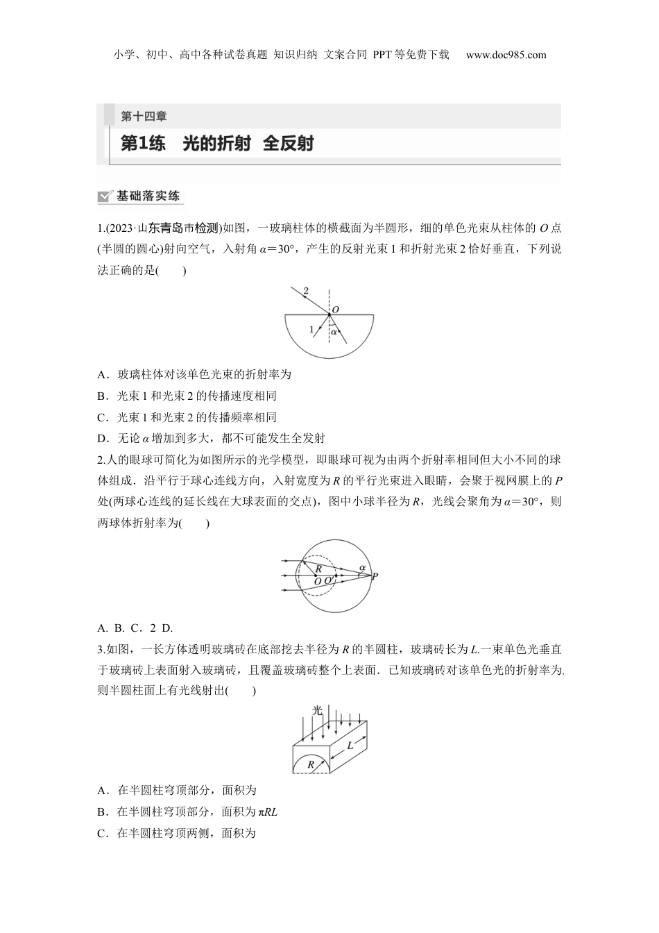 小学、初中、高中各种试卷真题知识归纳文案合同PPT等免费下载www.doc985.com1.(2023·山市东青岛检测)如图,一玻璃柱体的横截面为半圆形,细的单色光束从柱体的O点(半圆的圆心)射向空气,入射角α=30°,产生的反射光束1和折射光束2恰好垂直,下列说法正确的是()A.玻璃柱体对该单色光束的折射率为B.光束1和光束2的传播速度相同C.光束1和光束2的传播频率相同D.无论α增加到多大,都不可能发生全发射2.人的眼球可简化为如图所示的光学模型,即眼球可视为由两个折射率相同但大小不同的球体组成.沿平行于球心连线方向,入射宽度为R的平行光束进入眼睛,会聚于视网膜上的P处(两球心连线的延长线在大球表面的交点),图中小球半径为R,光线会聚角为α=30°,则两球体折射率为()A.B.C.2D.3.如图,一长方体透明玻璃砖在底部挖去半径为R的半圆柱,玻璃砖长为L.一束单色光垂直于玻璃砖上表面射入玻璃砖,且覆盖玻璃砖整个上表面.已知玻璃砖对该单色光的折射率为,则半圆柱面上有光线射出()A.在半圆柱穹顶部分,面积为B.在半圆柱穹顶部分,面积为πRLC.在半圆柱穹顶两侧,面积为小学、初中、高中各种试卷真题知识归纳文案合同PPT等免费下载www.doc985.comD.在半圆柱穹顶两侧,面积为πRL4.(多选)如图所示,一束光由空气斜射到透明介质球上的A点,入射角为i,则()A.当i足够大时,在A点将发生全反射B.当i足够大时,光从球内向外射出时将发生全反射C.无论i多大,在A点都不会发生全反射D.无论i多大,光从球内向外射出时,都不会发生全反射5.如图所示,△ABC是一直角三棱镜的横截面,∠A=90°,AB长0.2m,AC长0.1m.一细光束沿平行于BC边的方向从AB边入射后直接射到AC边,恰好在AC边发生全反射,则棱镜对该细光束的折射率为()A.B.C.D.6.(2022·宁卷辽·5)完全失重时,液滴呈球形,气泡在液体中将不会上浮.2021年12月,在中国空间站“天宫课堂”的水球光学实验中,航天员向水球中注入空气形成了一个内含气泡的水球.如图所示,若气泡与水球同心,在过球心O的平面内,用单色平行光照射这一水球.下列说法正确的是()A.此单色光从空气进入水球,频率一定变大B.此单色光从空气进入水球,频率一定变小C.若光线1在M处发生全反射,光线2在N处一定发生全反射D.若光线2在N处发生全反射,光线1在M处一定发生全反射7.(多选)如图所示,一束复色光沿PO方向射向一上、下表面平行的无限大的厚玻璃平面镜的上表面,一共得到三束光Ⅰ、Ⅱ、Ⅲ.则()小学、初中、高中各种试卷真题知识归纳文案合同PPT等免费下载www.doc985.comA.该复色光由三种颜色的光混合而成B.光束Ⅱ在玻璃平面镜中的传播速度比光束Ⅲ小C.光束Ⅱ、Ⅲ在玻璃平面镜内部传播的时间不可能相同D.改变α角且α<90°,光束Ⅱ、Ⅲ一定始终与光束Ⅰ平行8.(2022·山卷东·7)柱状光学器件横截面如图所示,OP右侧是以O为圆心、半径为R的圆,左侧是直角梯形,AP长为R,AC与CO夹角45°,AC中点为B.a、b两种频率的细激光束,垂直AB面入射,器件介质对a、b光的折射率分别为1.42、1.40.保持光的入射方向不变,入射点从A向B移动过程中,能在PM面全反射后,从OM面出射的光是(不考虑三次反射以后的光)()A.仅有a光B.仅有b光C.a、b光都可以D.a、b光都不可以9.如图中阴影部分ABC为一透明材料做成的柱形光学元件的横截面,该种材料的折射率n=2,AC为一半径为R的弧圆,D为圆弧面的圆心,ABCD构成正方形,在D处有一点光源.若只考虑首次从圆弧AC直接射向AB、BC的光线,从点光源射入圆弧AC的光中,能从AB、BC面直接射出的部分占整个弧的圆()A.B.C.D.10.(2022·广卷东·16(2))一个水平放置的圆柱形罐体内装了一半的透明液体,液体上方是空气,其截面如图所示.一激光器从罐体底部P点沿着罐体的内壁向上移动,它所发出的光束始终指向圆心O点.当光束与竖直方向成45°角时,恰好观察不到从液体表面射向空气的折射光束.已知光在空气中的传播速度为c,求液体的折射率n和激光在液体中的传播速度v.小学、初中、高中各种试卷真题知识归纳文案合同PPT等免费下载www.doc985.com11.(2023·江城市海中模苏盐滨学拟)半径为R的固定半圆形玻璃砖的横截面如图所...