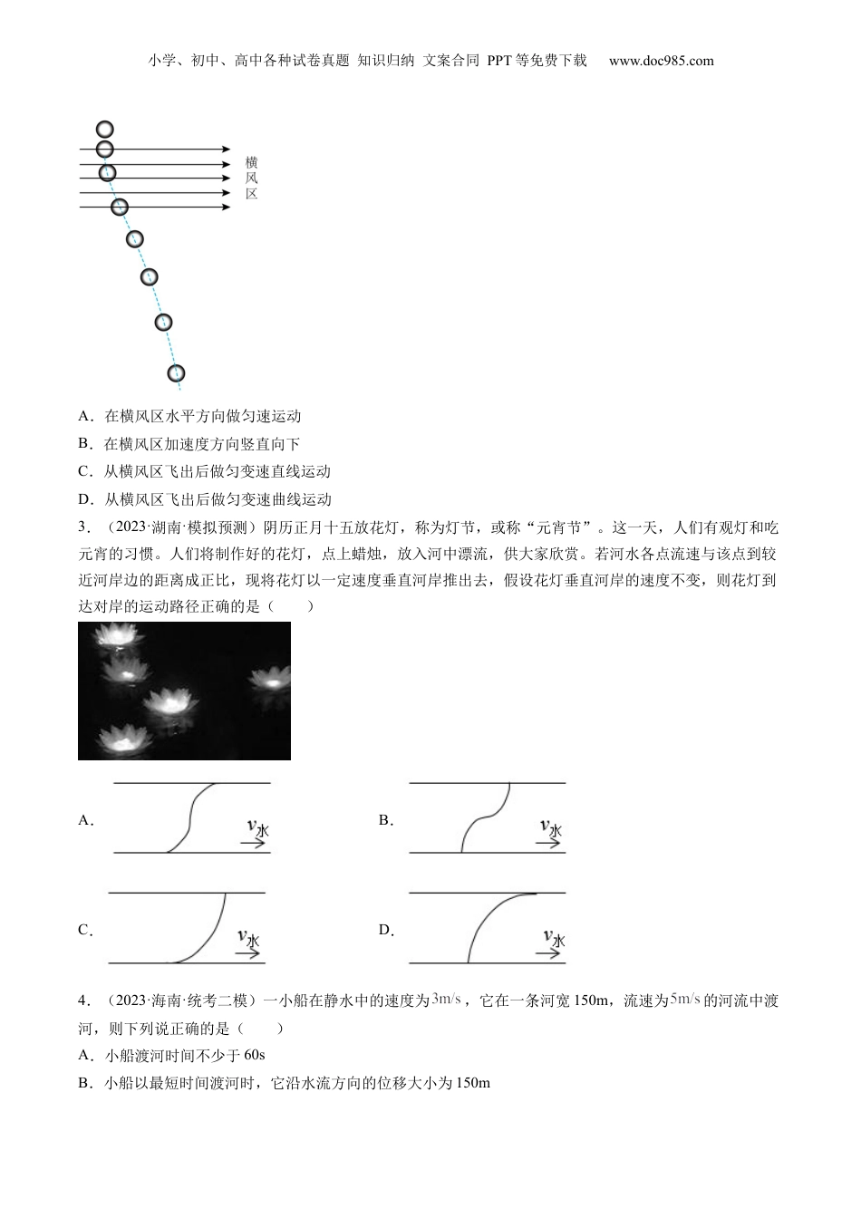 小学、初中、高中各种试卷真题知识归纳文案合同PPT等免费下载www.doc985.com第16讲曲线运动运动的合成与分解(模拟精练+真题演练)1.(2023·湖北武汉·华中师大一附中校考三模)如图所示,生产车间有两个完全相同的水平传送带甲和乙,它们相互垂直且等高,正常工作时都匀速运动,速度大小分别为、,将工件(视为质点)轻放到传带甲上,工件离开传送带甲前已经与传送带甲的速度相同,并平稳地传送到传送带乙上,且不会从传送带乙的右侧掉落。两传送带正常工作时,对其中一个工件A在传送带乙上留下的痕迹,下图中可能正确的是()A.B.C.D.2.(2023·江苏盐城·统考三模)如图所示,小球从水平向右的横风区正上方自由下落的闪光照片。除横风区外,其他位置的空气作用力可忽略不计。则小球()小学、初中、高中各种试卷真题知识归纳文案合同PPT等免费下载www.doc985.comA.在横风区水平方向做匀速运动B.在横风区加速度方向竖直向下C.从横风区飞出后做匀变速直线运动D.从横风区飞出后做匀变速曲线运动3.(2023·湖南·模拟预测)阴历正月十五放花灯,称为灯节,或称“元宵节”。这一天,人们有观灯和吃元宵的习惯。人们将制作好的花灯,点上蜡烛,放入河中漂流,供大家欣赏。若河水各点流速与该点到较近河岸边的距离成正比,现将花灯以一定速度垂直河岸推出去,假设花灯垂直河岸的速度不变,则花灯到达对岸的运动路径正确的是()A.B.C.D.4.(2023·海南·统考二模)一小船在静水中的速度为,它在一条河宽150m,流速为的河流中渡河,则下列说正确的是()A.小船渡河时间不少于60sB.小船以最短时间渡河时,它沿水流方向的位移大小为150m小学、初中、高中各种试卷真题知识归纳文案合同PPT等免费下载www.doc985.comC.小船以最短位移渡河时,位移大小为250mD.小船以最短位移渡河时,时间为60s5.(2022·山东泰安·统考模拟预测)如图,某河流中水流速度大小恒为v1,A处的下游C处有个漩涡,漩涡与河岸相切于B点,漩涡的半径为r,AB=。为使小船从A点出发以恒定的速度安全到达对岸,小船航行时在静水中速度的最小值为()A.B.C.v1D.6.(2022·福建福州·统考模拟预测)洪水无情人有情,每一次重大抢险救灾,都有子弟兵的身影。如图所示,水速为v,消防武警驾驶冲锋舟若采取冲锋舟最小速度和船头正对河岸两种行驶方案,沿与平直河岸成30°角的线路把被困群众从A处送到对岸安全地B处,则两种方案中冲锋舟最小速度v1和船头正对河岸的冲锋舟速度v2之比为()A.B.C.D.7.(2023·山东·模拟预测)如图,汽车从静止开始通过缆绳将质量为m的货物从A处沿光滑斜面拉到B处,此过程中货物上升高度为h,到B处时定滑轮右侧缆绳与水平方向间的夹角为θ,左侧缆绳与斜面间的夹角为2θ,汽车的速度大小为v,此时货物的速度大小为()A.B.C.D.8.(2023·云南·昆明高三模拟预测)跑马射箭是民族马术中的一个比赛项目,如图甲所示,运动员需骑马小学、初中、高中各种试卷真题知识归纳文案合同PPT等免费下载www.doc985.com在直线跑道上奔跑,弯弓射箭,射击侧方的固定靶标,该过程可简化为如图乙(俯视图)所示的物理模型:假设运动员骑马以大小为的速度沿直线跑道匀速奔驰,箭被射出前箭头沿直线运动,其轨迹所在直线与靶心的水平距离为。为保证箭能命中靶心且在空中运动的时间最短,运动员应在合适的位置将箭水平射出,若箭射出瞬间相对弓的速度大小为,不计空气阻力。下列说法正确的是()A.箭射中靶心的最短时间为B.箭射中靶心的最短时间为C.箭射出瞬间箭头到靶心的水平距离为dD.箭射出瞬间箭头到靶心的水平距离为9.(2023春·云南昆明·高三云南师大附中校考)如图所示,一矩形白纸平铺在水平桌面上,一钢笔的笔尖压在白纸上的P点,现使白纸从静止开始沿与边平行的方向以加速度a在桌面上向右做匀加速直线运动,白纸开始运动的同时用外力控制笔尖开始运动,最终笔尖在白纸上留下如图中所示的与垂直的划痕.以地面为参考系,考虑笔尖的运动,下列说法正确的是()A.笔尖的加速度不可能小于aB.笔尖的运动轨迹一定是曲线C.笔尖的速度可能沿图中箭头1所示方向D.笔尖离...