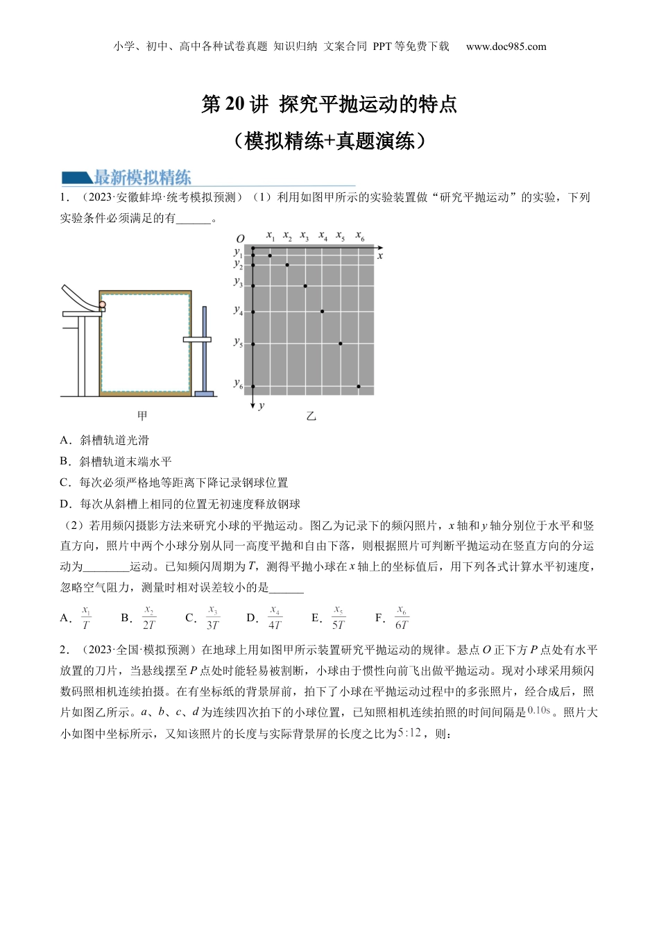 小学、初中、高中各种试卷真题知识归纳文案合同PPT等免费下载www.doc985.com第20讲探究平抛运动的特点(模拟精练+真题演练)1.(2023·安徽蚌埠·统考模拟预测)(1)利用如图甲所示的实验装置做“研究平抛运动”的实验,下列实验条件必须满足的有______。A.斜槽轨道光滑B.斜槽轨道末端水平C.每次必须严格地等距离下降记录钢球位置D.每次从斜槽上相同的位置无初速度释放钢球(2)若用频闪摄影方法来研究小球的平抛运动。图乙为记录下的频闪照片,x轴和y轴分别位于水平和竖直方向,照片中两个小球分别从同一高度平抛和自由下落,则根据照片可判断平抛运动在竖直方向的分运动为________运动。已知频闪周期为T,测得平抛小球在x轴上的坐标值后,用下列各式计算水平初速度,忽略空气阻力,测量时相对误差较小的是______A.B.C.D.E.F.2.(2023·全国·模拟预测)在地球上用如图甲所示装置研究平抛运动的规律。悬点O正下方P点处有水平放置的刀片,当悬线摆至P点处时能轻易被割断,小球由于惯性向前飞出做平抛运动。现对小球采用频闪数码照相机连续拍摄。在有坐标纸的背景屏前,拍下了小球在平抛运动过程中的多张照片,经合成后,照片如图乙所示。a、b、c、d为连续四次拍下的小球位置,已知照相机连续拍照的时间间隔是。照片大小如图中坐标所示,又知该照片的长度与实际背景屏的长度之比为,则:小学、初中、高中各种试卷真题知识归纳文案合同PPT等免费下载www.doc985.com(1)由已知信息,可知a点___________(选填“是”或“不是”)小球的抛出点。(2)由已知信息,若不计其他阻力,可以算出小球做平抛运动的初速度是________。(保留两位有效数字)(3)由已知信息,可以推算出地球表面的重力加速度为________(保留两位有效数字)3.(2023·陕西咸阳·统考三模)在探究平抛运动规律实验中,利用一管口直径略大于小球直径的直管来确定平抛小球的落点及速度方向(只有当小球速度方向沿直管方向才能飞入管中),重力加速度为g。实验一:如图(a)所示,一倾斜角度为θ的斜面AB,A点为斜面最低点,直管保持与斜面垂直,管口与斜面在同一平面内,平抛运动实验轨道抛出口位于A点正上方某处。为让小球能够落入直管,可以根据需要沿斜面移动直管。(1)以下是实验中的一些做法,合理的的是__________。A.斜槽轨道必须光滑B.安装斜槽轨道,使其末端保持水平C.调整轨道角度平衡摩擦力D.选择密度更小的小球(2)某次平抛运动中,直管移动至P点时小球恰好可以落入其中,测量出P点至A点距离为L,根据以上数据可以计算出此次平抛运动在空中飞行时间t=________,初速度v0=_________(用L,g,θ表示)。实验二:如图(b)所示,一半径为R的四分之一圆弧面AB,圆心为O,OA竖直,直管保持沿圆弧面的半径方向,管口在圆弧面内,直管可以根据需要沿圆弧面移动。平抛运动实验轨道抛出口位于OA线上可以上下移动,抛出口至O点的距离为h。(3)上下移动轨道,多次重复实验,记录每次实验抛出口至O点的距离,不断调节直管位置以及小球平小学、初中、高中各种试卷真题知识归纳文案合同PPT等免费下载www.doc985.com抛初速度,让小球能够落入直管。为提高小球能够落入直管的成功率及实验的可操作性,可以按如下步骤进行:首先确定能够落入直管小球在圆弧面上的落点,当h确定时,理论上小球在圆弧面上的落点位置是___________(填“确定”或“不确定”),再调节小球释放位置,让小球获得合适的平抛初速度平抛至该位置即可落入直管。满足上述条件的平抛运动初速度满足=__________(用h,R,g表示)。4.(2023·广东·广州高三模拟预测)用如图a所示的装置研究平抛运动,请完成相关实验内容。(1)将斜轨固定在桌面上,反复调节斜轨末端成水平;(2)在末端出口处安装光电门并调节其到适当位置。将贴有坐标纸的木板紧靠在斜轨出口处竖直放置,并在坐标纸上将出口处标为O点,过O点作水平线为x轴、竖直线为y轴;(3)用螺旋测微器测量小球的直径d,读数如图b,则______mm;(4)从斜轨上释放小球,用每隔曝光一次的频闪照相机正对着木板照相;(5)从数字计时器读得小球通过光电门的遮光时间为,则...