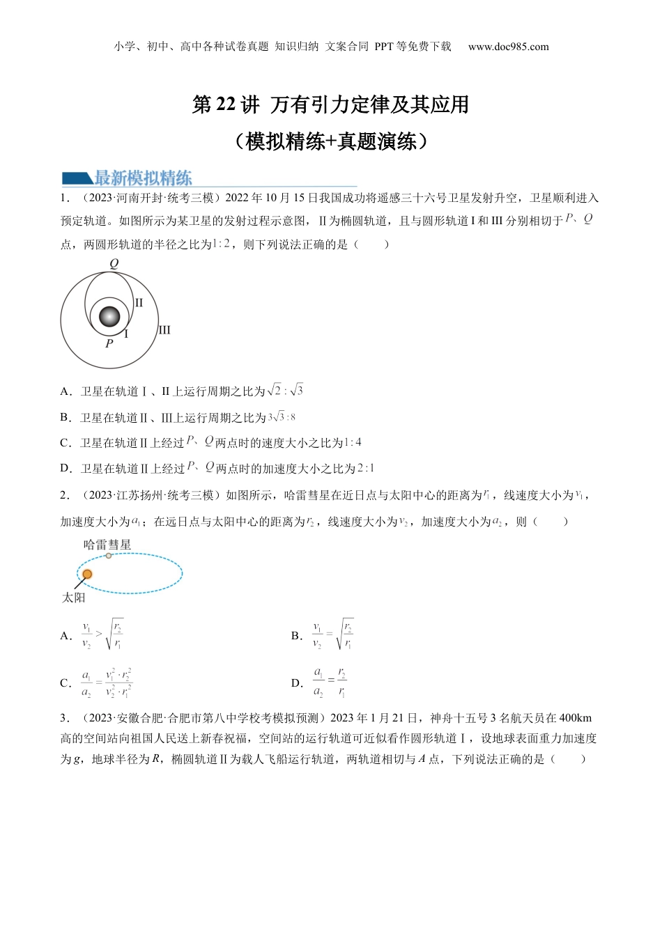 小学、初中、高中各种试卷真题知识归纳文案合同PPT等免费下载www.doc985.com第22讲万有引力定律及其应用(模拟精练+真题演练)1.(2023·河南开封·统考三模)2022年10月15日我国成功将遥感三十六号卫星发射升空,卫星顺利进入预定轨道。如图所示为某卫星的发射过程示意图,Ⅱ为椭圆轨道,且与圆形轨道I和III分别相切于点,两圆形轨道的半径之比为,则下列说法正确的是()A.卫星在轨道Ⅰ、II上运行周期之比为B.卫星在轨道Ⅱ、Ⅲ上运行周期之比为C.卫星在轨道Ⅱ上经过两点时的速度大小之比为D.卫星在轨道Ⅱ上经过两点时的加速度大小之比为2.(2023·江苏扬州·统考三模)如图所示,哈雷彗星在近日点与太阳中心的距离为,线速度大小为,加速度大小为;在远日点与太阳中心的距离为,线速度大小为,加速度大小为,则()A.B.C.D.3.(2023·安徽合肥·合肥市第八中学校考模拟预测)2023年1月21日,神舟十五号3名航天员在400km高的空间站向祖国人民送上新春祝福,空间站的运行轨道可近似看作圆形轨道Ⅰ,设地球表面重力加速度为g,地球半径为R,椭圆轨道Ⅱ为载人飞船运行轨道,两轨道相切与A点,下列说法正确的是()小学、初中、高中各种试卷真题知识归纳文案合同PPT等免费下载www.doc985.comA.在轨道I通过A点的速度大于在轨道Ⅱ通过B点的速度B.载人飞船在A点的加速度大于在B点的加速度C.空间站在轨道I上的速度小于D.载人飞船沿轨道I和轨道Ⅱ运行时,在相同时间内与地球连线扫过的面积相等4.(2023·重庆·校联考模拟预测)如图所示,从一质量为M、半径为2R的均匀球体的球心O处挖出一半径为R的小球,将其移至两球面相距R处,已知引力常量为G,则大球剩余部分和小球间的万有引力大小为()A.B.C.D.5.(2023·湖北襄阳·襄阳四中校考模拟预测)火星上是否存在液态水,一直是大众关注的焦点。2023年5月5日消息,基于“祝融号”火星车观测数据,我国科研人员首次发现“祝融号”着陆区的沙丘表面存在结壳、龟裂、团粒化、多边形脊、带状水痕等特征.假设火星为质量分布均匀的球体,已知火星质量是地球质量的a倍,火星半径是地球半径的b倍,火星表面的重力加速度为,地球表面的重力加速度为g,质量均匀的球壳对其内部物体的引力为零,则()A.小学、初中、高中各种试卷真题知识归纳文案合同PPT等免费下载www.doc985.comB.火星的第一宇宙速度是地球第一宇宙速度的倍C.火星表面正下方距表面的深度为火星半径处的M点的重力加速度为D.火星表面正上方距表面的高度为火星半径处的N点的重力加速度为6.(2023·湖南·模拟预测)北京时间2022年6月5日10时44分,搭载“神舟十四号”载人飞船的“长征二号”F遥十四运载火箭在酒泉卫星发射中心点火发射,约577s后,“神舟十四号”载人飞船与火箭成功分离,进入预定轨道,飞行乘组状态良好,发射取得圆满成功。北京时间2022年6月5日17时42分,“神舟十四号”成功对接“天和”核心舱径向端口,整个对接过程历时约7h。对接后组合体在距地面高为h的轨道上做匀速圆周运动,环绕的向心加速度为a,环绕的线速度为v,引力常量为G,则下列判断正确的是()A.组合体环绕的周期为B.地球的平均密度为C.地球的第一宇宙速度大小为D.地球表面的重力加速度大小为7.(2023·江西景德镇·统考三模)2023年春节,改编自刘慈欣科幻小说的《流浪地球2》电影在全国上映。电影中的太空电梯场景非常震撼。太空电梯的原理并不复杂,与生活的中的普通电梯十分相似。只需在地球同步轨道上建造一个空间站,并用某种足够长也足够结实的“绳索”将其与地面相连,当空间站围绕地球运转时,绳索会细紧,宇航员、乘客以及货物可以通过电梯轿厢一样的升降舱沿绳索直入太空,这样不需要依靠火箭、飞船这类复杂航天工具。如乙图所示,假设有一长度为的太空电梯连接地球赤道上的固定基地与同步空间站,相对地球静止,卫星与同步空间站的运行方向相同,此时二者距离最近,经过时间之后,第一次相距最远。已知地球半径,自转周期,下列说法正确的是()A.太空电梯各点均处于完全失重状态B.卫星的周期为C.太空电梯停在距地球表面高度为的站点,该站点处的重力加...