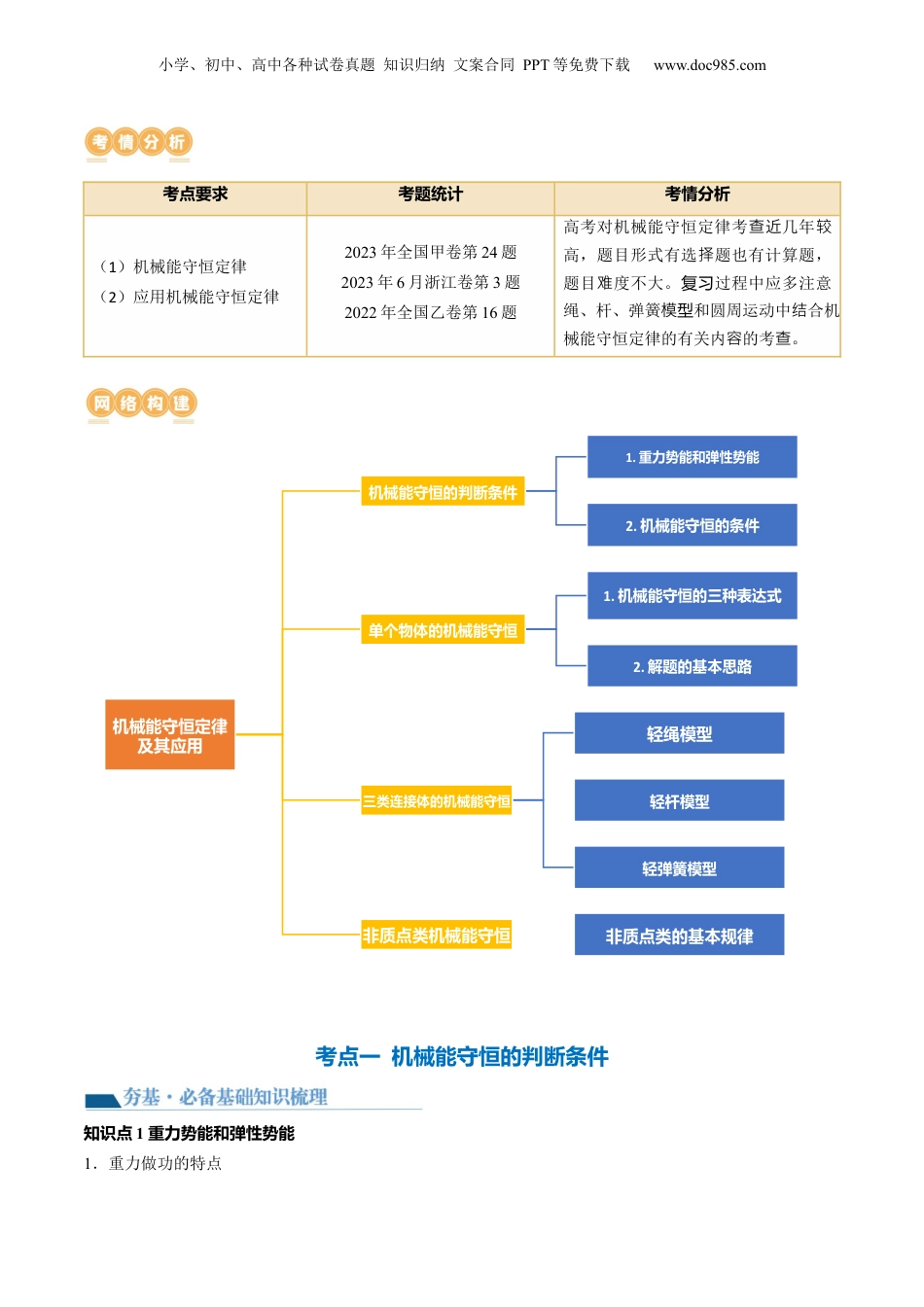 小学、初中、高中各种试卷真题知识归纳文案合同PPT等免费下载www.doc985.com第27讲机械能守恒定律及其应用目录复习目标网络构建考点一机械能守恒的判断条件【夯基·必备基础知识梳理】知识点1重力势能和弹性势能知识点2机械能守恒的判断条件【提升·必考题型归纳】考向判断物体和系统机械能守恒考点二单个物体的机械能守恒问题【夯基·必备基础知识梳理】知识点1机械能守恒的三种表达式知识点2应用机械能守恒定律解题的基本思路【提升·必考题型归纳】考向对单个物体的应用机械能守恒定律考点三三类连接体的机械能守恒问题【夯基·必备基础知识梳理】知识点1轻绳连接的物体系统基本规律知识点2轻杆连接的物体系统基本规律知识点3轻弹簧连接的物体系统基本规律【提升·必考题型归纳】考向1轻绳连接的物体系统考向2轻杆连接的物体系统考向3轻弹簧连接的物体系统考点四非质点类机械能守恒问题【夯基·必备基础知识梳理】知识点非质点类机械能守恒问题的规律【提升·必考题型归纳】考向1“液柱”类问题考向2“链条”类问题考向3“过山车”类问题真题感悟1、理解机械能守恒的条件。2、能够利用机械能守恒定律处理多物体多过程的机械能守恒问题。小学、初中、高中各种试卷真题知识归纳文案合同PPT等免费下载www.doc985.com考点要求考题统计考情分析(1)机械能守恒定律(2)应用机械能守恒定律2023年全国甲卷第24题2023年6月浙江卷第3题2022年全国乙卷第16题高考对机械能守恒定律考几年近查较高,题目形式有选题也有计算题,择题目度不大。过程中应多注意复习难绳、杆、弹簧和圆周运动中合机型模结械能守恒定律的有关内的考。容查考点一机械能守恒的判断条件知识点1重力势能和弹性势能1.重力做功的特点机械能守恒定律及其应用机械能守恒的判断条件1.重力势能和弹性势能2.机械能守恒的条件单个物体的机械能守恒1.机械能守恒的三种表达式2.解题的基本思路三类连接体的机械能守恒轻绳模型轻杆模型轻弹簧模型非质点类机械能守恒非质点类的基本规律小学、初中、高中各种试卷真题知识归纳文案合同PPT等免费下载www.doc985.com(1)重力做功与路径无关,只与始、末位置的高度差有关。(2)重力做功不引起物体机械能的变化。2.重力做功与重力势能变化的关系(1)定性关系:重力对物体做正功,重力势能就减小;重力对物体做负功,重力势能就增大。(2)定量关系:重力对物体做的功等于物体重力势能的减小量,即WG=-(Ep2-Ep1)=Ep1-Ep2=-ΔEp。(3)重力势能的变化量是绝对的,与参考面的选取无关。3.弹性势能(1)概念:物体由于发生弹性形变而具有的能。(2)大小:弹簧的弹性势能的大小与形变量及劲度系数有关,弹簧的形变量越大,劲度系数越大,弹簧的弹性势能越大。(3)弹力做功与弹性势能变化的关系:类似于重力做功与重力势能变化的关系,用公式表示:W=-ΔEp。知识点2机械能守恒的判断条件1.机械能:动能和势能统称为机械能,其中势能包括弹性势能和重力势能。2.机械能守恒定律:在只有重力或弹力做功的物体系统内,动能与势能可以相互转化,而总的机械能保持不变。3.对守恒条件理解的三个角度4.判断机械能守恒的三种方法考向判断物体和系统机械能守恒1.下列说法正确的是()A.做匀速直线运动的物体,机械能一定守恒B.做曲线运动的物体,机械能可能守恒C.物体所受的合力为零,机械能一定守恒D.物体所受的合力不为零时,机械能一定不守恒小学、初中、高中各种试卷真题知识归纳文案合同PPT等免费下载www.doc985.com【答案】B【详解】A.机械能守恒的条件是只有重力做功,如果物体竖直向上做匀速运动,向上的外力做正功,机械能增加,A错误;B.做平抛运动的物体,只有重力做功,机械能守恒,B正确;C.竖直方向的匀速运动,合外力为零,物体动能保持不变,而势能发生变化,机械能不守恒,C错误;D.做自由落体运动的物体,只有重力做功,机械能守恒,D错误。故选B。2.如图所示,下列关于机械能是否守恒的判断正确的是()A.甲图中,物体A将弹簧压缩的过程中,A机械能守恒B.乙图中,A置于光滑水平面,物体B沿光滑斜面下滑,物体B机械能守恒C.丙图中,不计任何阻力时A加速下落,B加速...