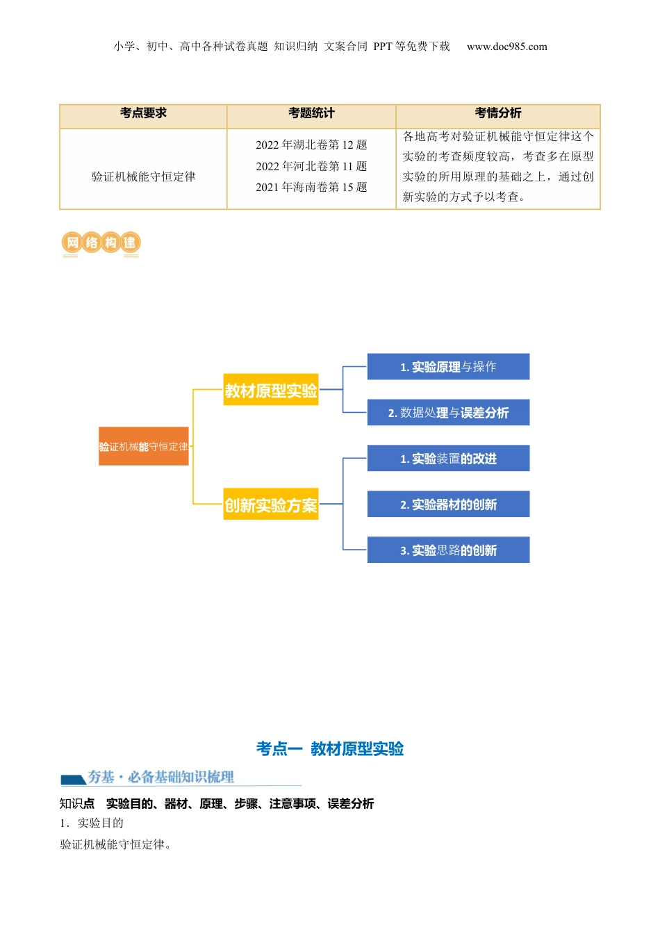 小学、初中、高中各种试卷真题知识归纳文案合同PPT等免费下载www.doc985.com第29讲验证机械能守恒定律目录复习目标网络构建考点一教材原型实验【夯基·必备基础知识梳理】知识点实验目的、器材、原理、步骤、注意事项、误差分析【提升·必考题型归纳】考向1实验原理与操作考向2数据处理与误差分析考点二创新实验方案【夯基·必备基础知识梳理】知识点实验方案的改进【提升·必考题型归纳】考向1实验原理的改进考向2实验器材的创新考向3实验思路的创新真题感悟1、掌握并会利用实验的原理验证机械能守恒定律,并会做出必要的误差分析。2、能够在原型实验基础上,通过对实验的改进或者创新,做出同类探究。小学、初中、高中各种试卷真题知识归纳文案合同PPT等免费下载www.doc985.com考点要求考题统计考情分析验证机械能守恒定律2022年湖北卷第12题2022年河北卷第11题2021年海南卷第15题各地高考对验证机械能守恒定律这个实验的考查频度较高,考查多在原型实验的所用原理的基础之上,通过创新实验的方式予以考查。考点一教材原型实验点知识实验目的、器材、原理、步骤、注意事项、误差分析1.实验目的验证机械能守恒定律。验能机械守恒定律证教材原型实验1.实验原理与操作2.理误差分析数据与处创新实验方案1.实验的改进装置2.实验器材的创新3.实验的创新思路小学、初中、高中各种试卷真题知识归纳文案合同PPT等免费下载www.doc985.com2.实验原理通过实验,求出做自由落体运动物体的重力势能的减少量和对应过程动能的增加量,在实验误差允许范围内,若二者相等,说明机械能守恒,从而验证机械能守恒定律。3.实验器材打点计时器、交流电源、纸带、复写纸、重物、刻度尺、铁架台(带铁夹)、导线。4.实验步骤(1)安装器材:将打点计时器固定在铁架台上,用导线将打点计时器与电源相连。(2)打纸带用手竖直提起纸带,使重物停靠在打点计时器下方附近,先接通电源,再松开纸带,让重物自由下落,打点计时器就在纸带上打出一系列的点,取下纸带,换上新的纸带重打几条(3~5条)。(3)选纸带:分两种情况说明若选第①1点O到下落到某一点的过程,即用mgh=mv2来验证,应选点迹清晰,且第1、2两点间距离接近2mm的纸带(电源频率为50Hz)。或者测量从第一点到其余各点的下落高度h,并计算各点速度的平方v2,然后以v2为纵轴,以h为横轴,根据实验数据作出v2-h图像。若在误差允许的范围内图像是一条过原点且斜率为g的直线,则验证了机械能守恒定律。用②mvB2-mvA2=mghAB验证时,由于重力势能的相对性,处理纸带时选择适当的点为基准点即可。5.实验结论在误差允许的范围内,自由落体运动过程机械能守恒。6.误差分析(1)测量误差:减小测量误差的方法,一是测下落距离时都从O点量起,一次将各打点对应下落高度测量完,二是多测几次取平均值。(2)系统误差:由于重物和纸带下落过程中要克服阻力做功,故动能的增加量ΔEk=mvn2必定稍小于重力势能的减少量ΔEp=mghn,改进办法是调整安装的器材,尽可能地减小阻力。7.注意事项(1)打点计时器要竖直:安装打点计时器时要竖直架稳,使其两限位孔在同一竖直线上,以减少摩擦阻力。(2)重物应选用质量大、体积小、密度大的材料。(3)应先接通电源,让打点计时器正常工作,后松开纸带让重物下落。(4)测长度,算速度:某时刻的瞬时速度的计算应用vn=,不能用vn=或vn=gt来计算。小学、初中、高中各种试卷真题知识归纳文案合同PPT等免费下载www.doc985.com考向1实验原理与操作1.利用如图所示装置做验证机械能守恒定律实验。已知打点计时器打点周期“”,重力加速度为。(1)甲同学实验时进行了如下操作,其中正确的是______(选填选项前的字母)。A.需使用天平测出重物的质量B.安装打点计时器尽量两个限位孔在同一竖直线上C.重复操作时尽量让重锤从同一位置开始下落D.测量纸带上某点到第一个点间的距离,利用计算点的速度(2)甲同学从打出的纸带中选出符合要求的一条纸带,如下图所示(其中一段纸带图中未画出)。图中O点为打出的起始点,且速度为零。选取在纸带上连续打出的点A、B、C、D、E、F作为计数点。测出C、D、E点距起始点O的距离分别为、、,由此可...