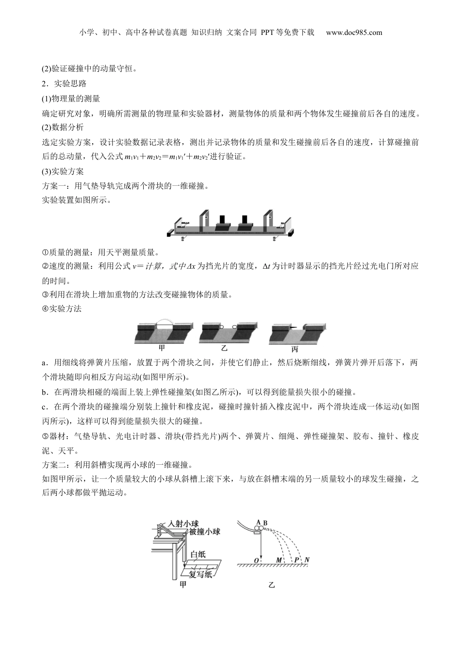 小学、初中、高中各种试卷真题知识归纳文案合同PPT等免费下载www.doc985.com第33讲验证动量守恒定律目录复习目标网络构建考点一教材原型实验【夯基·必备基础知识梳理】知识点实验目的、器材、原理、步骤、注意事项、误差分析【提升·必考题型归纳】考向1实验原理与操作考向2数据处理与误差分析考点二创新实验方案【夯基·必备基础知识梳理】知识点实验方案的改进【提升·必考题型归纳】考向1实验原理的改进考向2实验器材的创新考向3实验思路的创新真题感悟1、理解和掌握验证动量守恒定律实验原理,并会做出必要的误差分析。2、能够在原型实验基础上,通过对实验的改进或者创新,做出同类探究。小学、初中、高中各种试卷真题知识归纳文案合同PPT等免费下载www.doc985.com考点要求考题统计考情分析验证动量守恒定律2023年辽宁卷第11题2022年天津卷第9题2022年1月浙江卷第18题各地高考对验证动量守恒定律这个实验的考查近几年频度不是太高,考查多在原型实验的所用原理的基础之上,通过创新实验的方式予以考查。考点一教材原型实验点知识实验目的、器材、原理、步骤、注意事项、误差分析1.实验目的(1)掌握动量守恒的条件。验能机械守恒定律证教材原型实验1.实验原理与操作2.理误差分析数据与处创新实验方案1.实验的改进装置2.实验器材的创新3.实验的创新思路小学、初中、高中各种试卷真题知识归纳文案合同PPT等免费下载www.doc985.com(2)验证碰撞中的动量守恒。2.实验思路(1)物理量的测量确定研究对象,明确所需测量的物理量和实验器材,测量物体的质量和两个物体发生碰撞前后各自的速度。(2)数据分析选定实验方案,设计实验数据记录表格,测出并记录物体的质量和发生碰撞前后各自的速度,计算碰撞前后的总动量,代入公式m1v1+m2v2=m1v1′+m2v2′进行验证。(3)实验方案方案一:用气垫导轨完成两个滑块的一维碰撞。实验装置如图所示。质量的测量:用天平测量质量。①速度的测量:利用公式②v=计算,式中Δx为挡光片的宽度,Δt为计时器显示的挡光片经过光电门所对应的时间。利用在滑块上增加重物的方法改变碰撞物体的质量。③实验方法④a.用细线将弹簧片压缩,放置于两个滑块之间,并使它们静止,然后烧断细线,弹簧片弹开后落下,两个滑块随即向相反方向运动(如图甲所示)。b.在两滑块相碰的端面上装上弹性碰撞架(如图乙所示),可以得到能量损失很小的碰撞。c.在两个滑块的碰撞端分别装上撞针和橡皮泥,碰撞时撞针插入橡皮泥中,两个滑块连成一体运动(如图丙所示),这样可以得到能量损失很大的碰撞。器材:气垫导轨、光电计时器、滑块⑤(带挡光片)两个、弹簧片、细绳、弹性碰撞架、胶布、撞针、橡皮泥、天平。方案二:利用斜槽实现两小球的一维碰撞。如图甲所示,让一个质量较大的小球从斜槽上滚下来,与放在斜槽末端的另一质量较小的球发生碰撞,之后两小球都做平抛运动。小学、初中、高中各种试卷真题知识归纳文案合同PPT等免费下载www.doc985.com质量的测量:用天平测量质量。①速度的测量:由于两小球下落的高度相同,所以它们的飞行时间相等。如果用小球的飞行时间作时间单②位,那么小球飞出的水平距离在数值上就等于它的水平速度。因此,只需测出两小球的质量m1、m2和不放被碰小球时入射小球在空中飞出的水平距离s1,以及碰撞后入射小球与被碰小球在空中飞出的水平距离s1′和s2′。若在实验误差允许的范围内m1s1与m1s1′+m2s2′相等,就验证了两个小球碰撞前后的不变量。让小球从斜槽的不同高度处开始滚动,进行多次实验。③器材:斜槽、两个大小相等而质量不等的小球、铅垂线、白纸、复写纸、刻度尺、天平、圆规。④3.实验步骤不论采用哪种方案,实验过程均可按实验方案合理安排,参考步骤如下:(1)用天平测量相关碰撞物体的质量m1、m2,填入预先设计好的表格中。(2)安装实验装置。(3)使物体发生碰撞。(4)测量或读出碰撞前后相关的物理量,计算对应的速度,填入预先设计好的表格中。(5)改变碰撞条件,重复步骤(3)(4)。(6)进行数据处理,通过分析比较,验证动量守恒定律。(7)整理器材,结束实验。4.数据处理为了验证动量守恒定律,将实验中测得的物理量填入如下表...