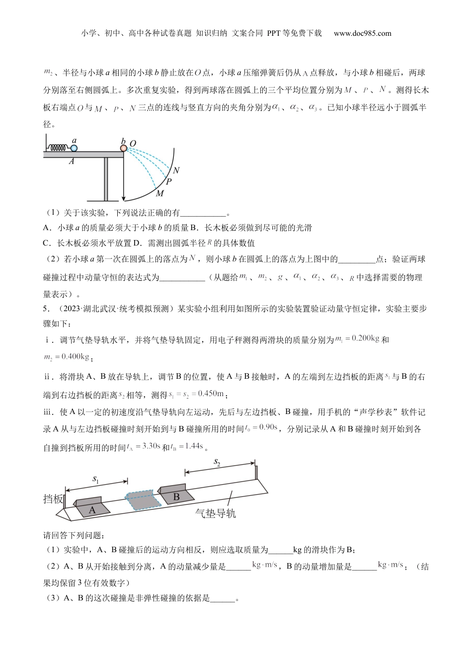 小学、初中、高中各种试卷真题知识归纳文案合同PPT等免费下载www.doc985.com第33讲验证动量守恒定律(模拟精练+真题演练)1.(2023·湖南衡阳·衡阳县第三中学校考模拟预测)如图,某同学用平抛运动演示仪验证碰撞中的动量守恒,实验的主要步骤如下:(1)将斜槽末端处的切线调成_______。(2)将O点处的小球b移开,将小球a从P点由静止释放,记录下小球a在水平面上的落点位置。(3)在O点处放上小球b,再将小球a从P点由静止释放,记录下两球落在水平面上的位置,在本次操作中,小球a的质量应_______(填“大于”“等于”或“小于”)小球b的质量。(4)测出各落点位置与水平面上A点(OA与水平面垂直)间的距离分别为AB=L1、AC=L2、AD=L3。(5)用天平测出小球a、b的质量分别为m1、m2,若满足m1L2=_______,则两小球碰撞时遵循动量守恒;若满足_______(用m1、m2表示),则两小球碰撞为弹性碰撞。2.(2023·云南·校联考一模)小赵同学用图所示的装置验证碰撞中的动量守恒。该同学使用频闪相机对碰撞前后小球运动情况进行拍摄。图中背景是放在竖直平面内的带方格的纸板,纸板平面与小球轨迹所在的平面平行,每个小方格的边长为,取,实验核心步骤如下:(1)让小球从挡板处静止释放,从斜槽末端水平抛出后频闪照片如图(b)中的A所示。(2)把小球静置于轨道末端,让小球从挡板处静止释放,两球在斜槽末端碰撞,碰后两小球从斜槽末端水平抛出后频闪照片分别如图(b)中的B、C所示。小学、初中、高中各种试卷真题知识归纳文案合同PPT等免费下载www.doc985.com(3)由图结合已知数据可计算出频闪相机闪光的周期__________s(结果保留2位有效数字)。(4)由图结合已知数据可计算出碰懂前小球的速度__________:碰撞后小球的速度__________(结果保留2位有效数字)。(5)若碰撞中动量守恒、则________。3.(2023·河南许昌·禹州市高级中学校考模拟预测)为了验证碰撞中的动量守恒和检验两个小球的碰撞是否为弹性碰撞,某同学选取了两个体积相同、质量不相等的小球,按下述步骤做了如下实验:①用天平测出两个小球的质量(分别为m1和m2)。②按照如图所示的那样,安装好实验装置。将斜槽AB固定在桌边,使槽的末端处的切线水平,将一斜面BC连接在斜槽末端。③先不放小球m2,让小球m1从斜槽顶端A处由静止开始滚下,记下小球的落点位置。④将小球m2放在斜槽末端边缘处,让小球m1从斜槽顶端A处由静止开始滚下,使它们发生碰撞,记下小球m1和m2在斜面上的落点位置。⑤用毫米刻度尺量出各个落点位置到斜槽末端点B的距离,图中D、E、F点是该同学记下的小球在斜面上的几个落点位置,到B点的距离分别为LD、LE、LF。(1)小球m1和m2需要m1___________m2;(填“大于”、“小于”或者“等于),发生碰撞后,m1的落点是图中的___________点。(2)实验中小球均落在斜面上,用测得的物理量来表示,只要满足以下关系式中的哪一项___________,则说明碰撞中动量守恒;只要再满足关系式___________,则说明两小球的碰撞是弹性碰撞。(将正确答案前面的选项填入适当的位置)A.B.C.D.4.(2023·河北沧州·统考一模)某高中物理兴趣小组设计了如图所示的装置来验证动量守恒定律。一长木板固定在水平桌面上,木板左端装有竖直挡板,轻弹簧的一端固定在竖直挡板上,长木板右端伸出桌面,右端点为。半径为的圆弧竖直放置在水平地面上,圆心为长木板右端点。缓慢推动质量为的小球a,将弹簧从原长位置压缩至点,释放后小球从木板右端点水平抛出,落至右侧圆弧上。再把质量为小学、初中、高中各种试卷真题知识归纳文案合同PPT等免费下载www.doc985.com、半径与小球a相同的小球b静止放在点,小球a压缩弹簧后仍从点释放,与小球b相碰后,两球分别落至右侧圆弧上。多次重复实验,得到两球落在圆弧上的三个平均位置分别为、、。测得长木板右端点与、、三点的连线与竖直方向的夹角分别为、、。已知小球半径远小于圆弧半径。(1)关于该实验,下列说法正确的有___________。A.小球a的质量必须大于小球b的质量B.长木板必须做到尽可能的光滑C.长木板必须水平放置D.需测出圆弧半径的具体数值(2)若小球a...