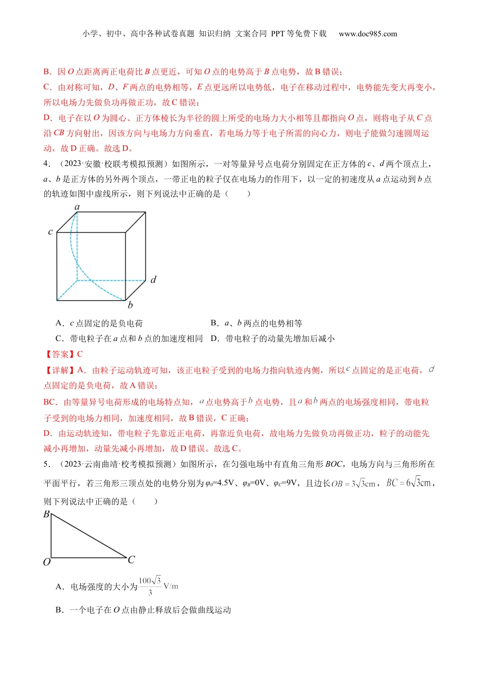 小学、初中、高中各种试卷真题知识归纳文案合同PPT等免费下载www.doc985.com第38讲静电能的性质(模拟精练+真题演练)1.(2023·海南省直辖县级单位·嘉积中学校考模拟预测)空间中P、Q两点处各固定一个点电荷,其中P为正电荷。P、Q两点附近电场的等势面分布如图所示,相邻等势面间电势差相等,a、b、c、d为电场中的4个点。下列说法正确的是()A.P、Q两点处的电荷带同种电荷B.c点与d点场强方向相同,电势也相同,a点电场强度小于b点电场强度C.一负电子从c点到b点电场力做正功D.负电子在a点电势能比在b点的电势能大【答案】B【详解】A.由等势面作出电场线,如图所示可知P、Q两点处的电荷带异种电荷,故A错误;B.根据点电荷场强决定式以及场强的叠加原理可知,c点与d点场强方向相同,因为c点与d点在同一等势面上,所以c点与d点电势也相同,又因b点等差等势面比a点密集,可知b点场强较大,即a点电场强度小于b点电场强度,故B正确;C.电场线从高电势面指向低电势面,所以c点电势高于b点电势,由可知,c点电势能低于b点电势能,所以一负电子从c点到b点电场力做负功,故C错误;D.因为a点电势高于b点电势,由可知电子在a点电势能比在b点的电势能小,故D错误。故选B。小学、初中、高中各种试卷真题知识归纳文案合同PPT等免费下载www.doc985.com2.(2023·海南省直辖县级单位·嘉积中学校考一模)电鳗是放电能力极强的淡水鱼类,具有“水中高压线”的称号。电鳗体内从头到尾都有一些类似小型电池的细胞,这些细胞就像许多叠在一起的叠层电池,这些电池(每个电池电压约0.15伏)串联起来后,在电鳗的头和尾之间就产生了很高的电压,此时在电鳗的头和尾的周围空间产生了类似于等量异种点电荷(O为连线的中点)的强电场。如图所示,虚线为该强电场的等势线分布,实线ABCD为以O点为中心的正方形,点A和D、点B和C分别在等势线上。则下列说法正确的是()A.电鳗的头部带正电B.A点与B点的电场强度相同C.B点与D点的电场强度相同D.负电荷沿正方形对角线从C点向A点运动过程中,电势能减小【答案】C【详解】A.根据等量异种点电荷的电场线由正极发出,终止于负极,沿电场线方向电势降低,电场线与等势线垂直,可知电鳗尾部带正电,故A错误;B.A点与B点关于中垂线左右对称,电场强度大小相等,方向不同,故B错误;C.B点与D点关于O点对称,B点与D点的电场强度相同,故C正确;D.负电荷从C点沿对角线运动到A点过程中,电场力做负功,电势能增大,故D错误。故选C。3.(2023·河北张家口·统考三模)如图所示,真空中两个等量同种正点电荷分别放置在P、Q两点,PQ连线的中点为O,以QO为棱构成一个空间正方体,A、B、C、D、E、F为该正方体上六个顶点。下列说法正确的是()A.A、C两点的电场强度相同B.O、B两点的电势相等C.将电子沿棱自D—E—F移动过程中,电场力先做正功再做负功D.将电子自C点沿CB方向射出,电子可能做匀速圆周运动【答案】D【详解】A.由对称可知,A、C两点的电场强度大小相等,方向不同,故A错误;小学、初中、高中各种试卷真题知识归纳文案合同PPT等免费下载www.doc985.comB.因O点距离两正电荷比B点更近,可知O点的电势高于B点电势,故B错误;C.由对称可知,D、F两点的电势相等,E点更远所以电势低,电子在移动过程中,电势能先变大再变小,所以电场力先做负功再做正功,故C错误;D.电子在以O为圆心、正方体棱长为半径的圆上所受的电场力大小相等且都指向O点,则将电子从C点沿CB方向射出,因该方向与电场力方向垂直,若电场力等于电子所需的向心力,则电子能做匀速圆周运动,故D正确。故选D。4.(2023·安徽·校联考模拟预测)如图所示,一对等量异号点电荷分别固定在正方体的c、d两个顶点上,a、b是正方体的另外两个顶点,一带正电的粒子仅在电场力的作用下,以一定的初速度从a点运动到b点的轨迹如图中虚线所示,则下列说法中正确的是()A.c点固定的是负电荷B.a、b两点的电势相等C.带电粒子在a点和b点的加速度相同D.带电粒子的动量先增加后减小【答案】C【详解】A.由粒子运动轨迹可知,该正电粒子受到的电场力指向轨迹内侧,所以点固定的是正电荷,点固定...