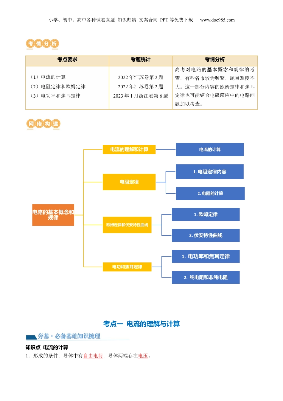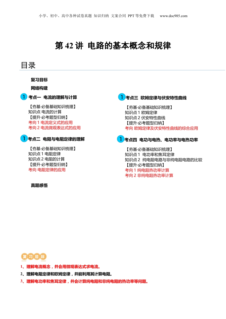 小学、初中、高中各种试卷真题知识归纳文案合同PPT等免费下载www.doc985.com第42讲电路的基本概念和规律目录复习目标网络构建考点一电流的理解与计算【夯基·必备基础知识梳理】知识点电流的计算【提升·必考题型归纳】考向1电流定义式的应用考向2电流微观表达式的应用考点二电阻与电阻定律的理解【夯基·必备基础知识梳理】知识点1电阻定律知识点2电阻的计算【提升·必考题型归纳】考向电阻定律的应用考点三欧姆定律与伏安特性曲线【夯基·必备基础知识梳理】知识点1欧姆定律知识点2伏安特性曲线【提升·必考题型归纳】考向欧姆定律及伏安特性曲线的综合应用考点四电功与电热、电功率与电热功率【夯基·必备基础知识梳理】知识点1电功率和焦耳定律知识点2纯电阻电路与非纯电阻电路的比较【提升·必考题型归纳】考向1纯电阻热功率计算考向2非纯电阻热功率计算真题感悟1、理解电流概念,并会用微观表达式求电流。2、理解电阻定律和欧姆定律,并能利用其计算电阻。3、理解电功率和焦耳定律,并会计算纯电阻和非纯电阻的热功率等问题。小学、初中、高中各种试卷真题知识归纳文案合同PPT等免费下载www.doc985.com考点要求考题统计考情分析(1)电流的计算(2)电阻定律和欧姆定律(3)电功率和焦耳定律2022年江苏卷第2题2022年江苏卷第2题2023年1月浙江卷第6题高考对电路的本和规律的考基概念,有省市较为,题度不查些频繁目难大。这一部分内容的欧姆定律和焦耳定律也可能合电磁应中的电路结感问题加以考。查考点一电流的理解与计算知识点电流的计算1.形成的条件:导体中有自由电荷;导体两端存在电压。电路的基本概念和规律电流的理解和计算电流的计算电阻定律1.电阻定律内容2.电阻的计算欧姆定律和伏安特性曲线1.欧姆定律2.伏安特性曲线电功和焦耳定律1.电功率和焦耳定律2.纯电阻和非纯电阻小学、初中、高中各种试卷真题知识归纳文案合同PPT等免费下载www.doc985.com2.电流是标量:正电荷定向移动的方向规定为电流的方向。3.电流的计算公式公式含义定义式I=反映了I的大小,但不能说I∝q,I∝微观式I=nqSv从微观上看n、q、S、v决定了I的大小决定式I=I由U、R决定,I∝UI∝注意:电解液导电异种电荷反向通过某截面,q=|q1|+|q2|电子绕核旋转等效电流I=eT,T为周期,kQqr2=m4π2T2r考向1电流定义式的应用1.自动体外除颤器是一种便携式的医疗设备,它可以诊断特定的心律失常,并且给予电击除颤,是可被非专业人员使用的用于抢救心脏骤停患者的医疗设备。某型号自动体外除颤器的电容器电容是16μF,充电至4kV电压,电容器在4ms时间内完成放电,下列说法正确的()A.电容器放电完成后电容为零B.电容器的击穿电压为4kVC.电容器充电后的电荷量为0.64CD.电容器放电过程中平均电流为16A【答案】D【详解】A.电容是表征电容器储存电荷本领大小的物理量,放电之后,电容器的电容大小是不变的,故A错误;B.该电容器电压可充电到4.0kV,必然小于击穿电压,故B错误;C.根据Q=CU=16×10-6×4.0×103C=0.064C可知放电前,电容器储存的电量为0.064C,故C错误;Fv小学、初中、高中各种试卷真题知识归纳文案合同PPT等免费下载www.doc985.comD.根据可知该次放电平均电流为16A,故D正确。故选D。2.如图所示的电解池接入电路后,在t秒内有n1个一价正离子通过溶液内某截面S,有n2个一价负离子通过溶液内某截面S,设e为元电荷,以下说法正确的是()A.当n1=n2时,电流为零B.当n1>n2时,电流方向从A→B,电流为C.当n1<n2时,电流方向从B→A,电流为D.无论n1、n2大小如何,电流方向都从A→B,电流都为【答案】D【详解】由题意可知,流过容器截面上的电量q=(n1+n2)e则电流为方向与正电荷的定向移动方向相同,故由A到B。故选D。考向2电流微观表达式的应用3.如图所示,来自质子源的质子(初速度为零),经加速电压为U的加速器加速后,形成细柱形的质子流。已知细柱形的质子流横截面积为S,其等效电流为I;质子的质量为m,其电荷量为e。那么这束质子流内单位体积的质子数n是()A.B.C.D.【答案】D【详解】经加速电压为U的加速器加速后,有eU=mv2根据电流的定义公式则有I=这束质子流内单位小...